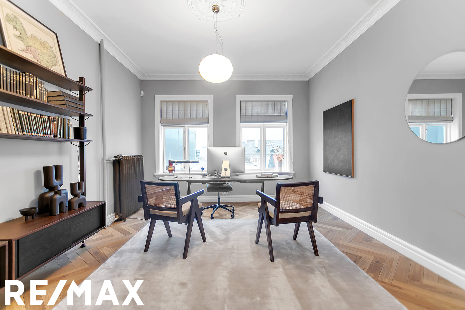 Þrjár samliggjandi stofur, eða tvö rúmgóð skrifstofurými með sameiginlega stofu á þar á milli með kamínu og bogadregnum gluggum. Hægt er að loka báðum skrifstofurýmum með tvöföldum hurðum með gleri á milli. Parket gólfum. Útgengi er út á svalir frá öðru skrifstofurýminu.