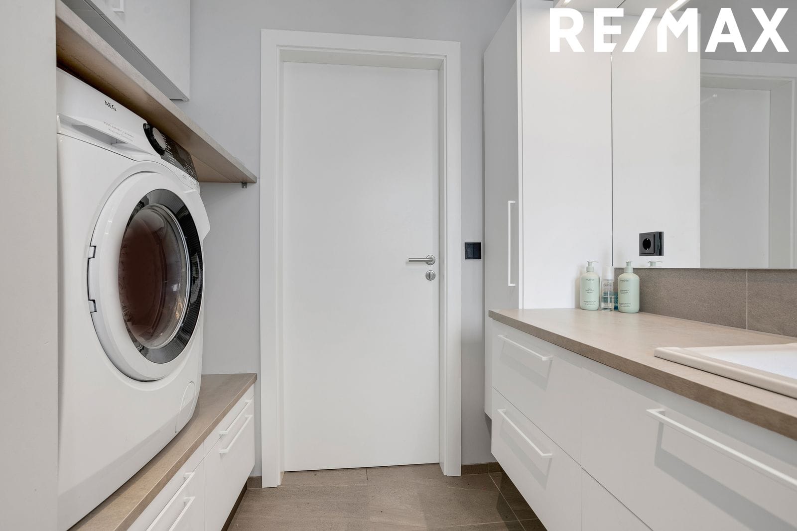 Baðherbergi: Flísar á gólfi og veggjum að mestu, góð innrétting undir handlaug, stór spegill og góð lýsing, handklæðaofn, sturta með hertu glerskilrúmi, upphengt salerni, innrétting fyrir þvottavél og þurrkara.