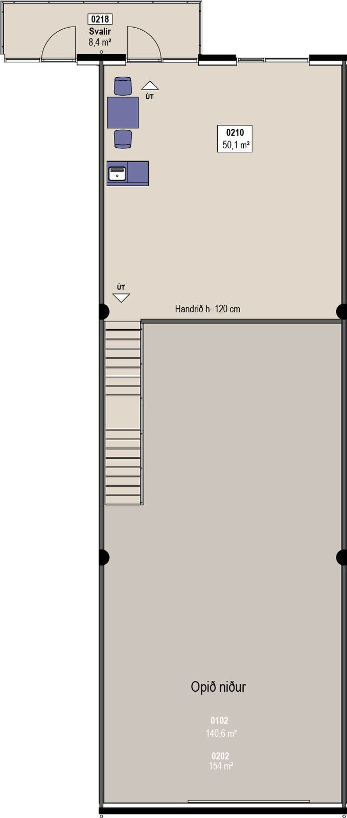 Lofthæð neðri hæðar: 5,72 m og 2,92 m