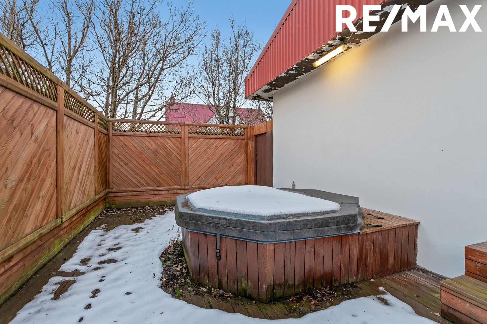 Nánari lýsing: Forstofa er flísalögð með fataskáp. Stofa er björt og rúmgóð og þaðan er útgengt út á timburverönd. Borðstofa er samliggjandi við stofu og þaðan er útgengt út á timbur pall baka til við húsið. Eldhús er með ágætri ljósri innréttingu. Svefnherbergi er með fataskáp og parket á gólfi. Baðherbergi er allt nýgegnum tekið, flísalagt og með sturtuklefa. Hátt er til lofts í allri íbúðinni og lýsing er góð. Timburverönd snýr í suð-vestur og er með heitum potti. Bílskúr: Búið er að innrétta aukaíbúð í bílskúr, með sérinngangi, sem samanstendur af forstofu, herbergi, baðherbergi með sturtu og aðstöðu fyrir þvottavél, eldhúsi og sjónvarpsrými. Útgengt er út á timburpall baka til við húsið.