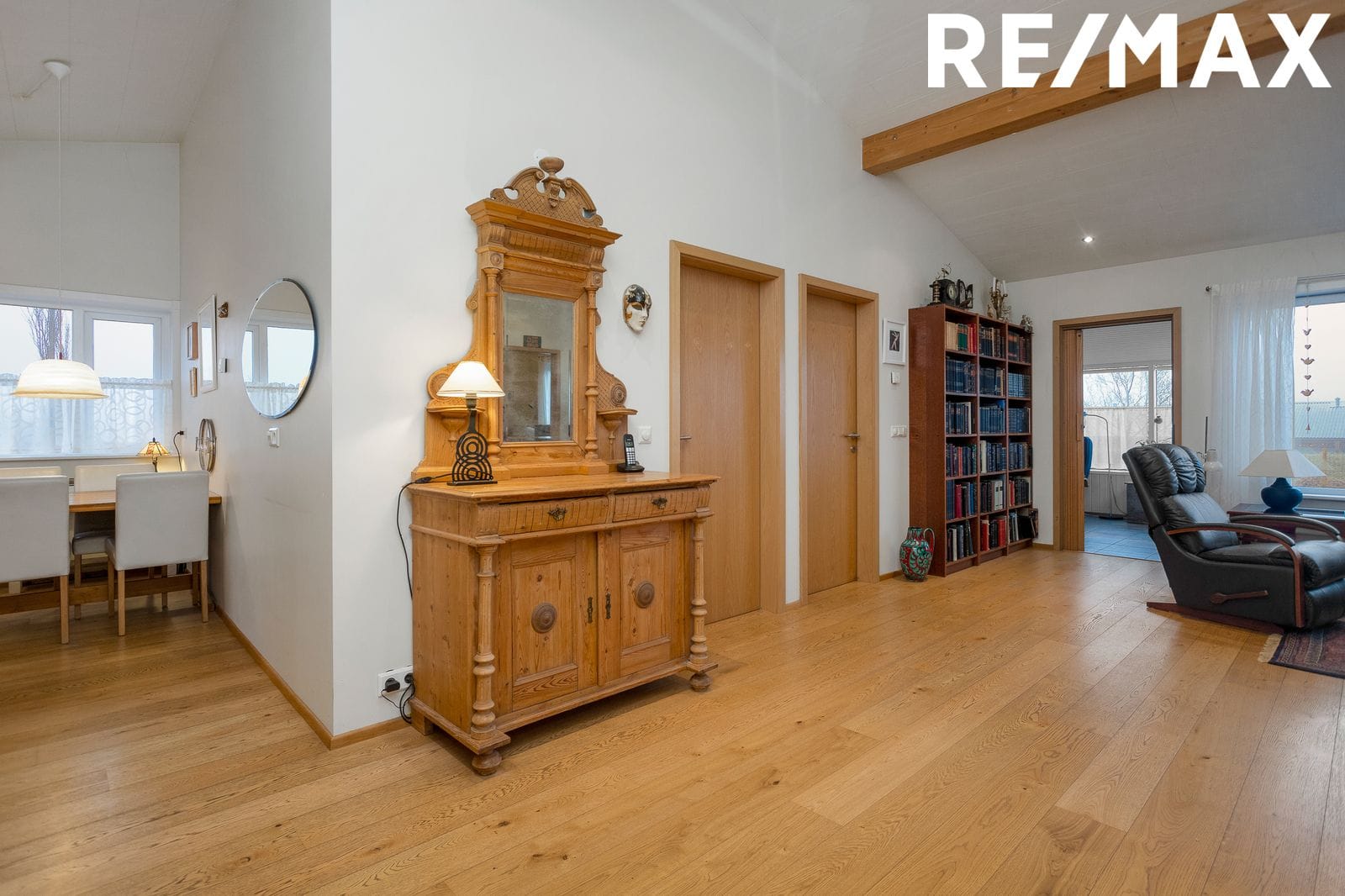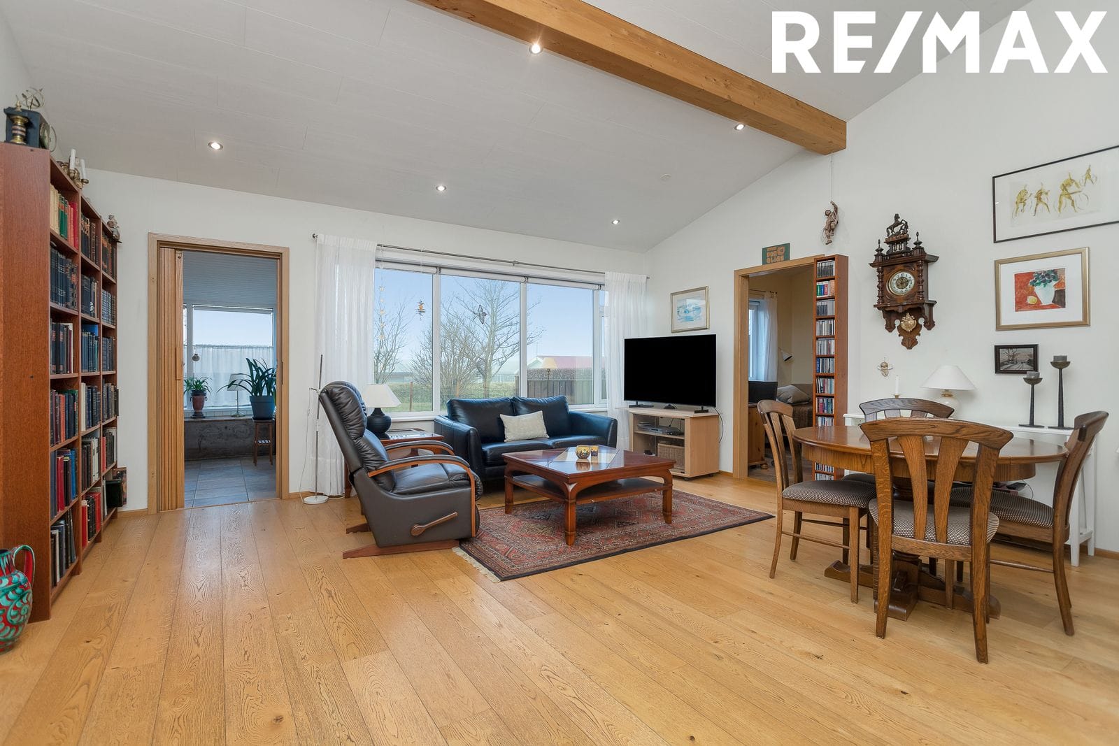 Alrými: (Borðstofa + setustofa) í miðju hússins er rúmgott alrými sem rúmar setustofu og borðstofu og góðum glugga sem snýr í suður. Alrýmið er miðja eignarinnar og leiðir inn í öll önnur rými hennar. Eikarplankaparket er á gólfi.