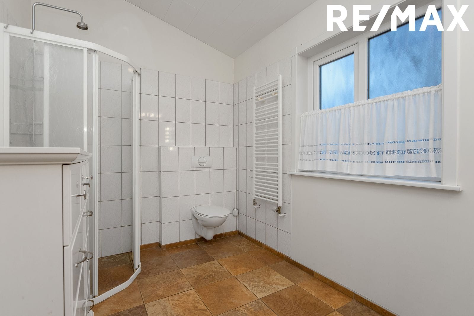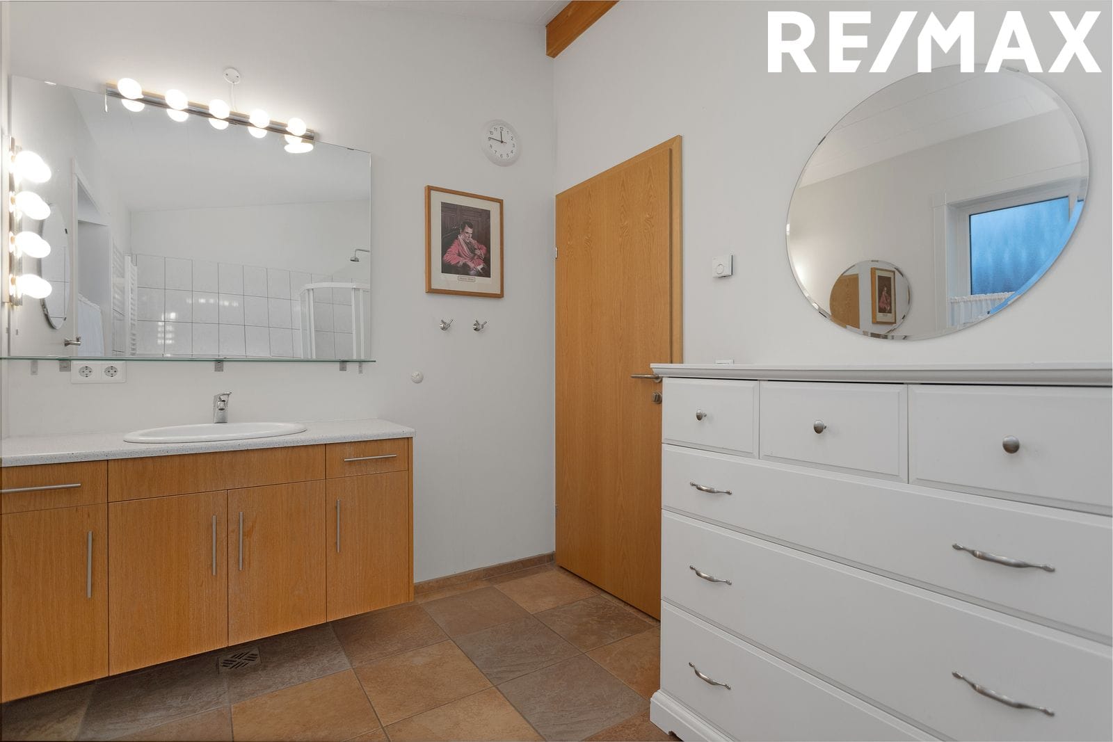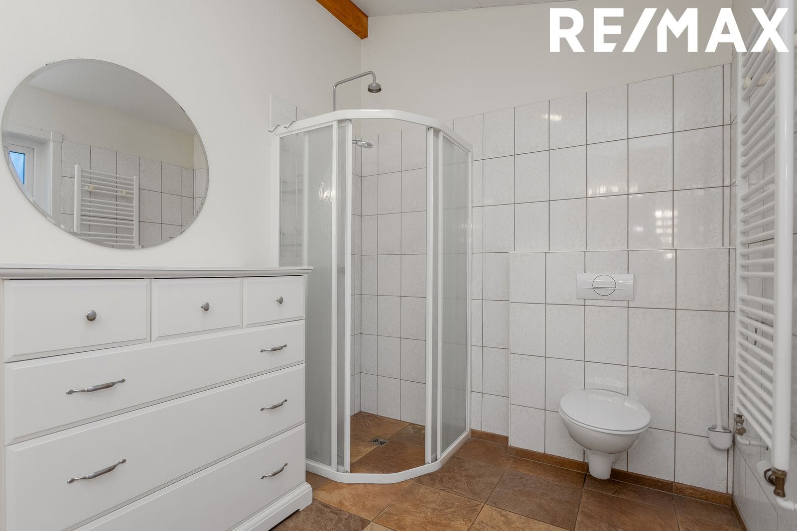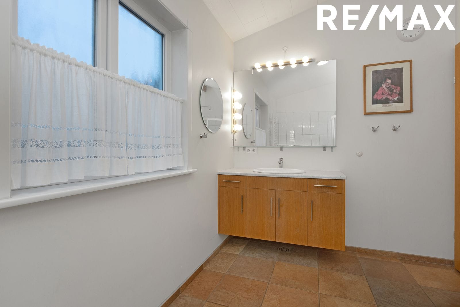Baðherbergi: Baðherbergið er rúmgott með góðum glugga. Flísar eru á gólfum og á veggjum hjá votrýmum. Sturtuklefi er beint á gólf. Eikarinnrétting er við vask og undir spegli. Handklæðaofn er á vegg á móti sturtunni.