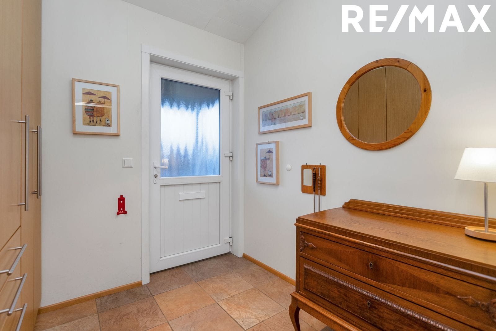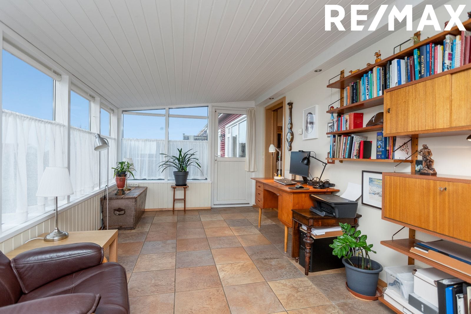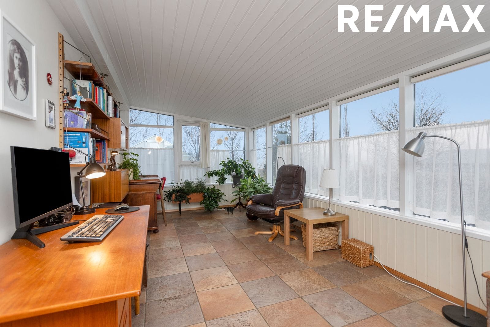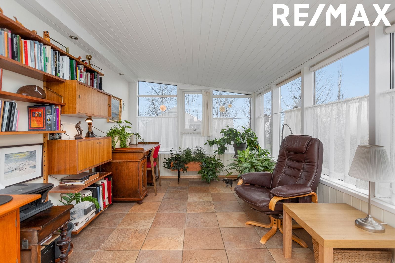 Sólstofa: Inn af stofunni er gengið inn í sólstofu með flísum á gólfi og gluggum á þrjá vegu. Gengið er út frá sólstofunni út á veröndina og út í garðinn.
