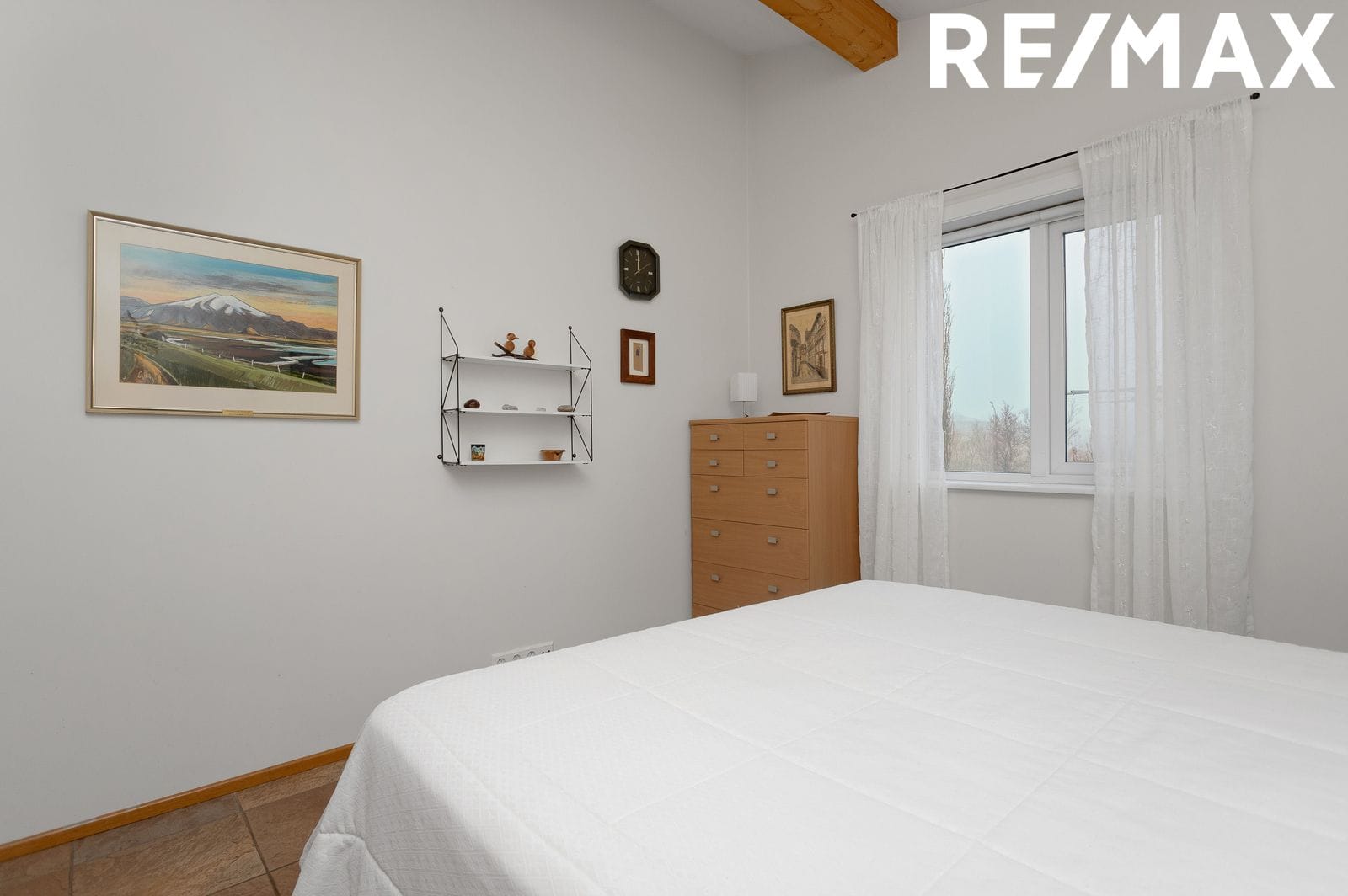3 x svefnherbergi: Hjónaherbergið er með flísum á gólfi og góðum fjórföldum fataskáp. Barnaherbergin eru tvö, annað er með plankaparketi á gólfi og fataskáp. Hitt barnaherbergið er með flísum á gólfi.