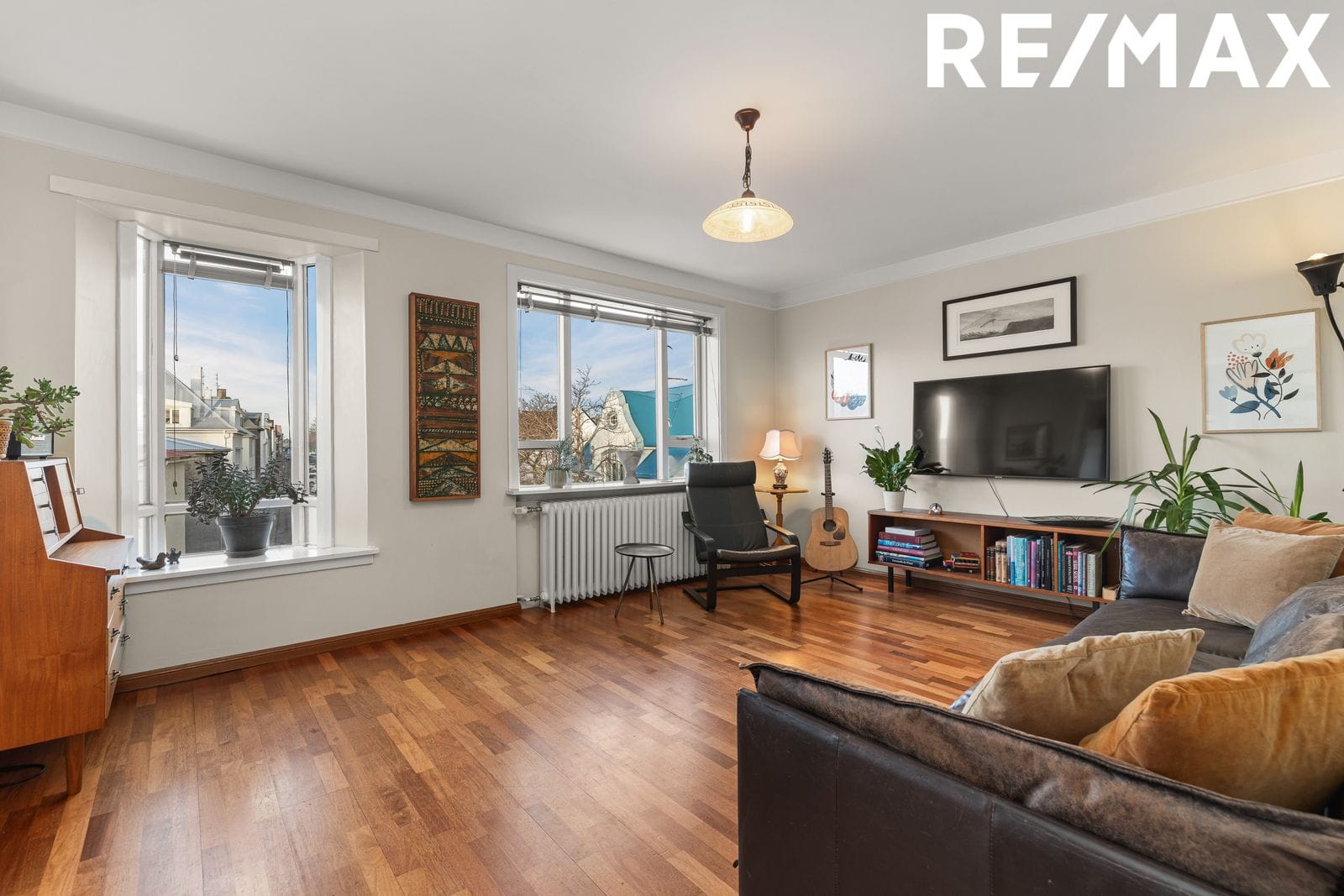 Stofa er björt með útsýni upp Bárugötuna og yfir að Landakotskirkju. Sjarmerandi útskot í einum glugga. Parket á gólfi stofu.