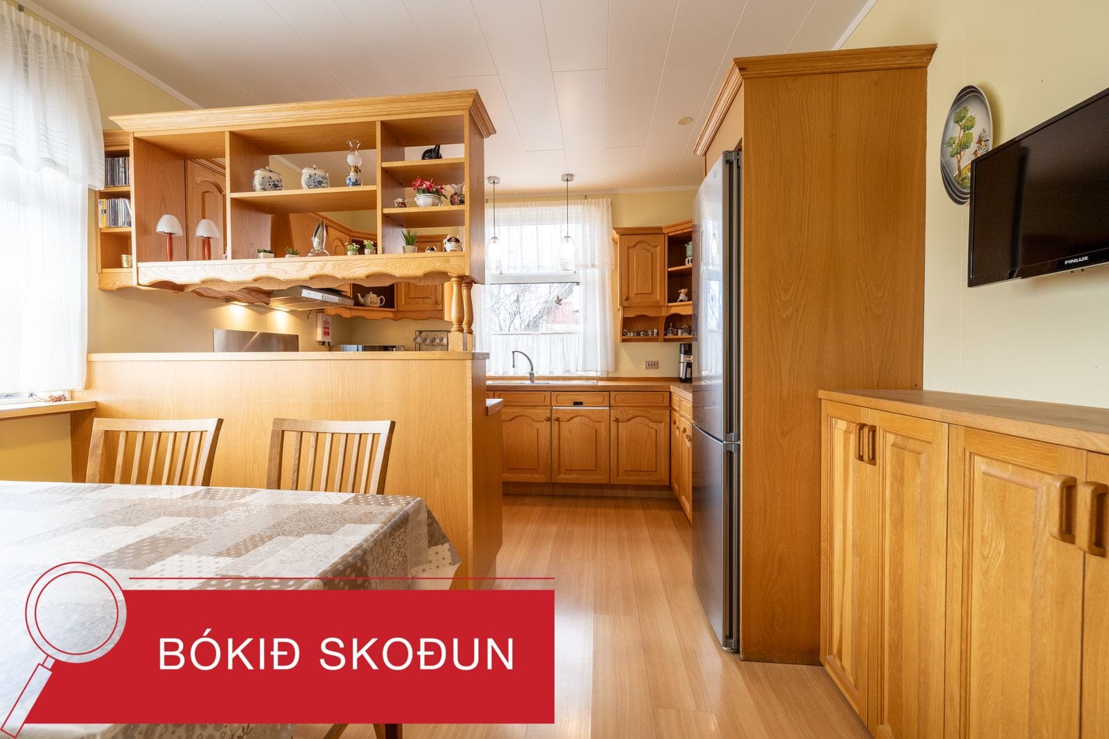 Eldhús: Eldri innrétting, gott skápa og vinnupláss, borðkrókur, harðparket á gólfi, úr eldhúsi er gengið út á verönd.