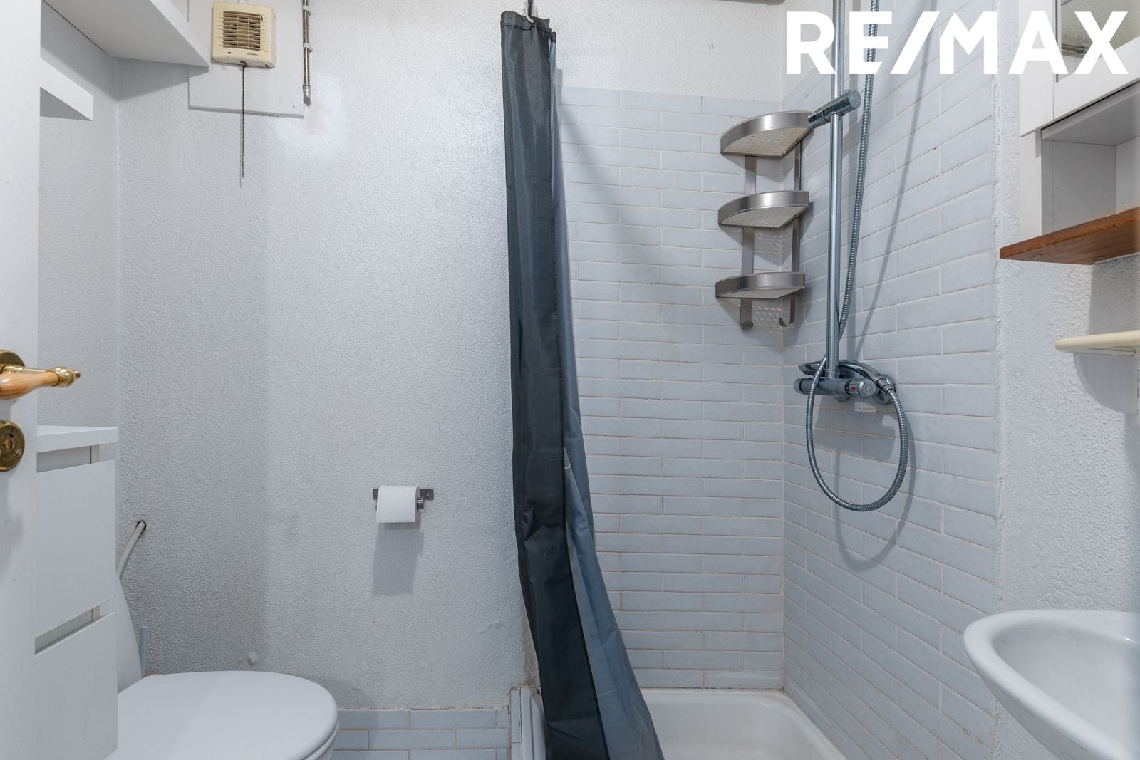 Baðherbergi: Flísar á gólfi. Sturta og salerni og handlaug. Ekki er gluggi en vifta er í rýminu.