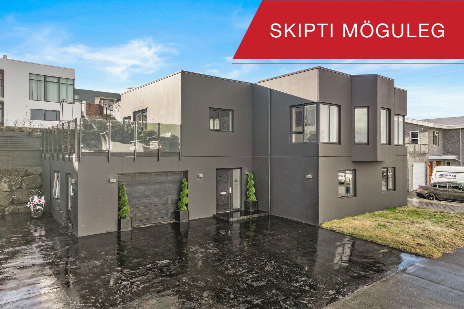 Húsið er bjart, rúmgott og innréttað með fallegum efnum, þar sem granítflísar prýða nær öll gólf rýma. Eignin býður upp á rúmgóð svefnherbergi, fallegt og nútímalegt eldhús, stílhreint baðherbergi og skemmtilegu alrými með einstöku útsýni.