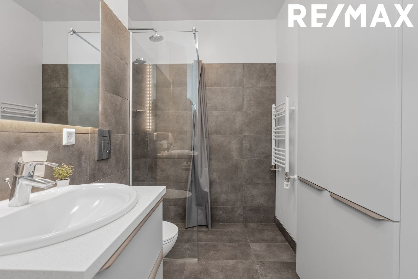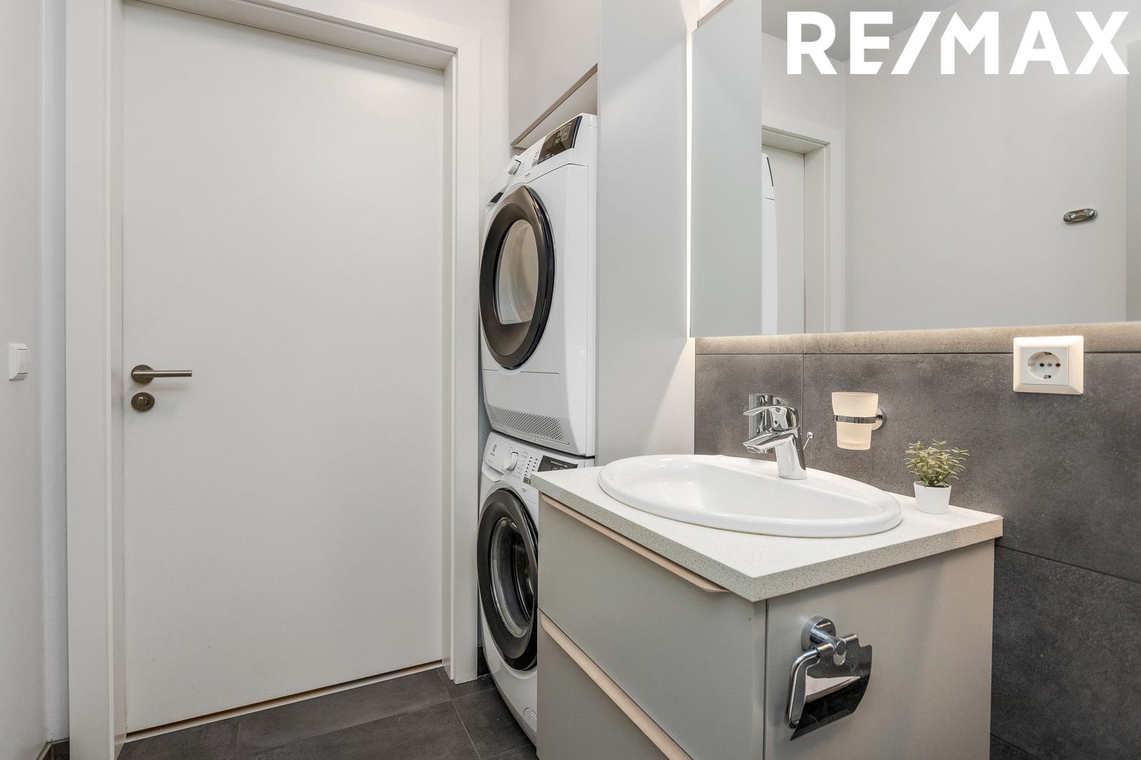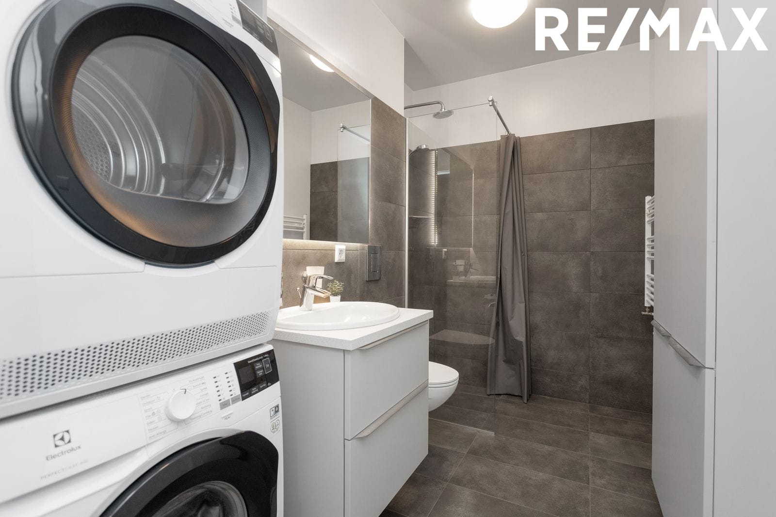 Baðherbergi, flísalagt í hólf og gólf með innréttingu, upphengdu salerni og walk-in sturtu, tengi fyrir þvottavél á baðherbergi.