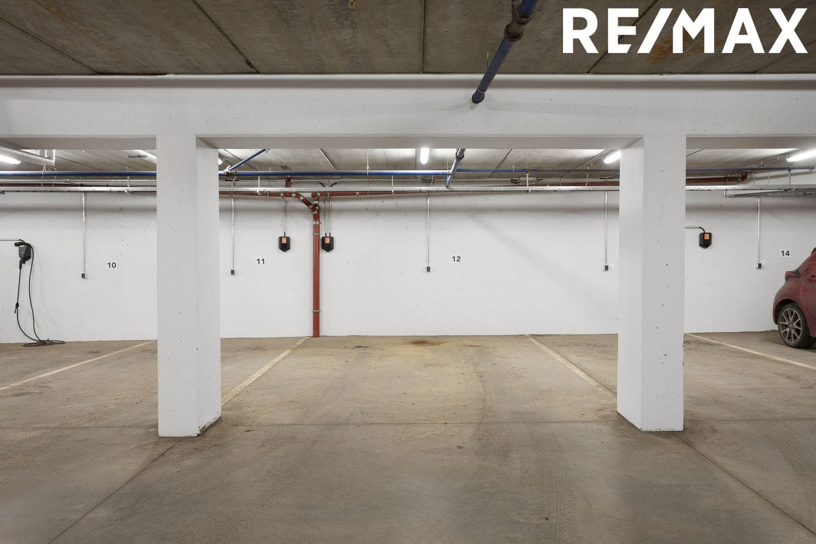 Bílastæði í bílageymslu með hleðslustöð.