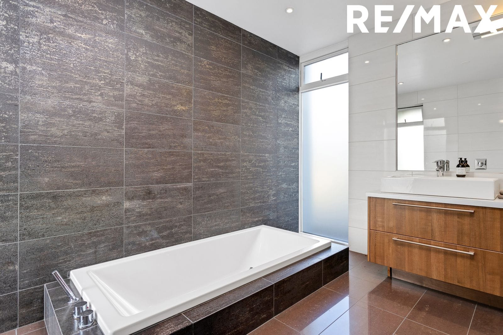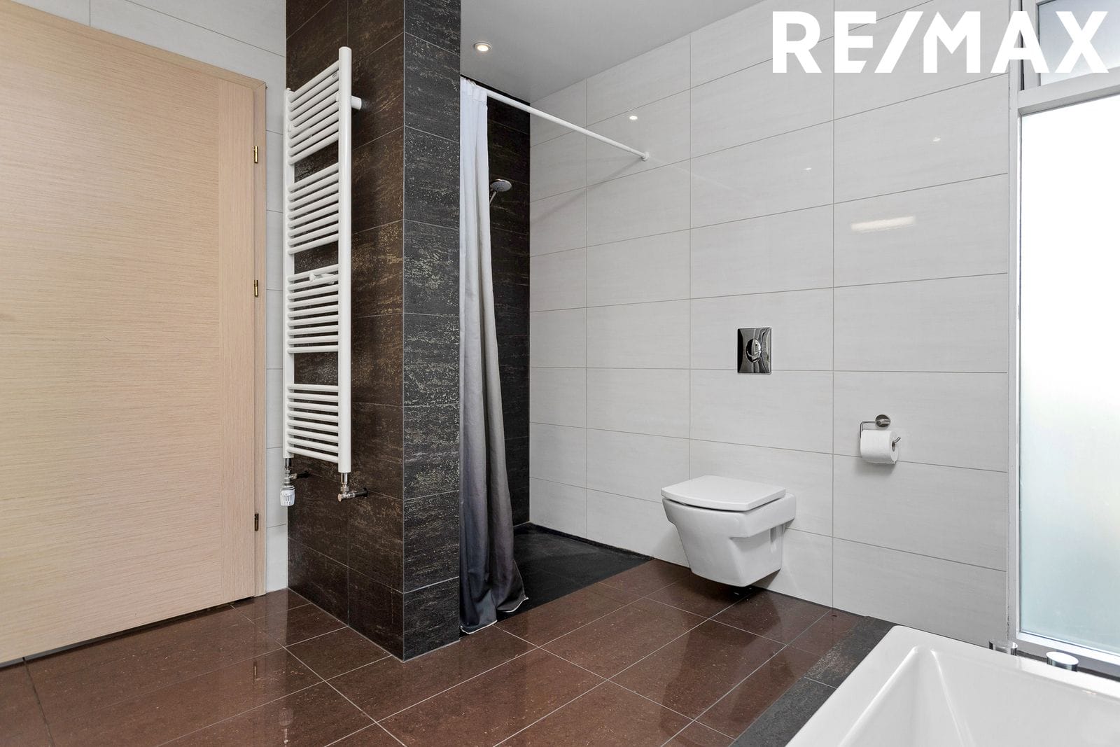 Baðherbergið er glæsilegt, flísalagt í hólf og gólf með sturtu, baðkari, fallegri innréttingu og innbyggðu salerni.