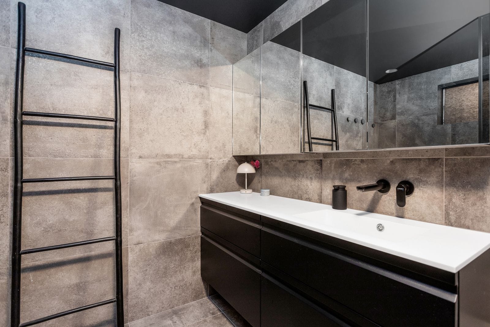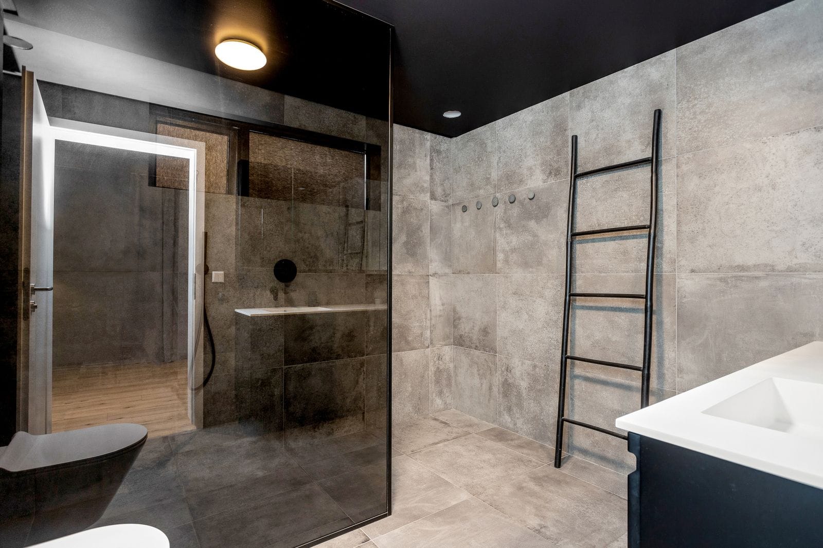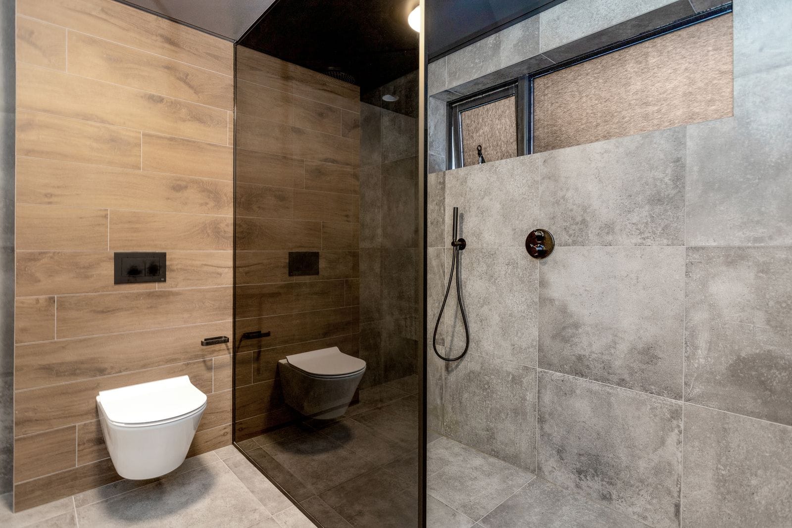 Aðalbaðherbergi: Baðherbergið er glæsilegt og nýlega endurnýjað. Fallegar dökk gráar 60 x 60 cm flísar eru á gólfi og á veggjum fyrir utan vegg við salerni sem er flísalagður með flísum í viðar útliti. Stór sturta beint á gólf er innst í rýminu við opnanlegan glugga, skyggt gler er við sturtuna og blöndunartæki eru innbyggð. Góð innrétting er undir vaski með hvítri steinborðplötu. Fyrir ofan vaskaborðið er fjórfaldur speglaskápur á vegg. Snagar fyrir handklæði eru á vegg á móti sturtunni og búið er að leggja hitalagnir í vegginn og því nýtast snagarnir á sama hátt og handklæðaofn.