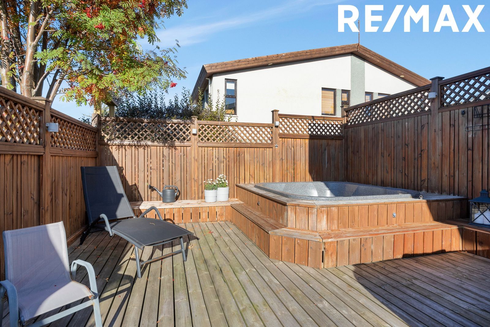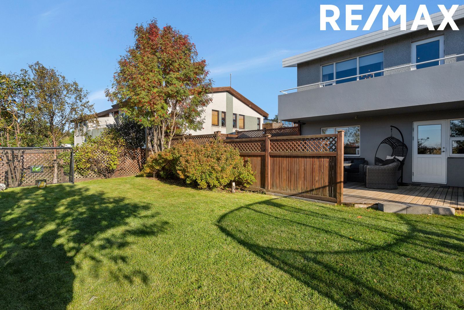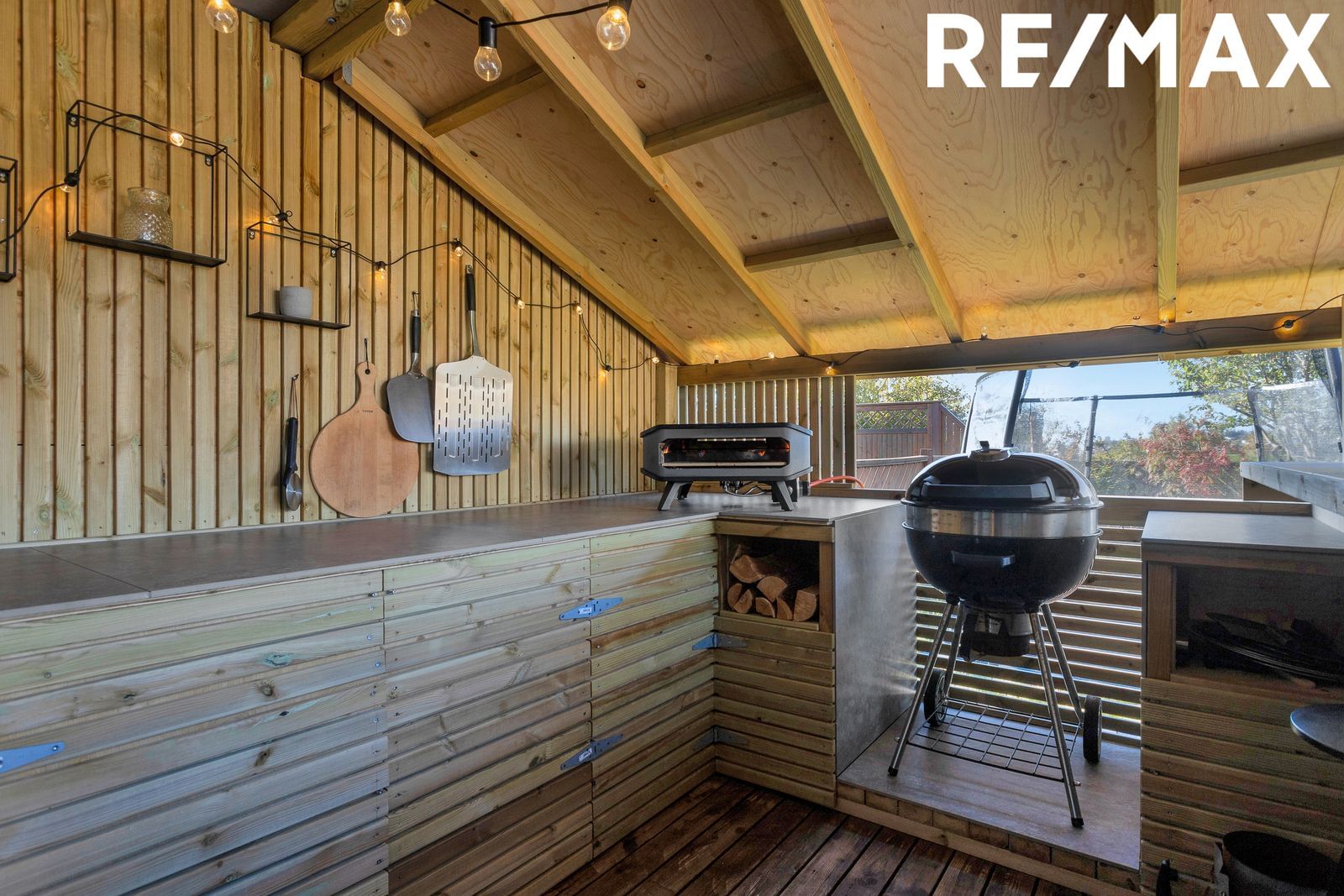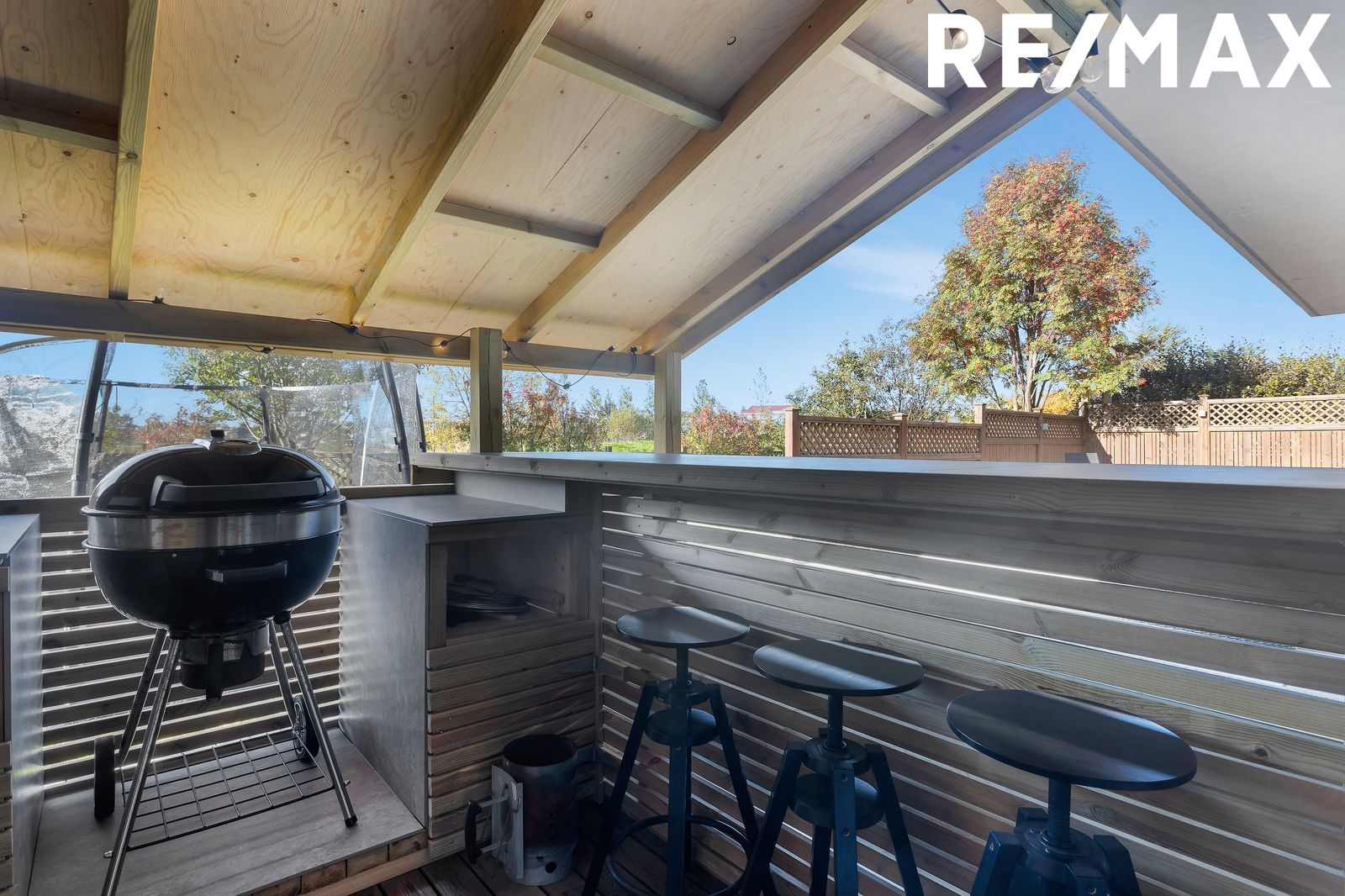 Garður: Hægt er að ganga að garðinum á tvo vegu, bæði frá neðri hæð hússins og einnig gengið niður með hægri hlið eignarinnar. Veröndin er stór með heitum potti , stóru setusvæði og glæsilegu stóru útieldhúsi með lokuðu þaki og því hægt að nýta allt árið. Fyrir framan veröndina eru grasþökur, falleg tré, niðurgrafið trampolín og timburgirðing sem lokar af garðinn. Við hlið hússins er góður geymsluskúr.