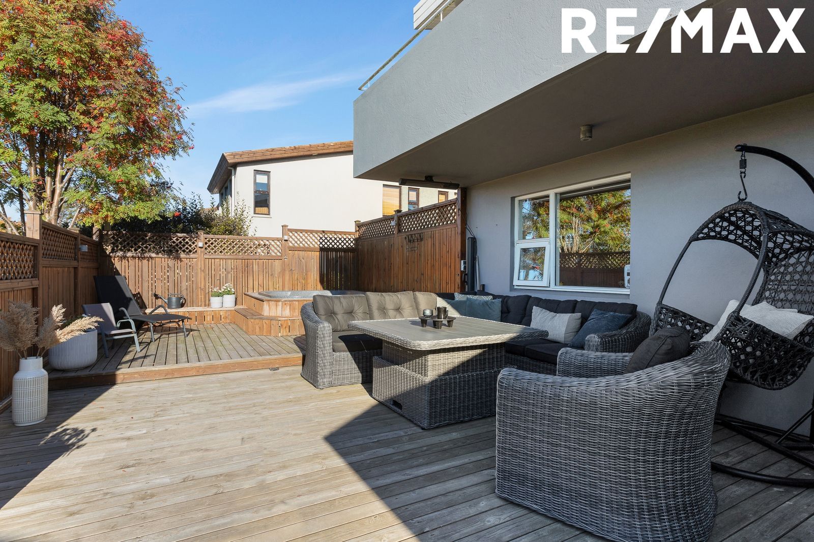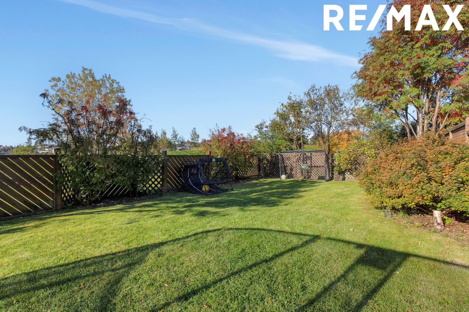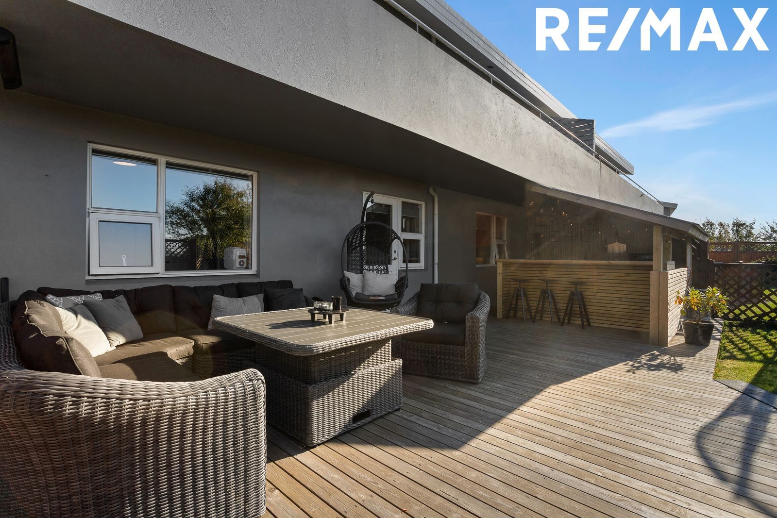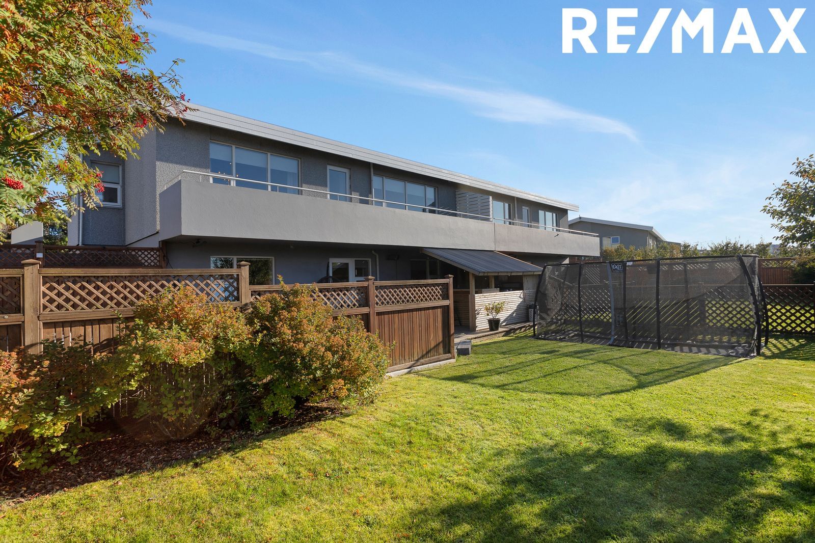 Garður: Hægt er að ganga að garðinum á tvo vegu, bæði frá neðri hæð hússins og einnig gengið niður með hægri hlið eignarinnar. Veröndin er stór með heitum potti , stóru setusvæði og glæsilegu stóru útieldhúsi með lokuðu þaki og því hægt að nýta allt árið. Fyrir framan veröndina eru grasþökur, falleg tré, niðurgrafið trampolín og timburgirðing sem lokar af garðinn. Við hlið hússins er góður geymsluskúr.