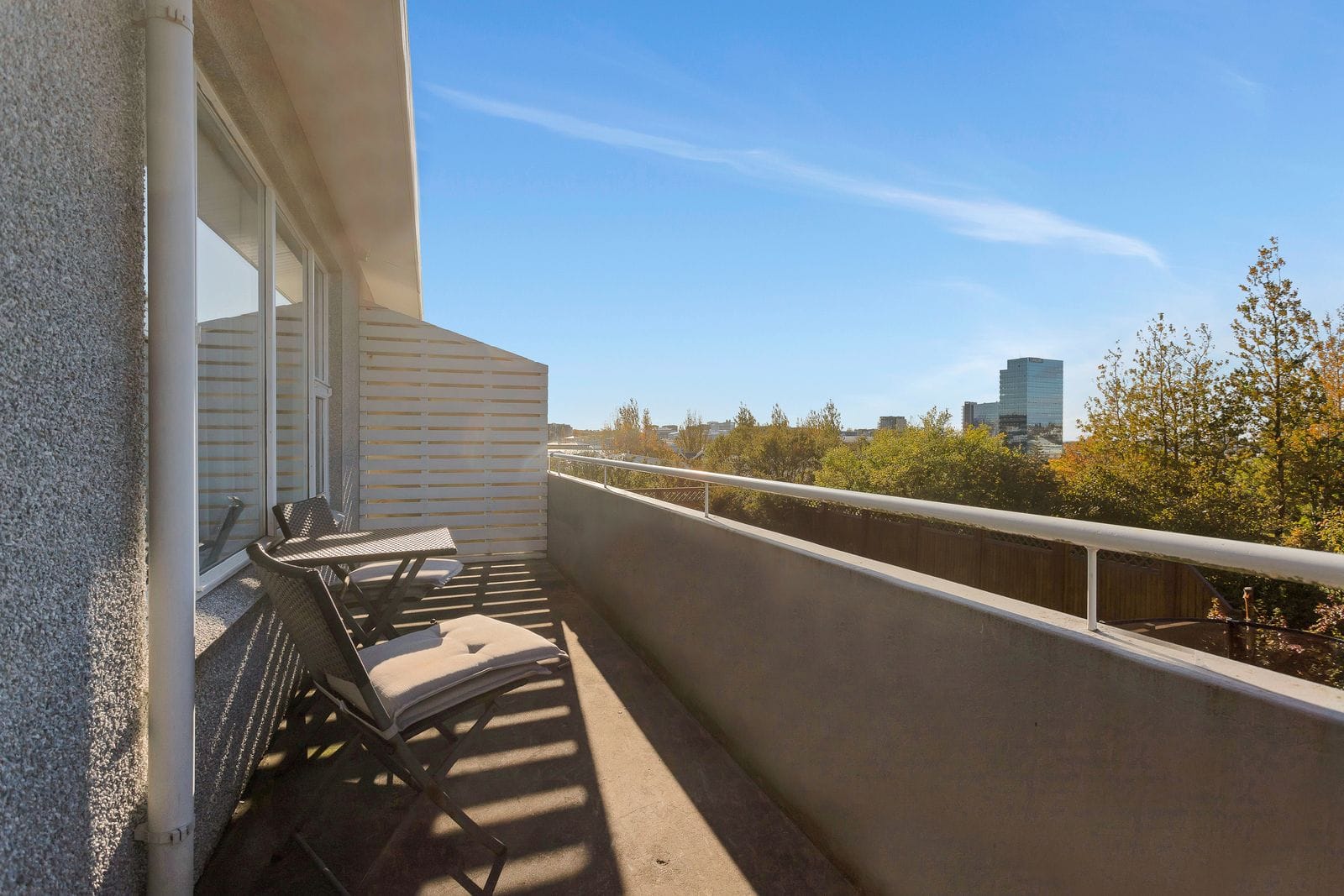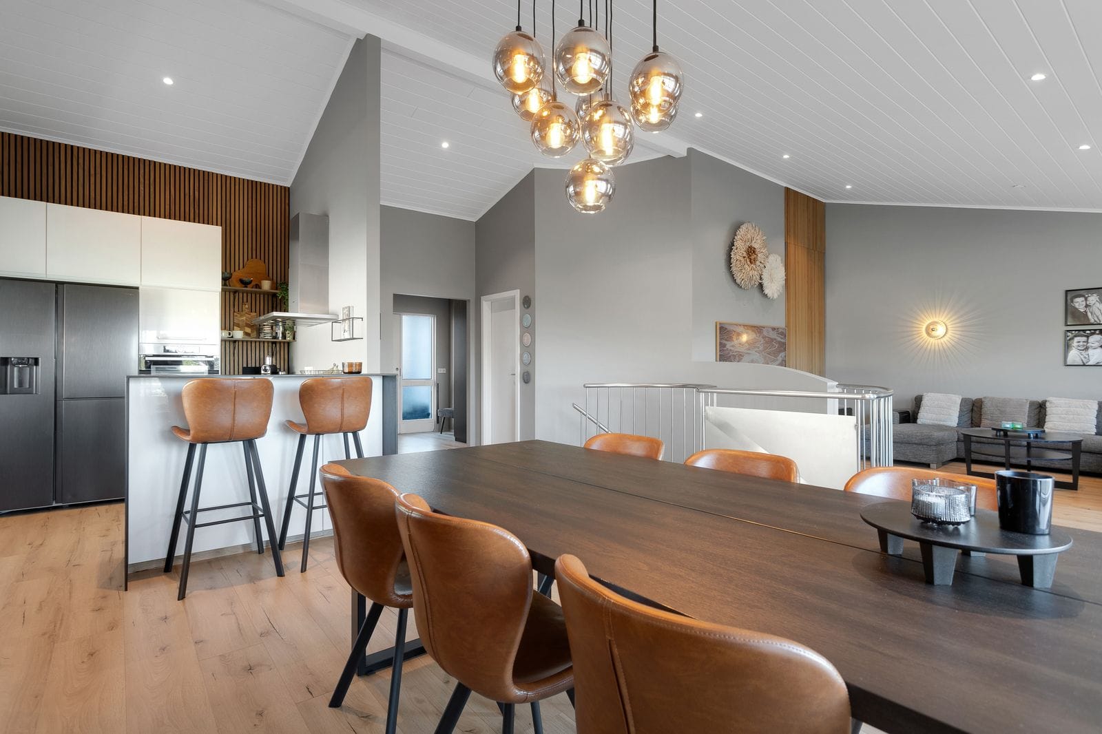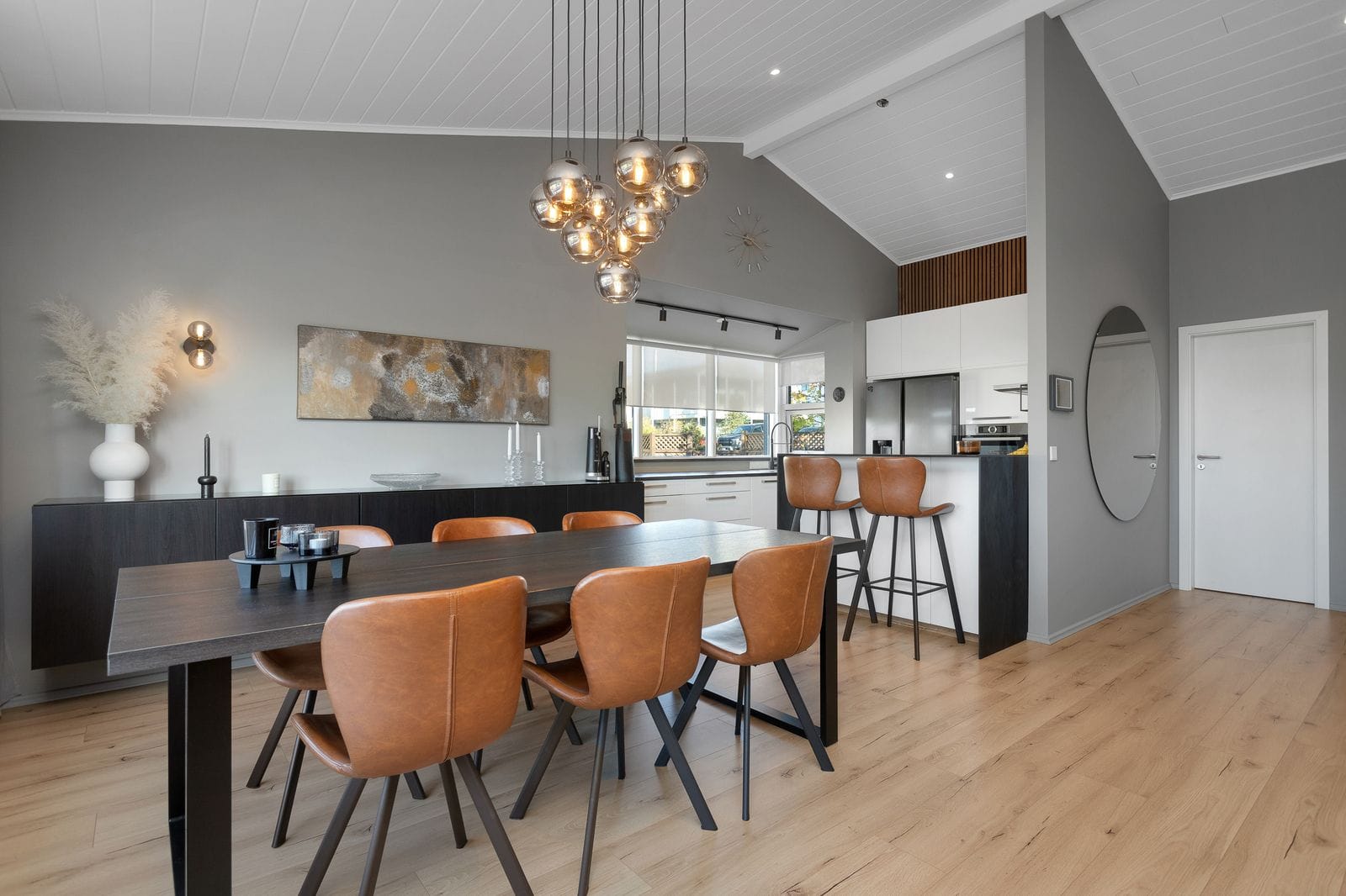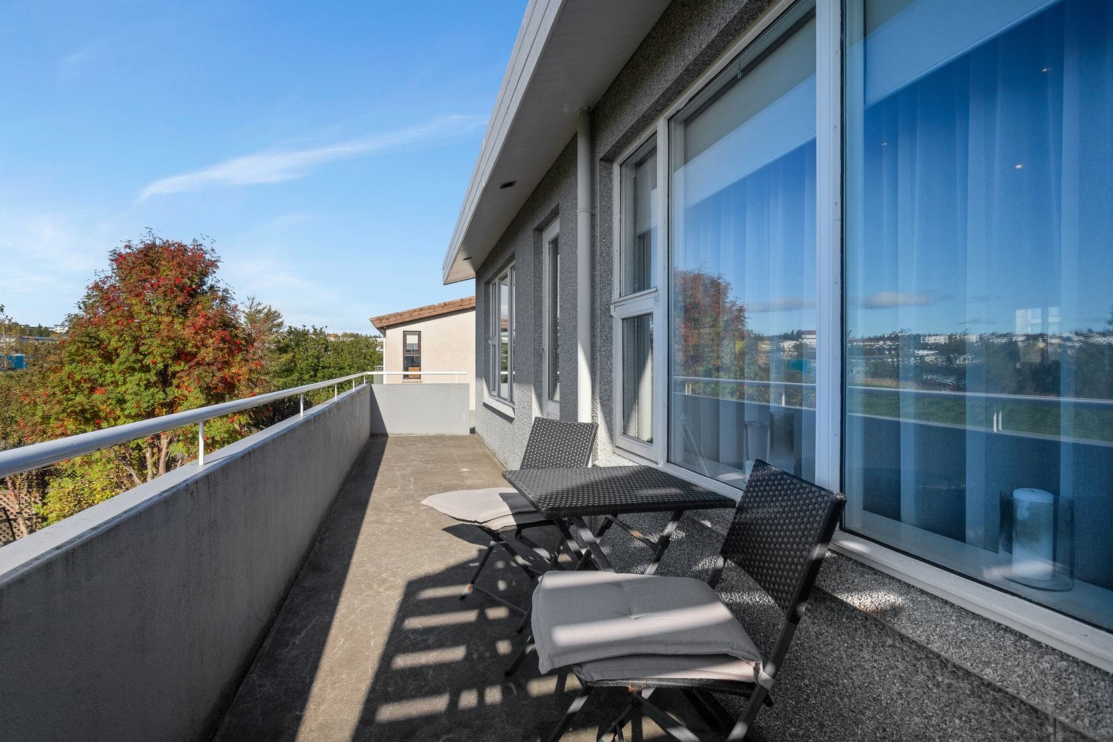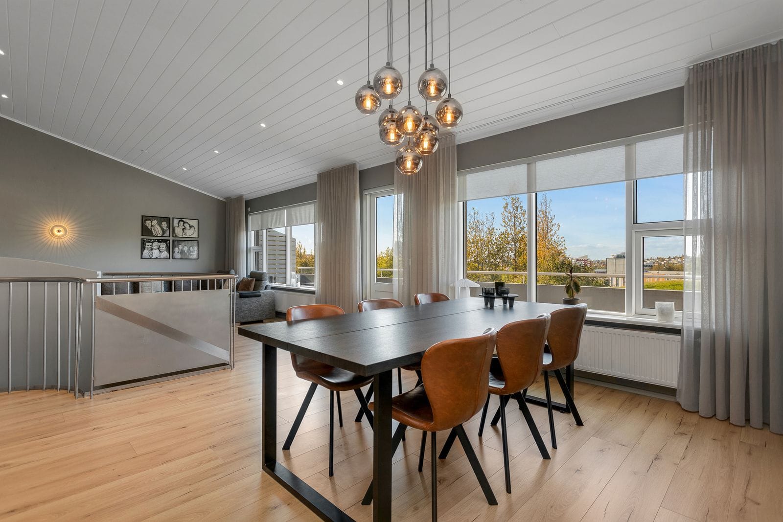 Borðstofa: Fyrir framan eldhúsið er rúmgóð borðstofa. Opið er frá borðstofunni að setustofunni. Á milli borðstofu og setustofunnar er gengið út á góðar útsýnissvalir sem snúa í vestur.