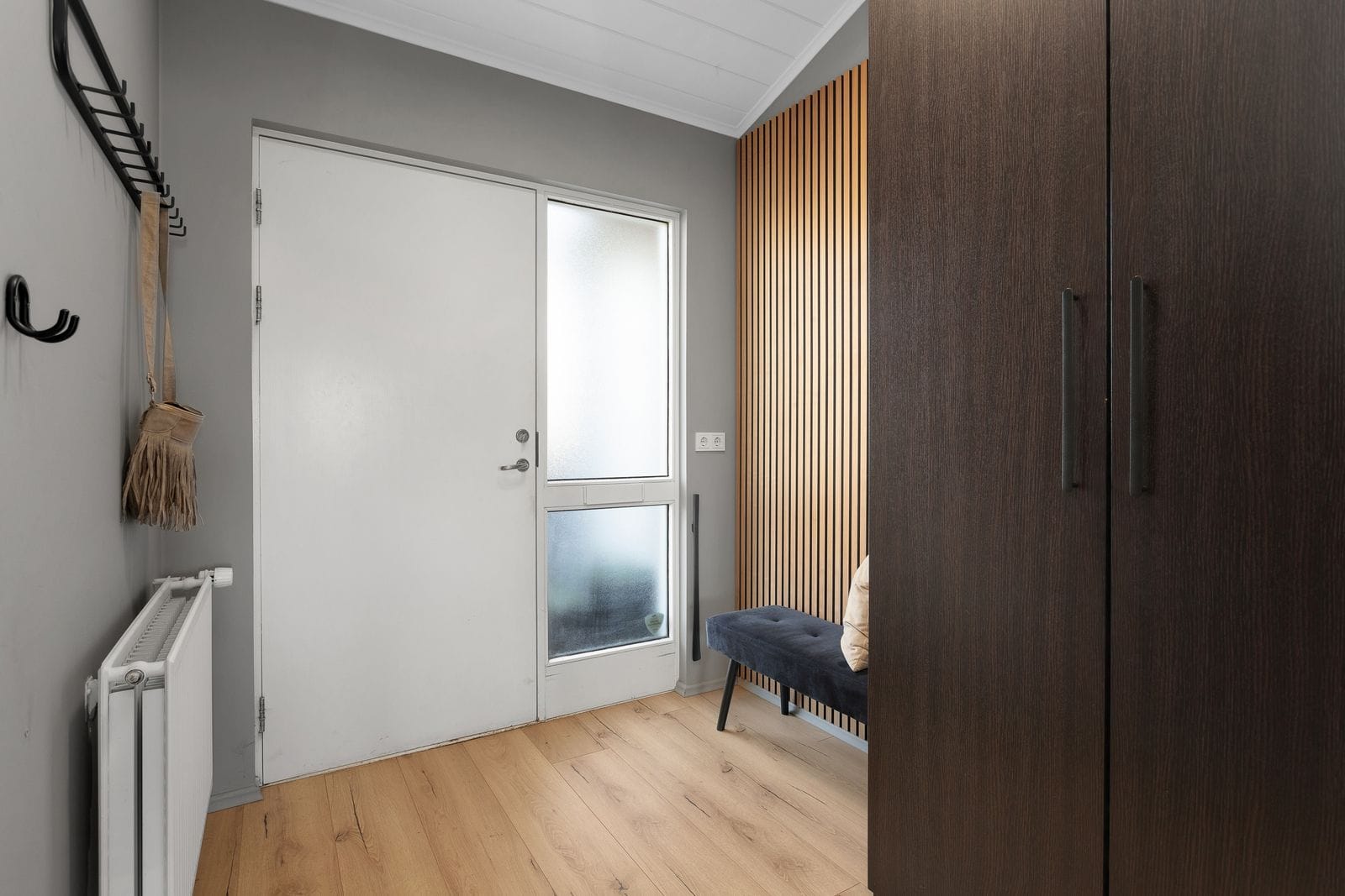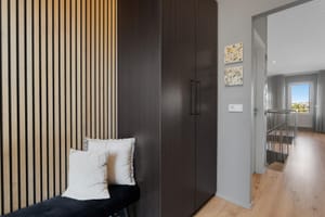 Forstofa: Komið er inn í forstofu með vönduðu harðparketi á gólfi, tvöföldum nýlegum fataskáp og falleg viðarklæðningu á einum vegg sem gefur fallegan svip á rýmið.
