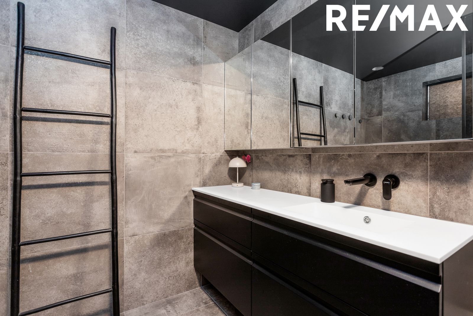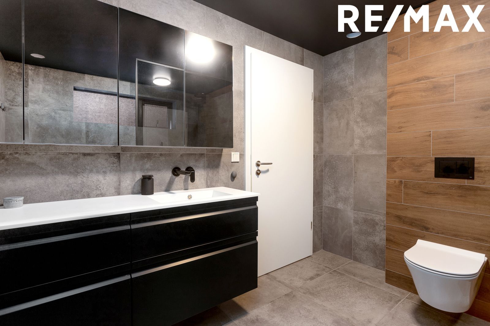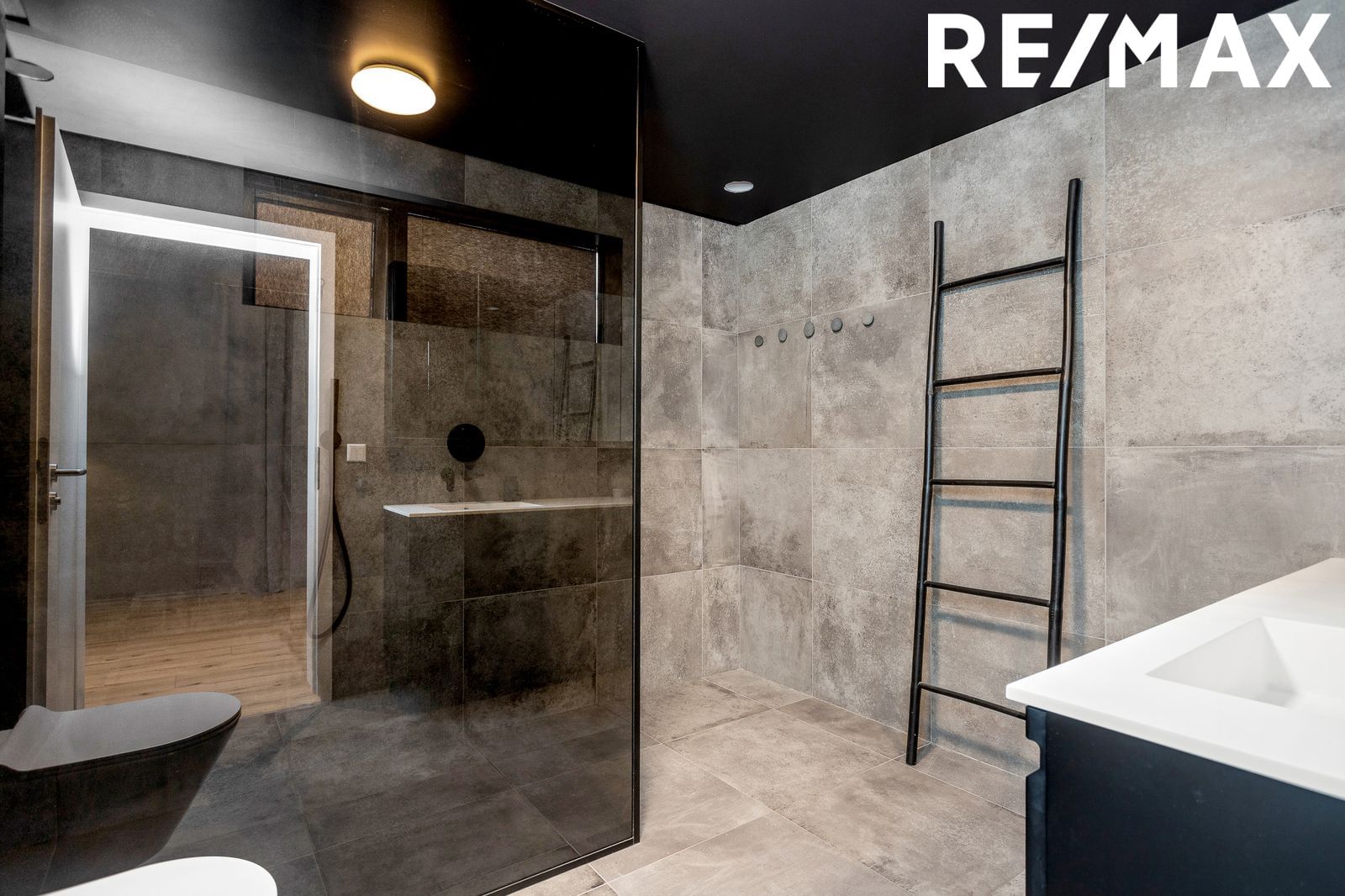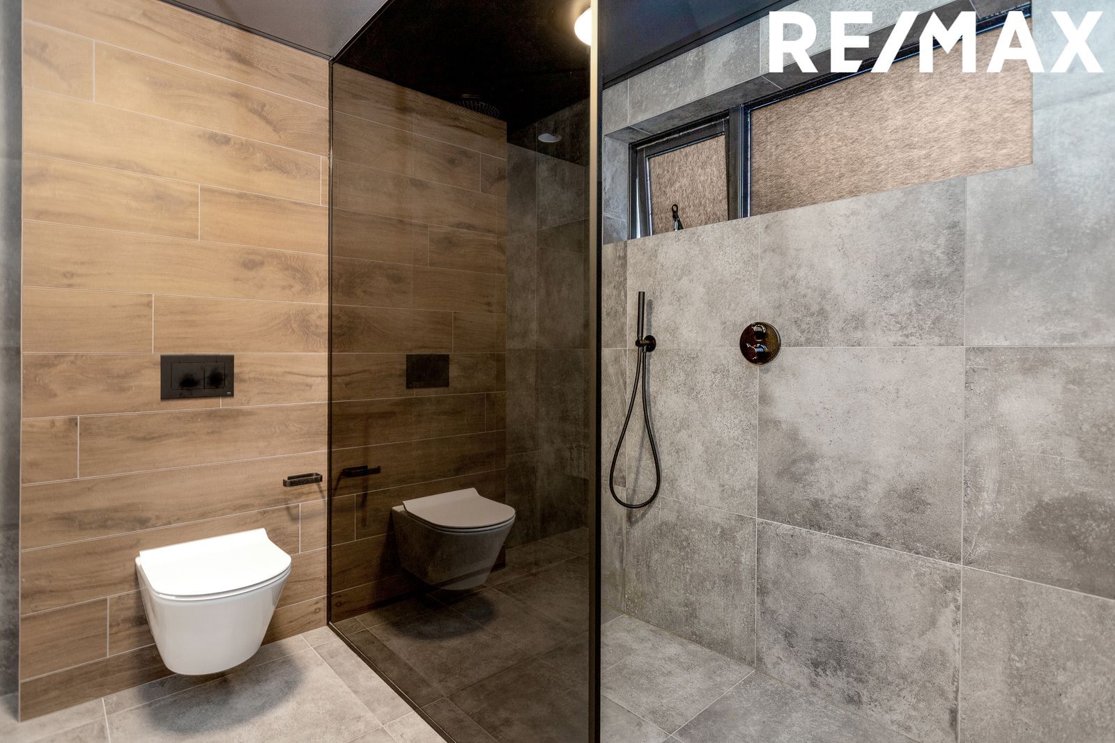 Aðalbaðherbergi: Baðherbergið er glæsilegt og nýlega endurnýjað. Fallegar dökk gráar 60 x 60 cm flísar eru á gólfi og á veggjum fyrir utan vegg við salerni sem er flísalagður með flísum í viðar útliti. Stór sturta beint á gólf er innst í rýminu við opnanlegan glugga, skyggt gler er við sturtuna og blöndunartæki eru innbyggð. Góð innrétting er undir vaski með hvítri steinborðplötu. Fyrir ofan vaskaborðið er fjórfaldur speglaskápur á vegg. Snagar fyrir handklæði eru á vegg á móti sturtunni og búið er að leggja hitalagnir í vegginn og því nýtast snagarnir á sama hátt og handklæðaofn.
