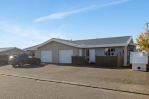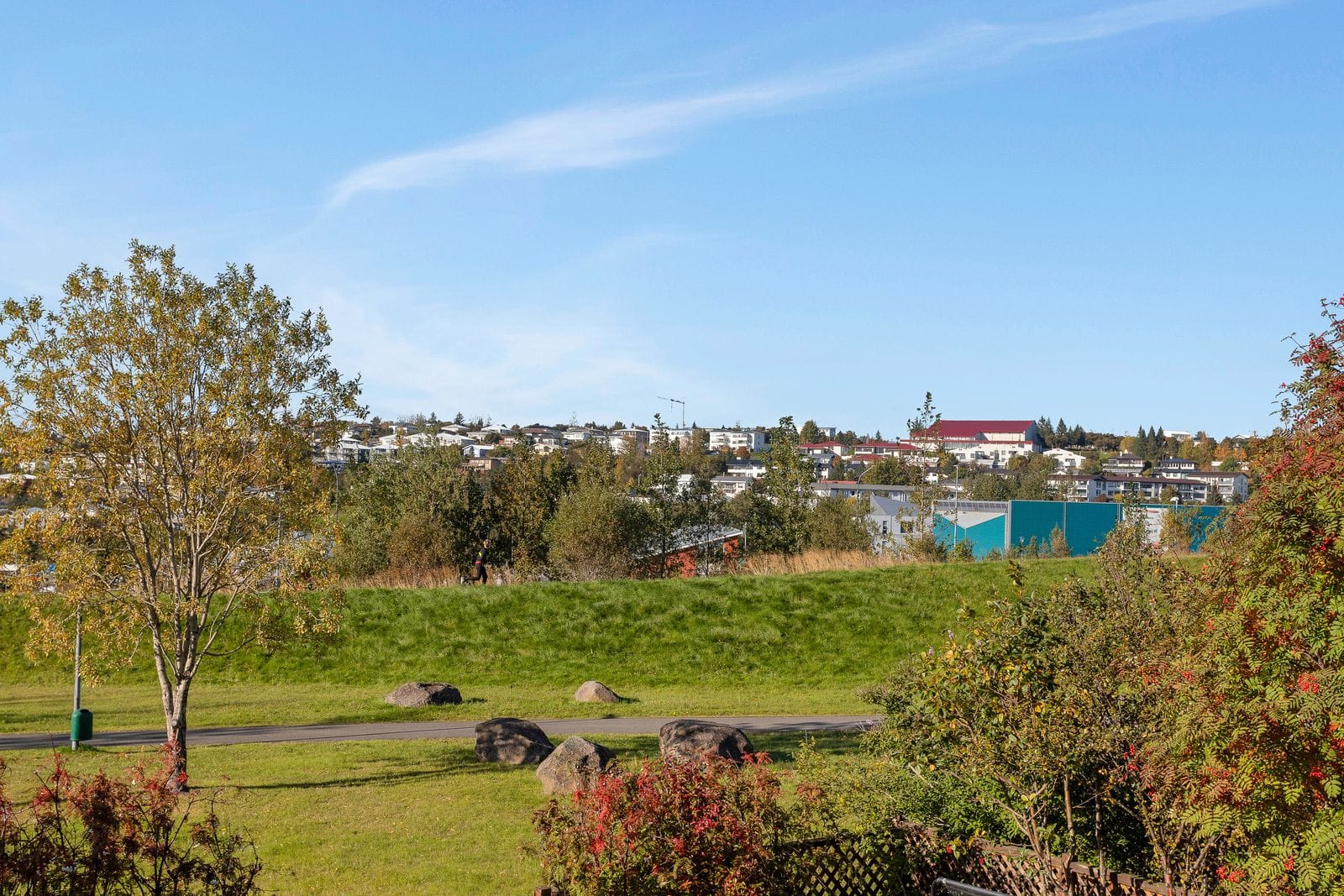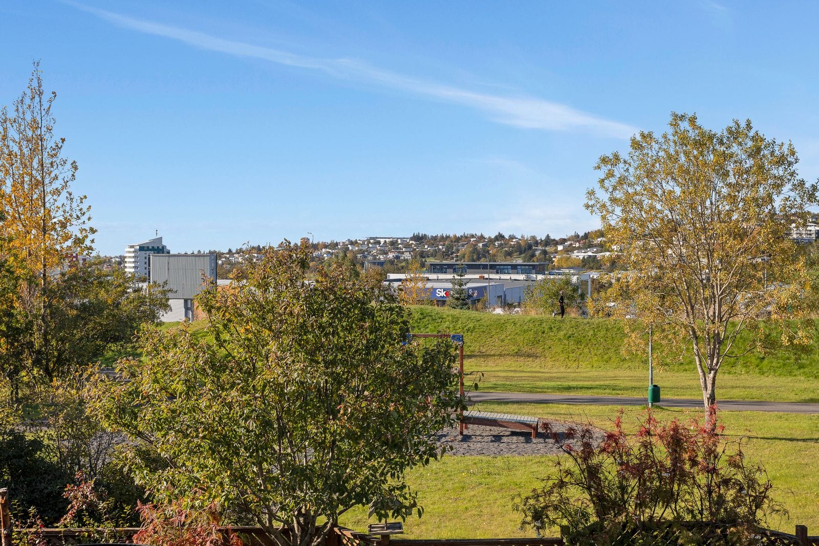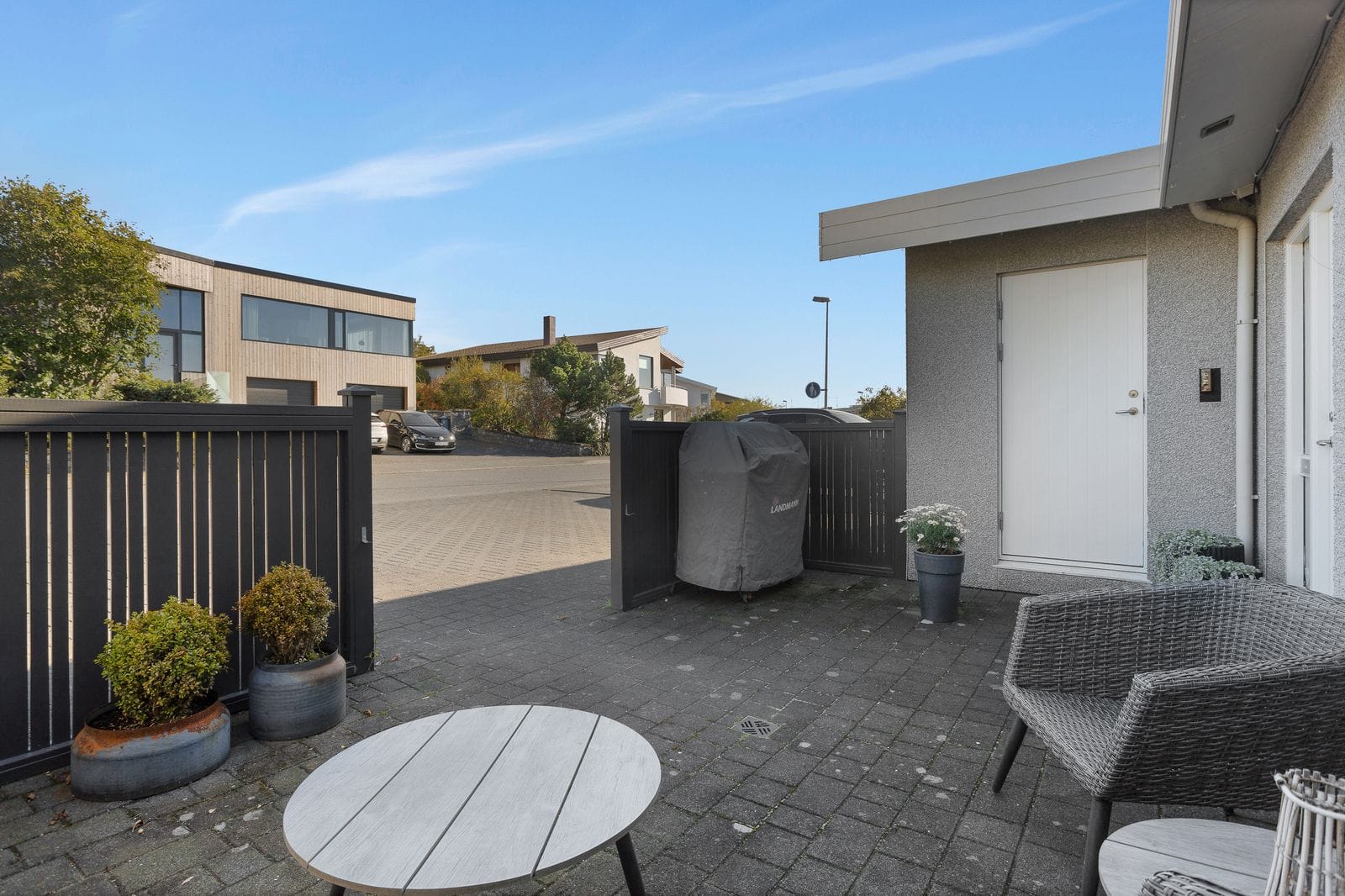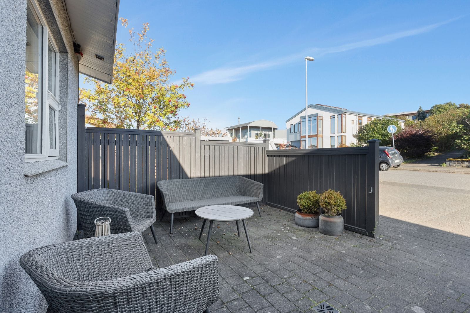 Nánari lýsing eignar:Aðalinngangur eignarinnar er á efri hæð hússins, gengið beint inn af bílaplani hússins. Fyrir framan innganginn er gott bílaplan sem rúmar vel 3 bíla. Einnig er útisvæði með skjólveggjum, einskonar auka verönd. Hægt er að ganga niður að garðinum við hægri gafl hússins.
