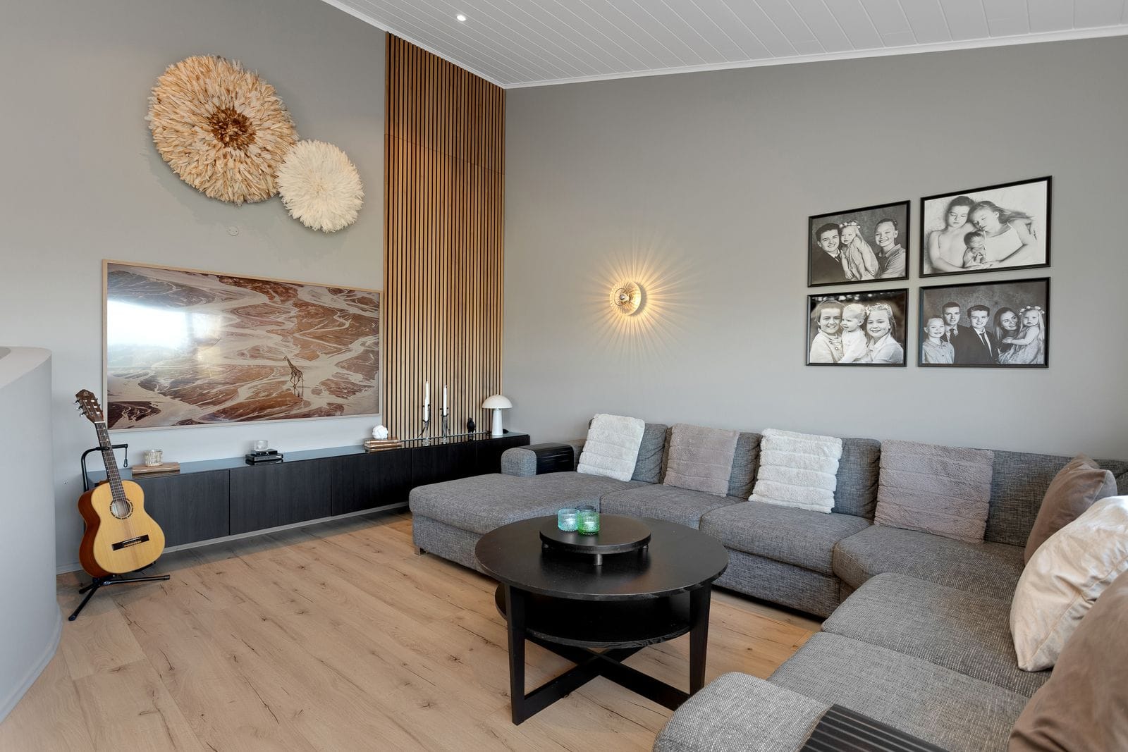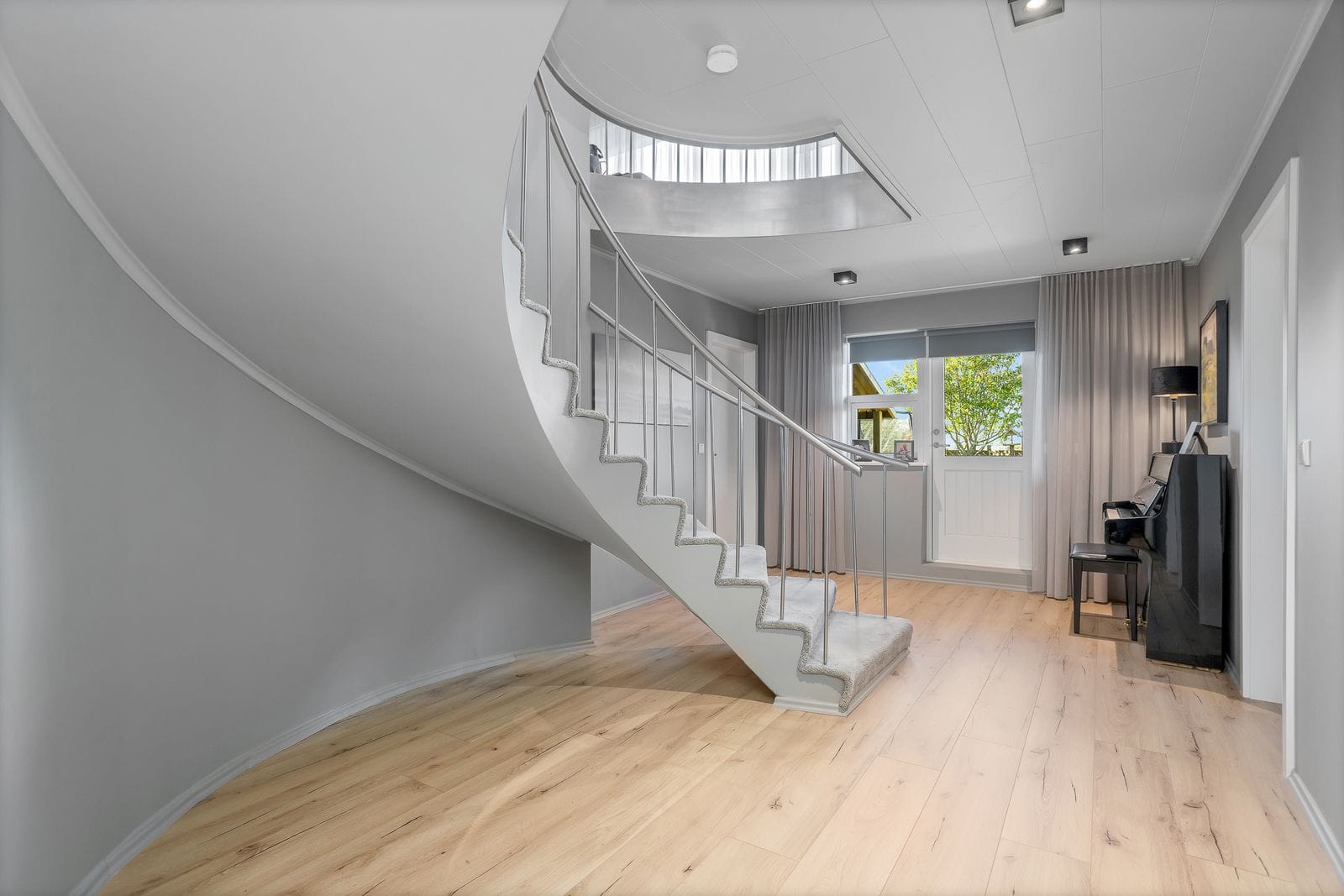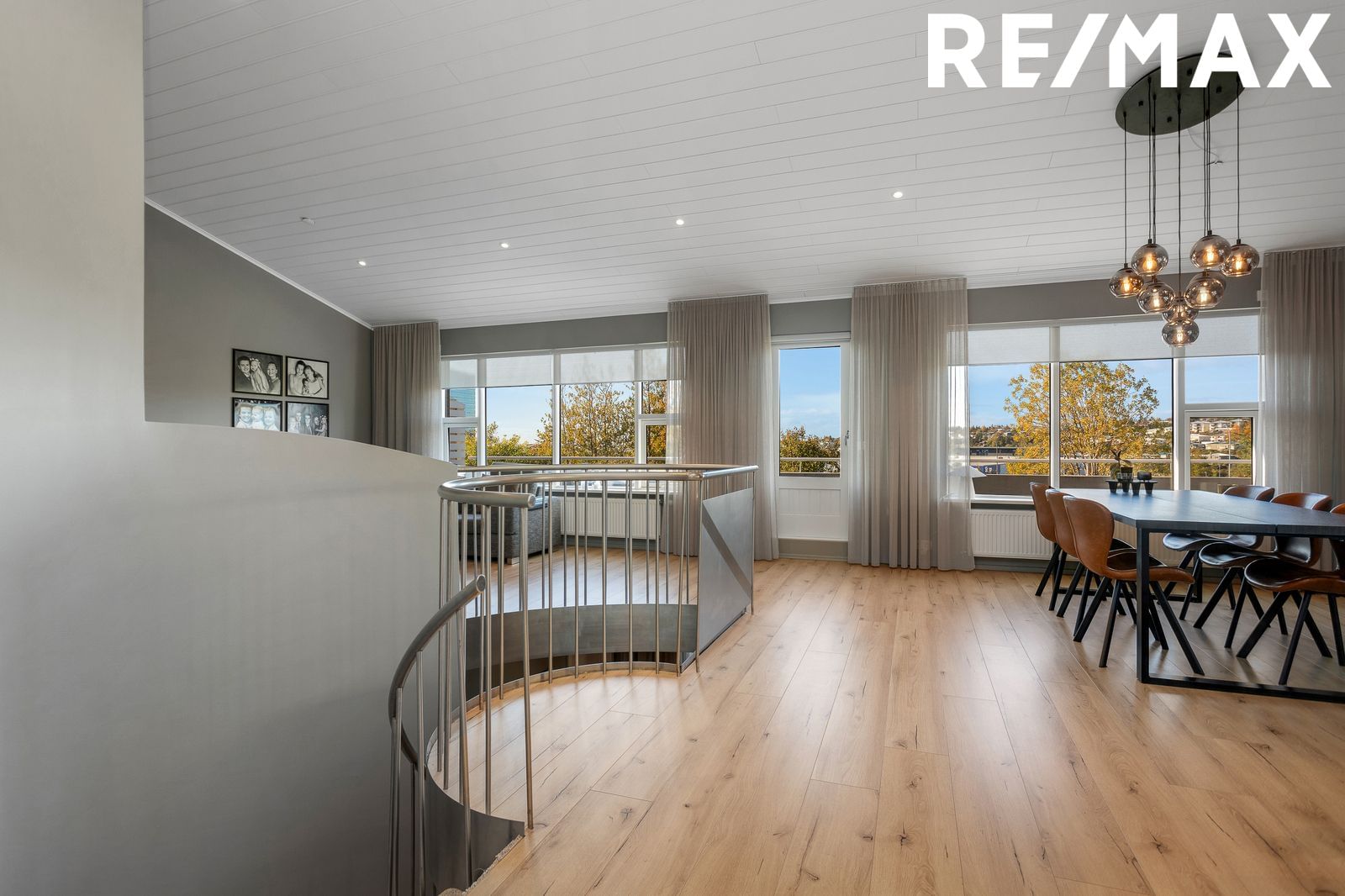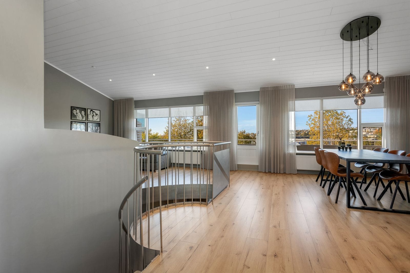Í miðju alrýminu er sérlega fallegur hringstigi sem leiðir niður á neðri hæðina með fallegu stálhandriði.