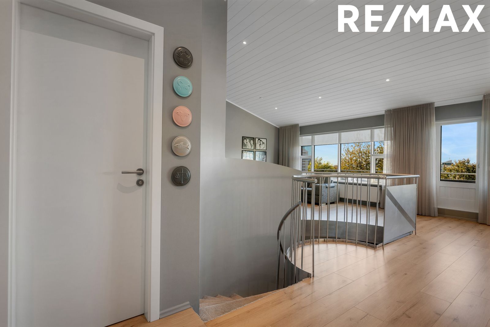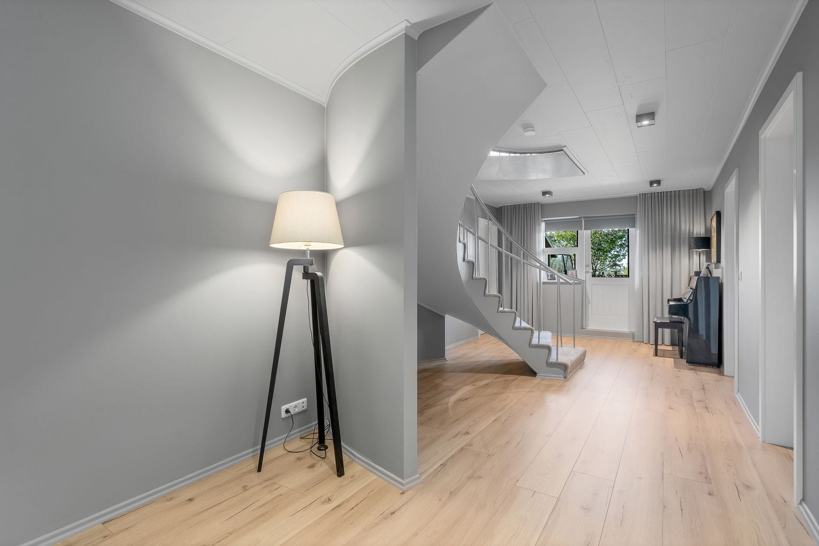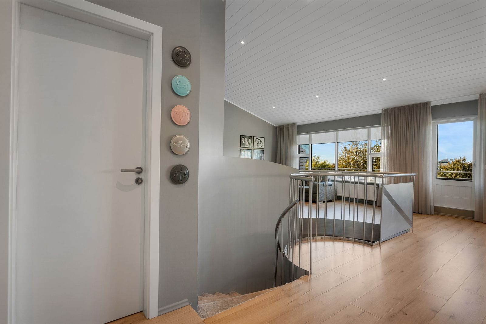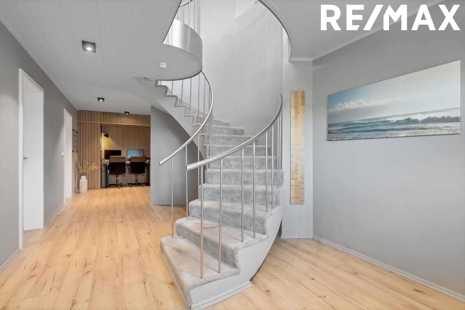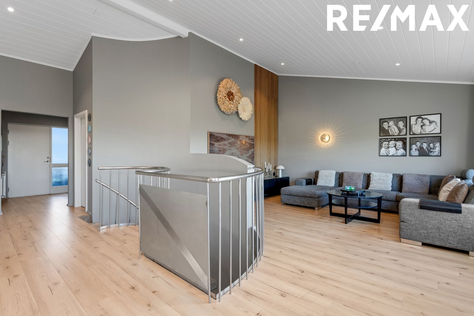 Í miðju alrýminu er sérlega fallegur hringstigi sem leiðir niður á neðri hæðina með fallegu stálhandriði.