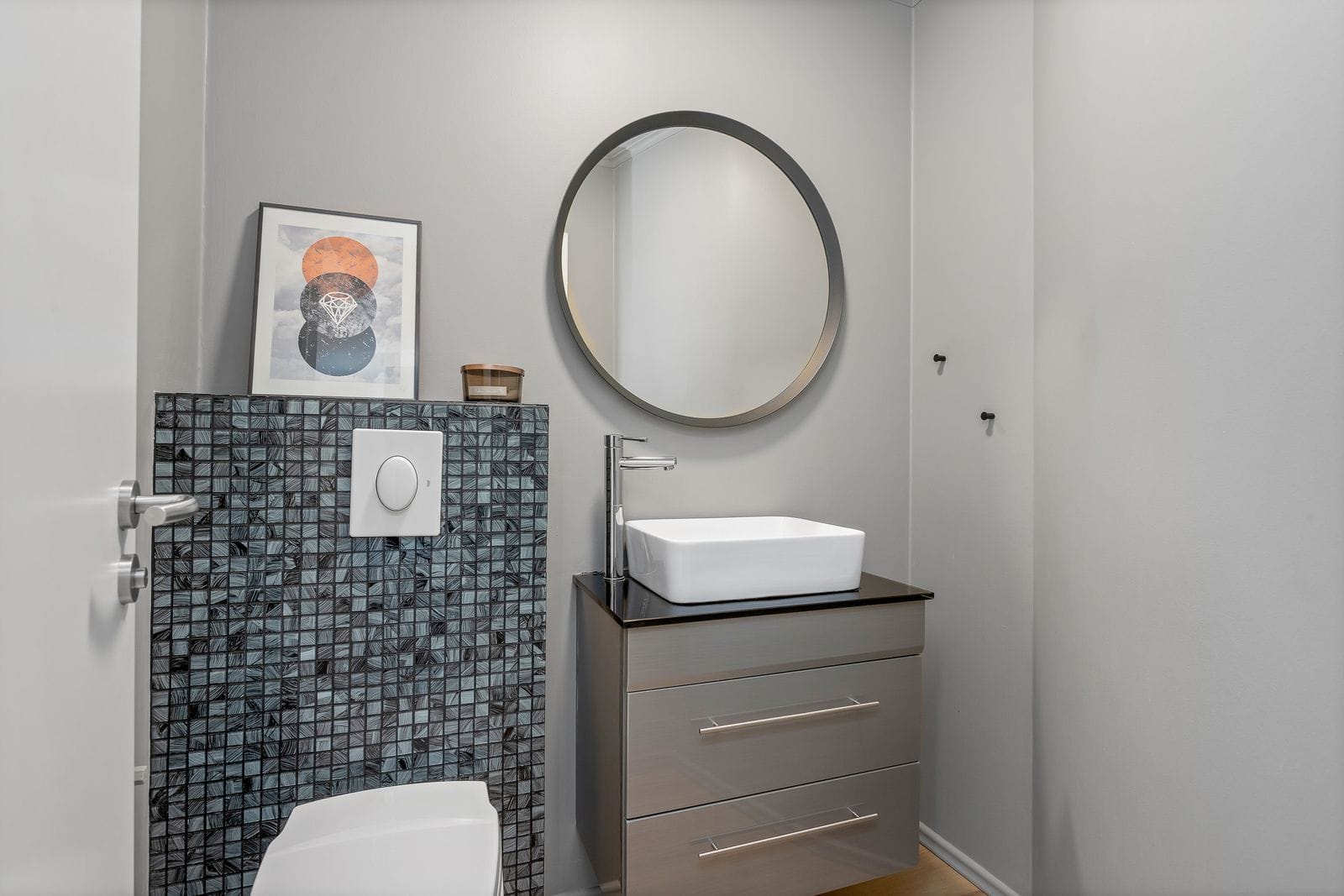 Gestasalerni: Á hæðinni er gestasalerni með fallegri grárri innréttingu undir vaski, ofanáliggjandi vaski, hringspegil á vegg og upphengdu salerni.