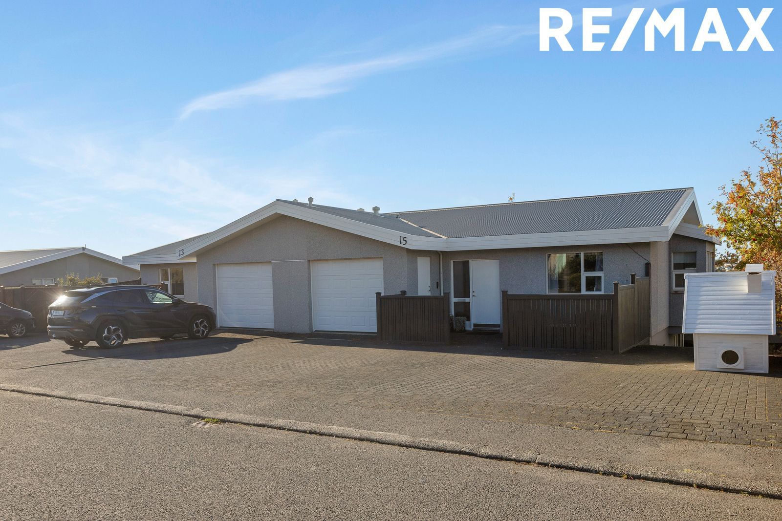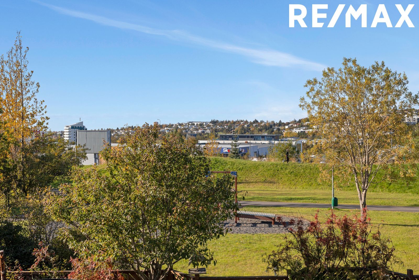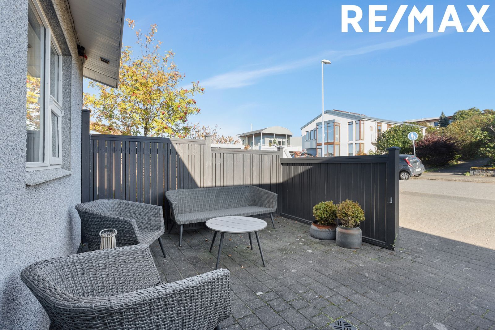 Aðalinngangur eignarinnar er á efri hæð hússins, gengið beint inn af bílaplani hússins. Fyrir framan innganginn er gott bílaplan sem rúmar vel 3 bíla. Einnig er útisvæði með skjólveggjum, einskonar auka verönd. Hægt er að ganga niður að garðinum við hægri gafl hússins.