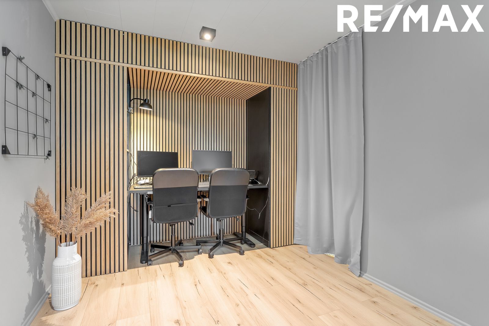 Komið er niður á neðri hæðina í rúmgott miðjuhol með fallegu vönduðu harðparketi á gólfi, góðu vel skipulögðu vinnurými innst í rýminu og útgangi út í garðinn og út á veröndina.