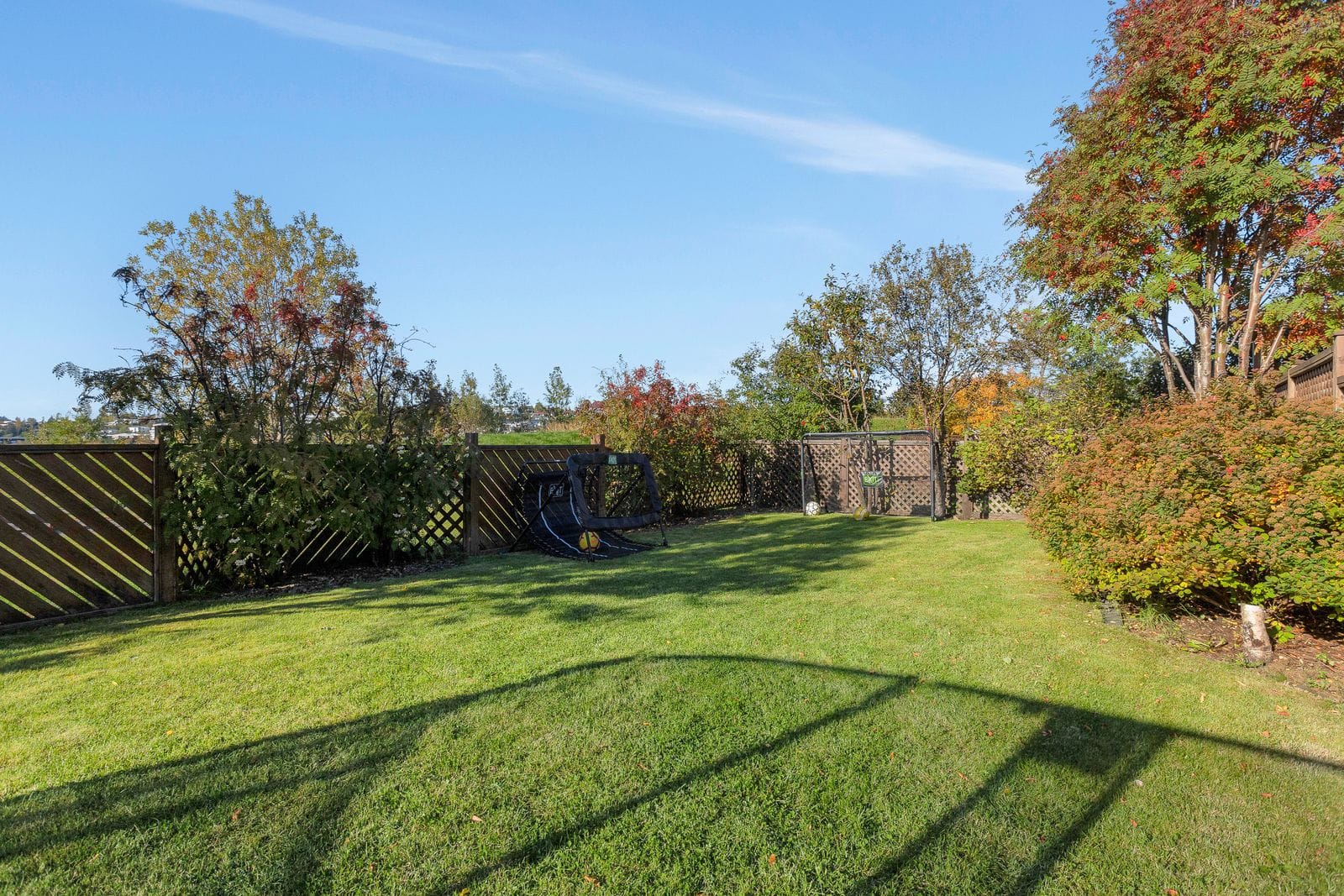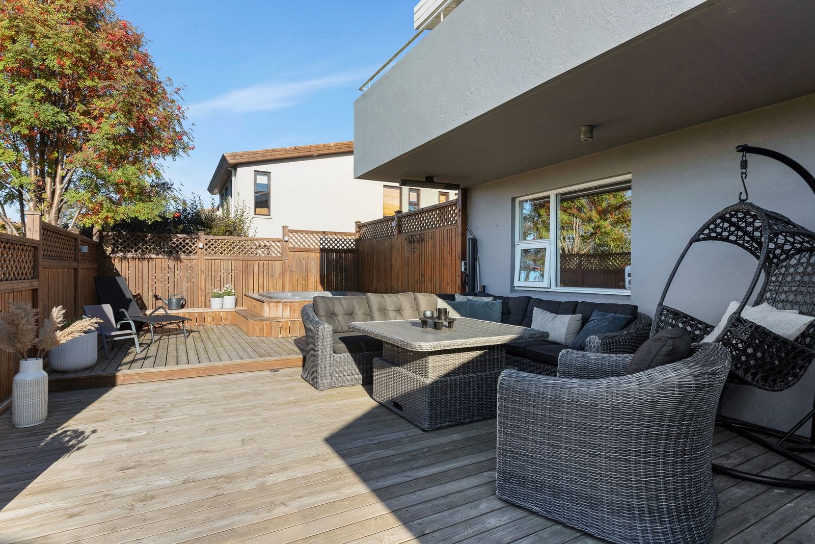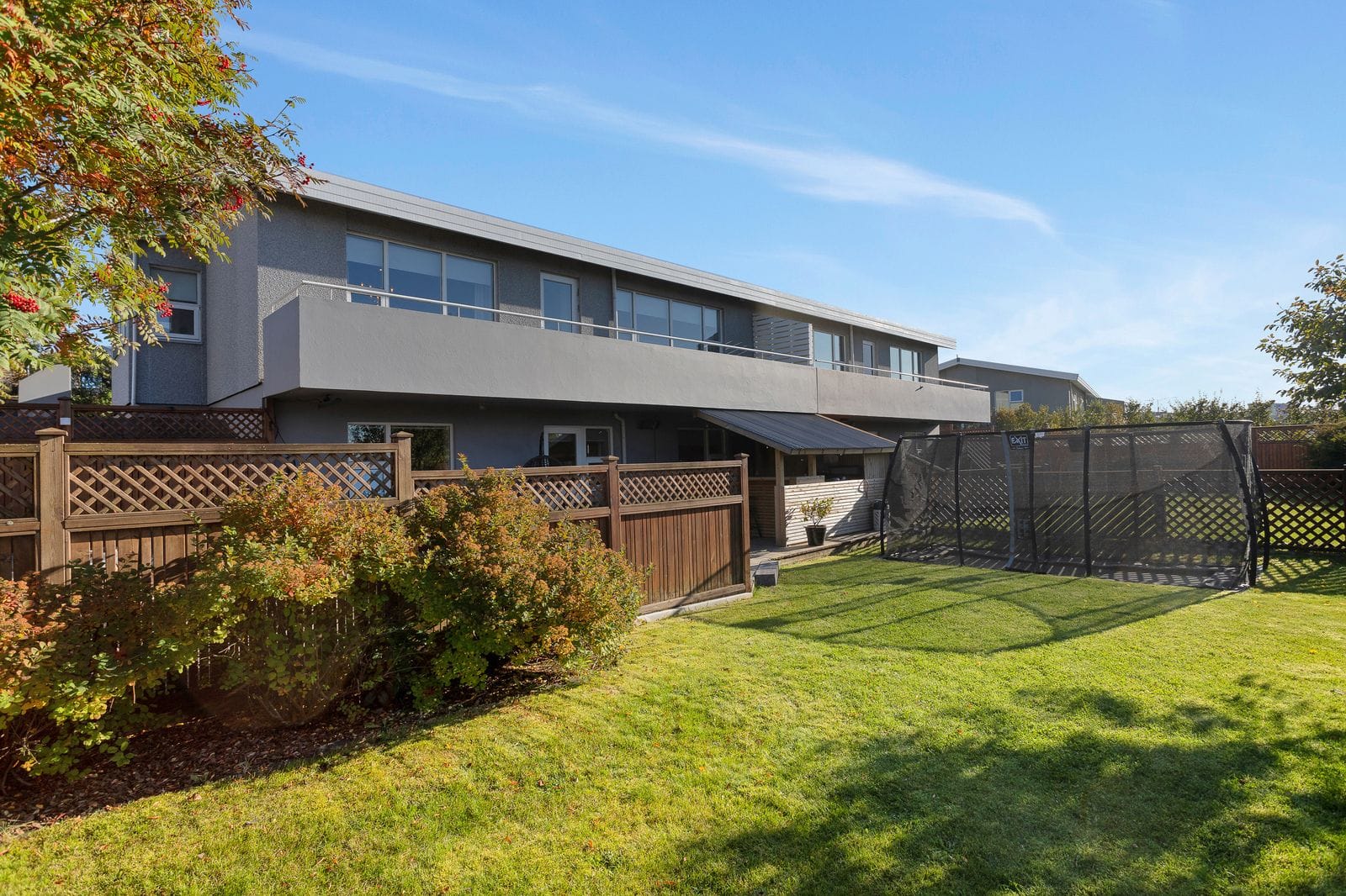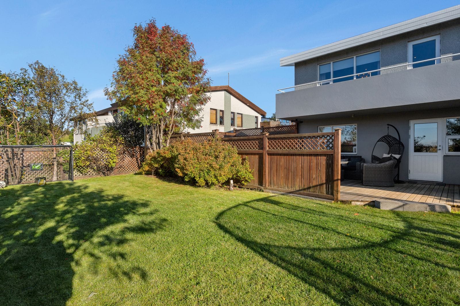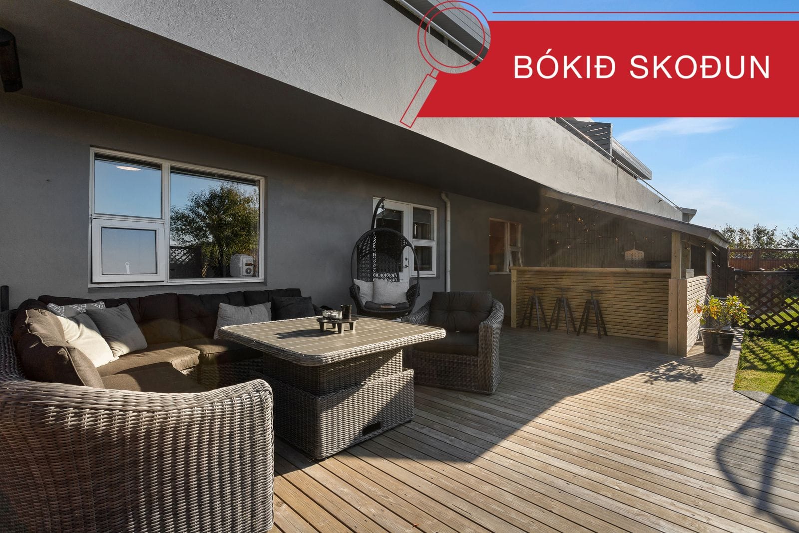 Garður: Hægt er að ganga að garðinum á tvo vegu, bæði frá neðri hæð hússins og einnig gengið niður með hægri hlið eignarinnar. Veröndin er stór með heitum potti , stóru setusvæði og glæsilegu stóru útieldhúsi með lokuðu þaki og því hægt að nýta allt árið. Fyrir framan veröndina eru grasþökur, falleg tré, niðurgrafið trampolín og timburgirðing sem lokar af garðinn. Við hlið hússins er góður geymsluskúr.