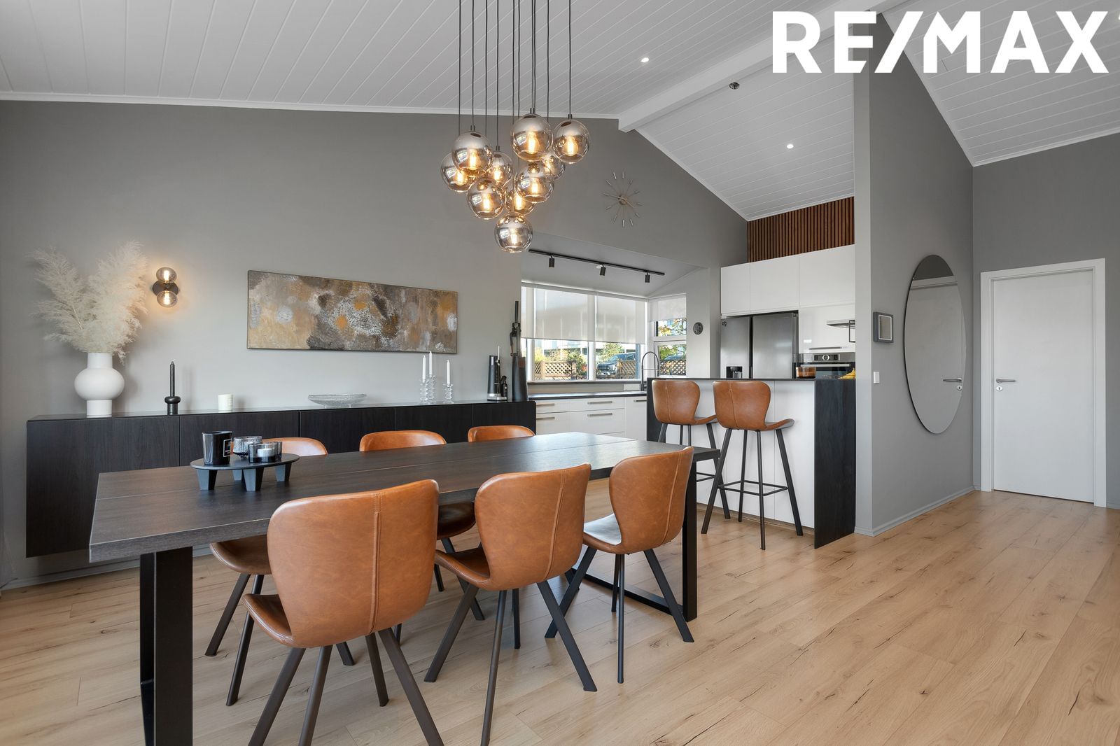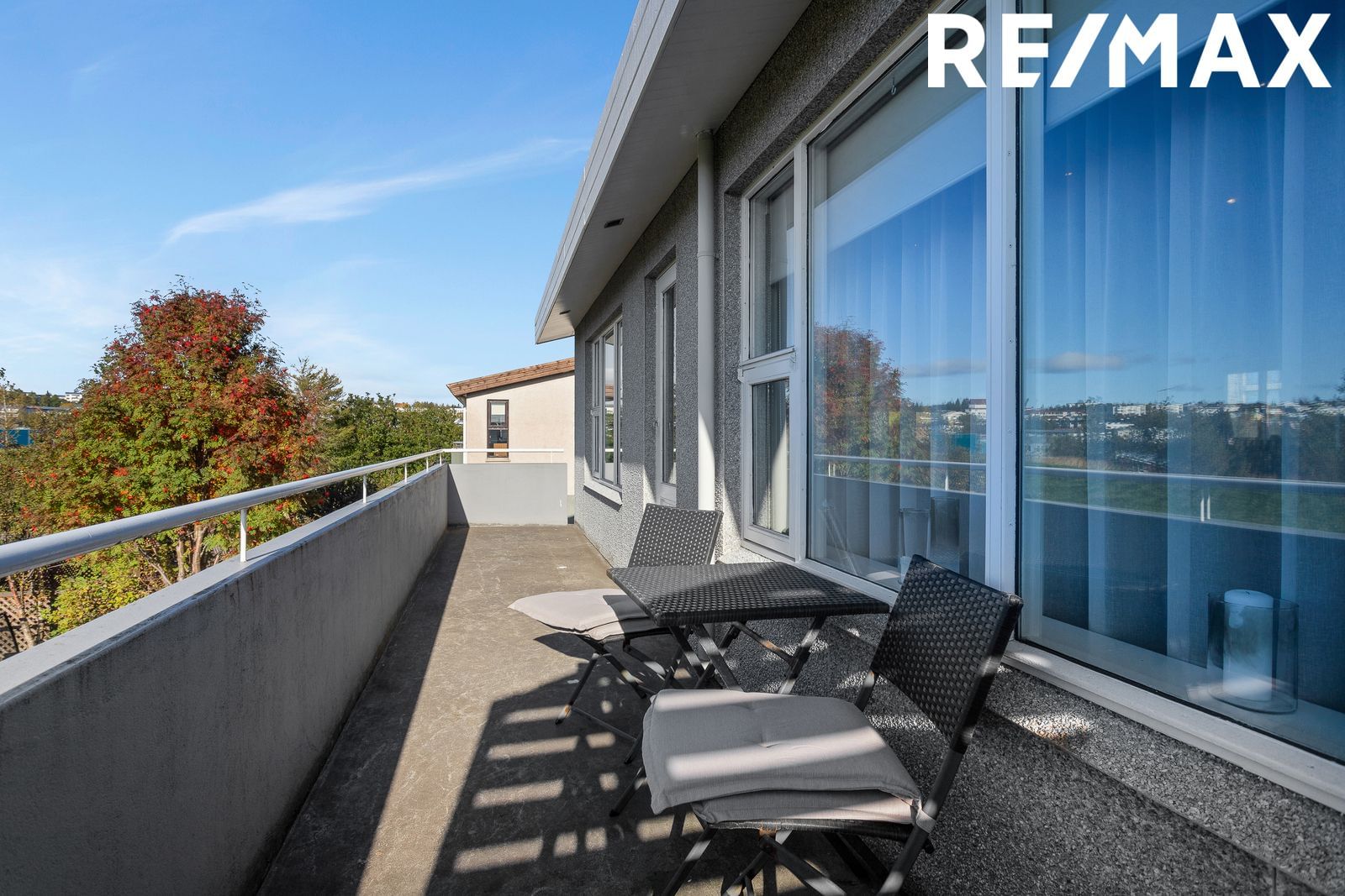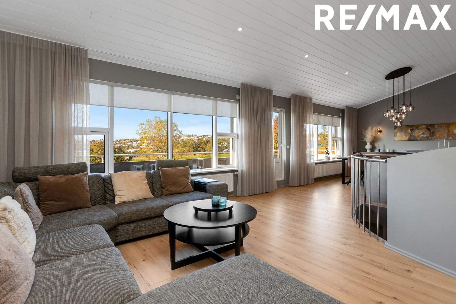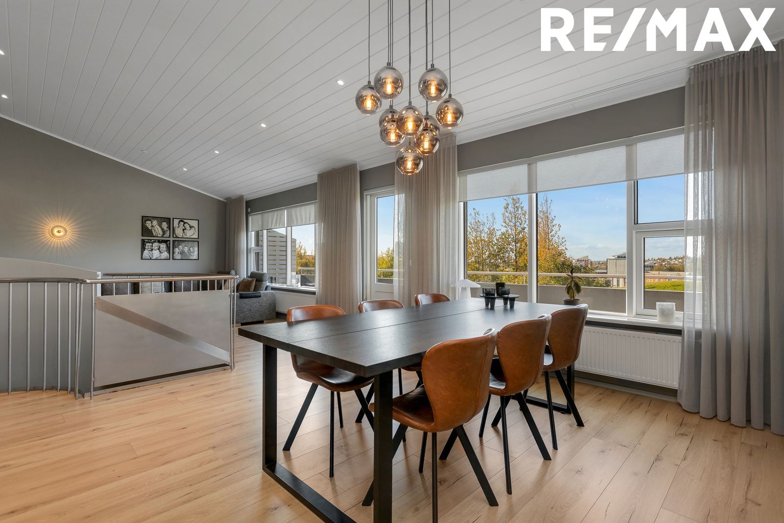 Borðstofa: Fyrir framan eldhúsið er rúmgóð borðstofa. Opið er frá borðstofunni að setustofunni. Á milli borðstofu og setustofunnar er gengið út á góðar útsýnissvalir sem snúa í vestur.