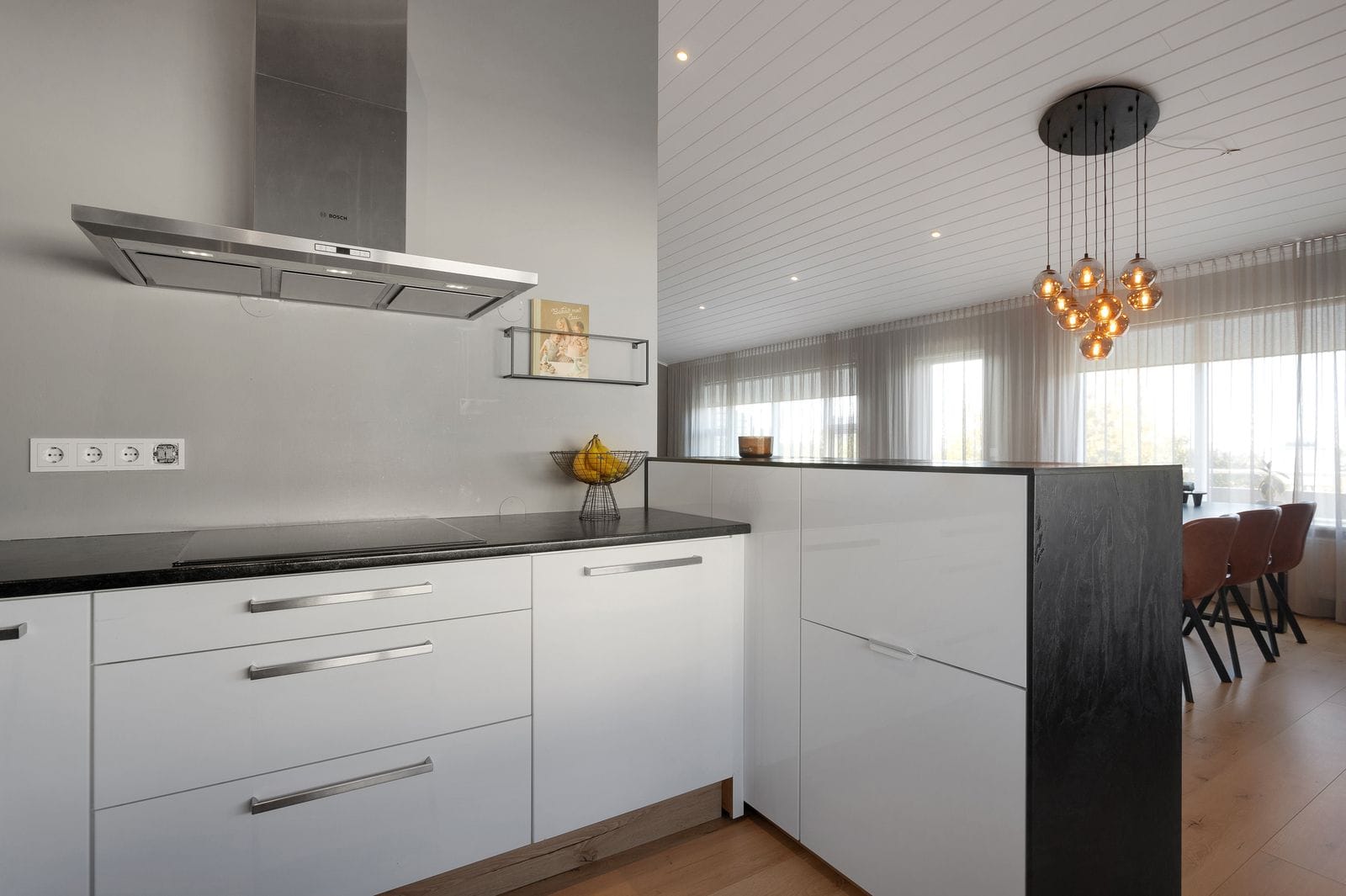 Eldhús: Eldhúsið er að hluta til í sérrými en einnig opið yfir að borðstofunni að hluta. Innréttingin er hvít í U auk eyju sem snýr í átt að borðstofunni. Borðplata er dökk og falleg viðarklæðning er á hluta af veggjum. Rými er fyrir tvöfaldan ísskáp, tengi er fyrir uppþvottavél, ofn er í vinnuhæð og spanhelluborð er við góðan gufugleypi.