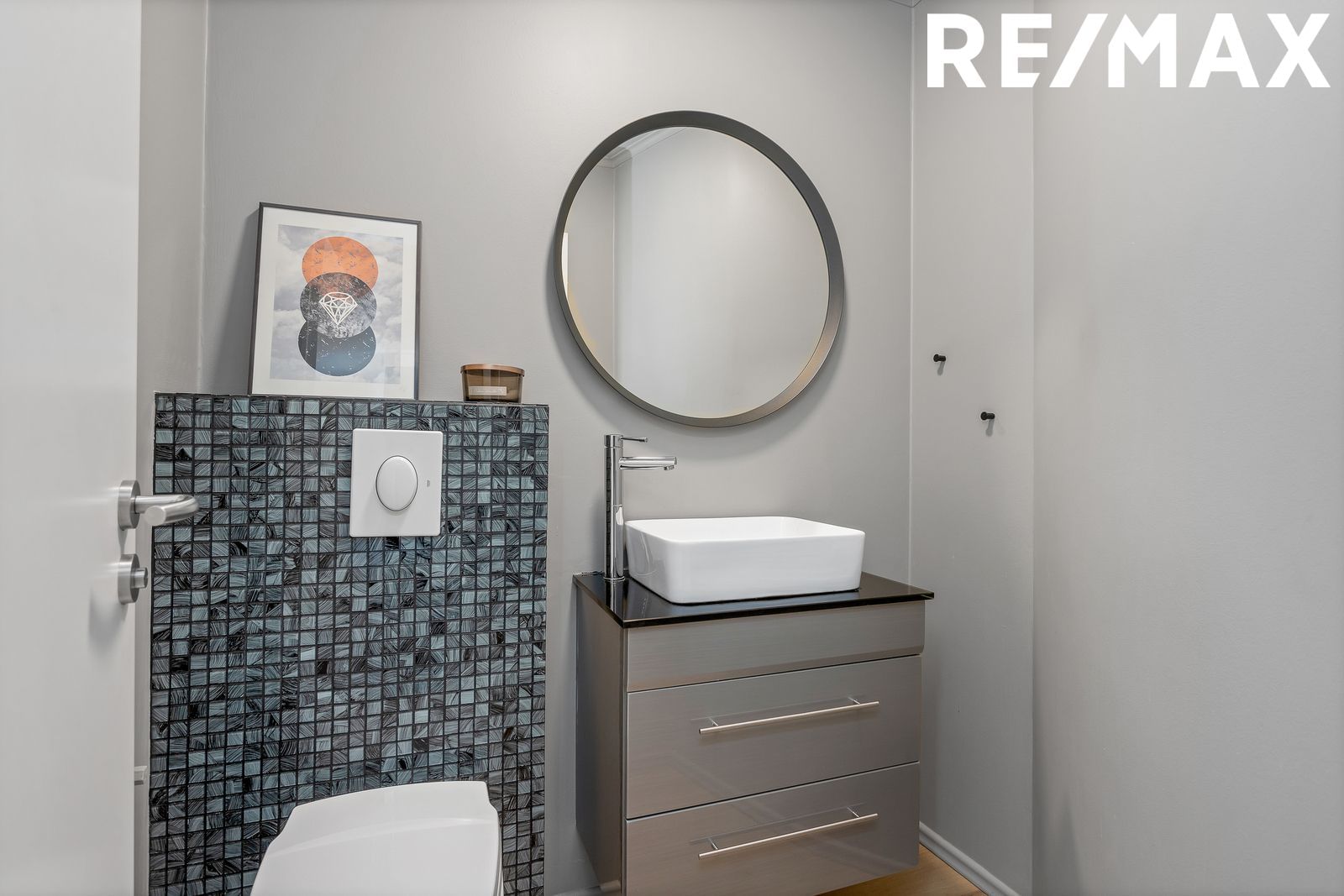 Gestasalerni: Á hæðinni er gestasalerni með fallegri grárri innréttingu undir vaski, ofanáliggjandi vaski, hringspegil á vegg og upphengdu salerni.
