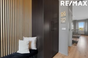 Komið er inn í forstofu með vönduðu harðparketi á gólfi, tvöföldum nýlegum fataskáp og falleg viðarklæðningu á einum vegg sem gefur fallegan svip á rýmið.