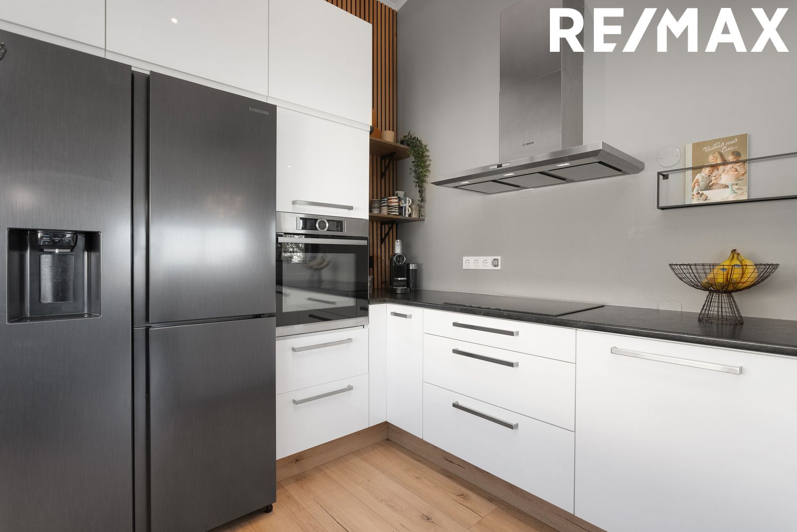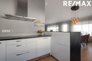Eldhús: Eldhúsið er að hluta til í sérrými en einnig opið yfir að borðstofunni að hluta. Innréttingin er hvít í U auk eyju sem snýr í átt að borðstofunni. Borðplata er dökk og falleg viðarklæðning er á hluta af veggjum. Rými er fyrir tvöfaldan ísskáp, tengi er fyrir uppþvottavél, ofn er í vinnuhæð og spanhelluborð er við góðan gufugleypi.