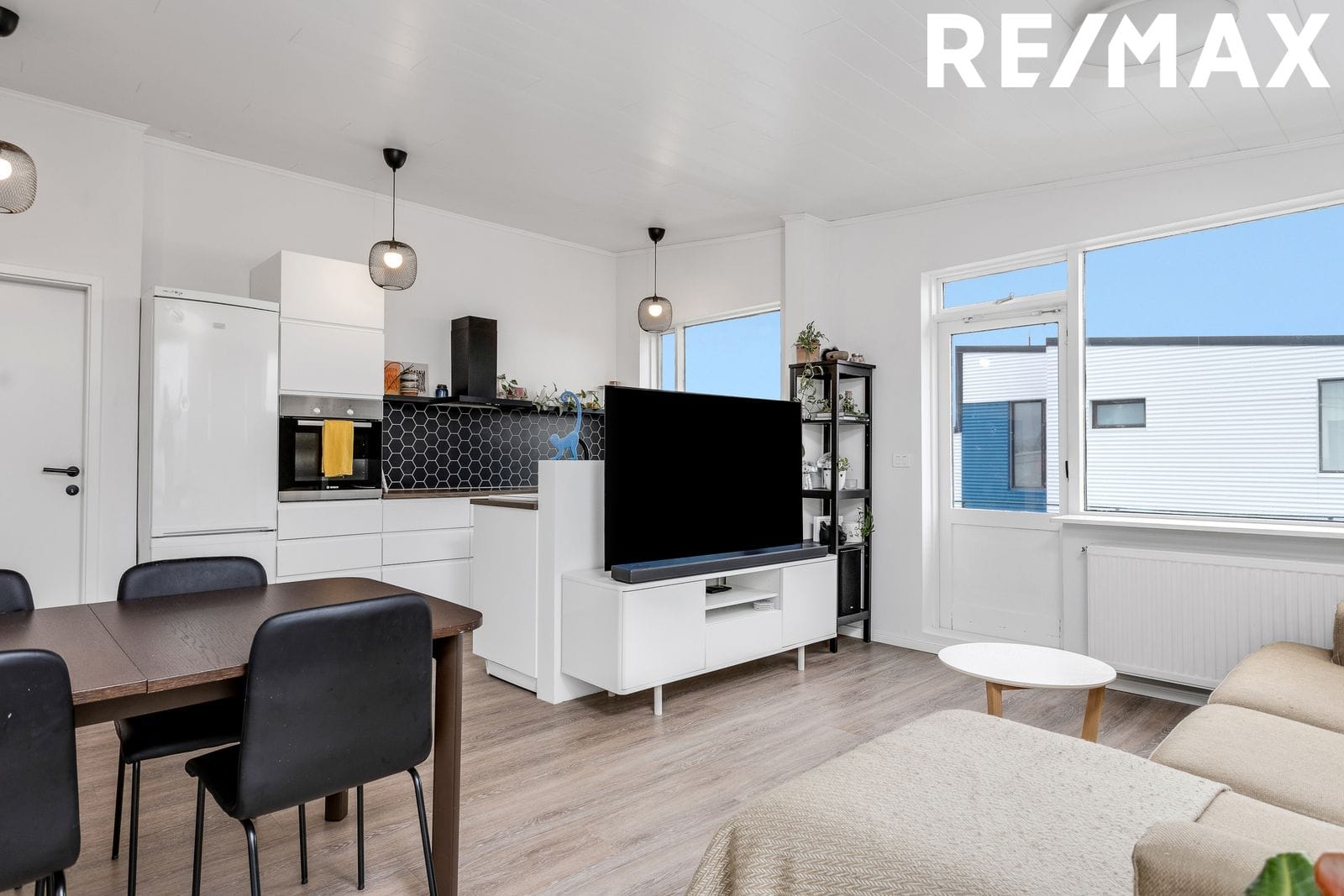 Stofa og borðstofa er í sama rými, stórir og bjartir gluggar og útgengt er út á