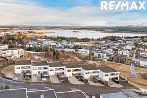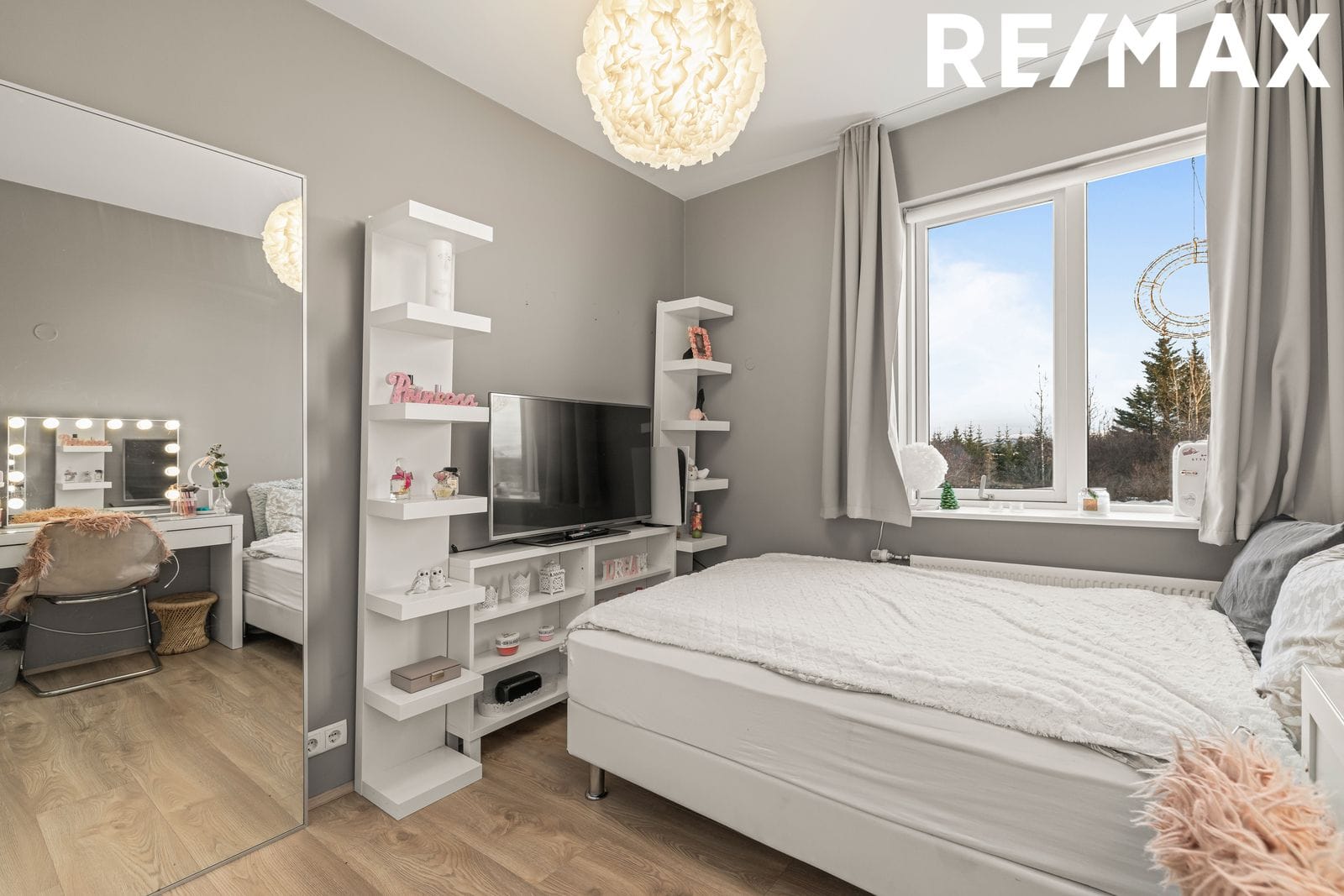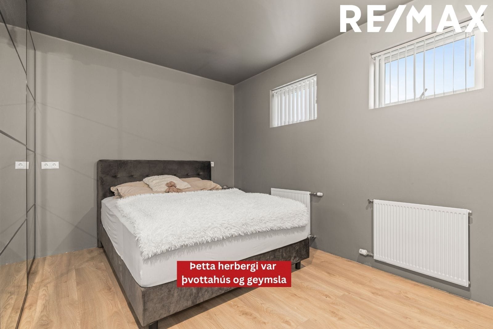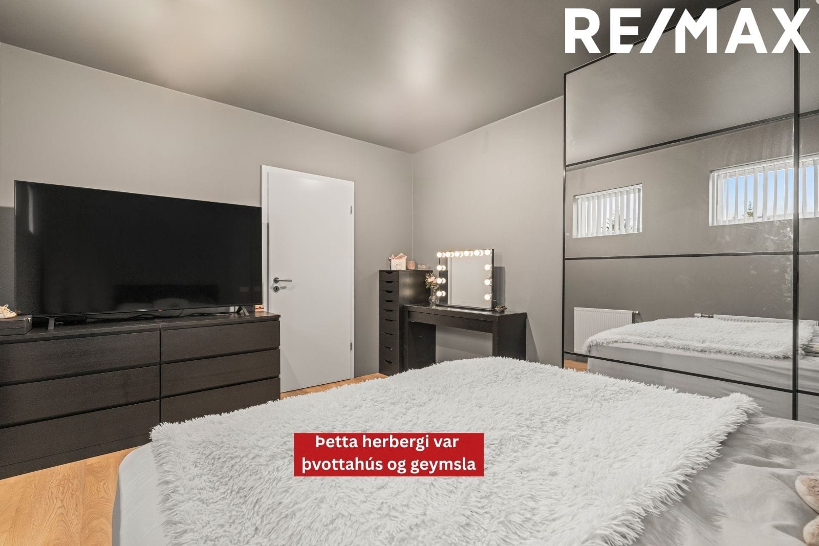 Um er að ræða fjölskylduvæna eign á eftirsóttum stað þar sem útivist, náttúra og þjónusta fara saman. Teikningar eignar sýna neðri hæð með forstofu, þremur svefnherbergjum, baðherbergi, geymslu, þvottahúsi og bílskúr. Breyting á neðri hæð er þannig að stórt herbergi hefur verið útbúið úr geymslu og þvottahúsi, og er því þvottaaðstaða nú í bílskúr þar sem tengi eru fyrir þvottavél og þurrkara.