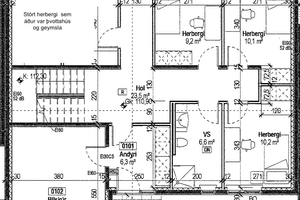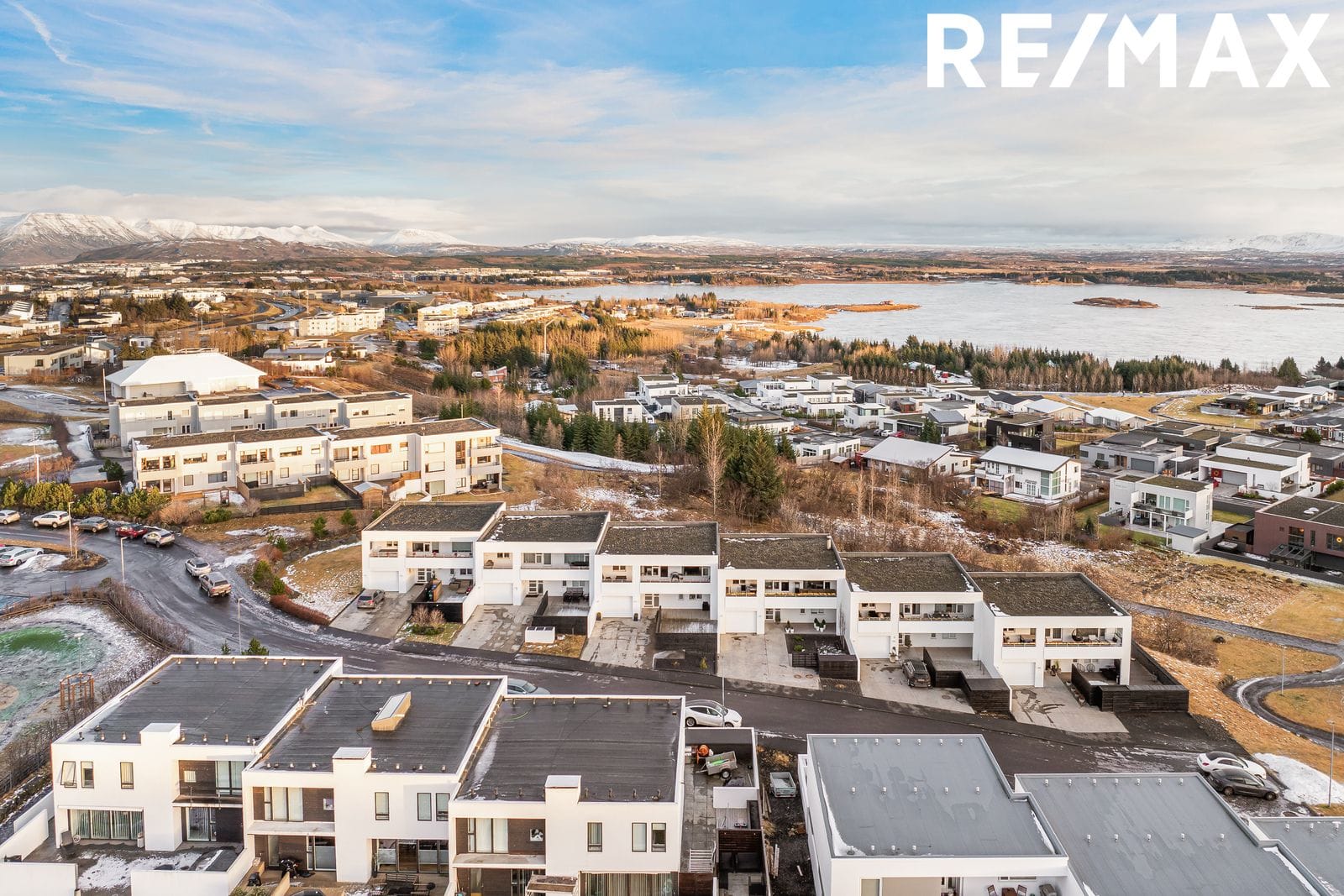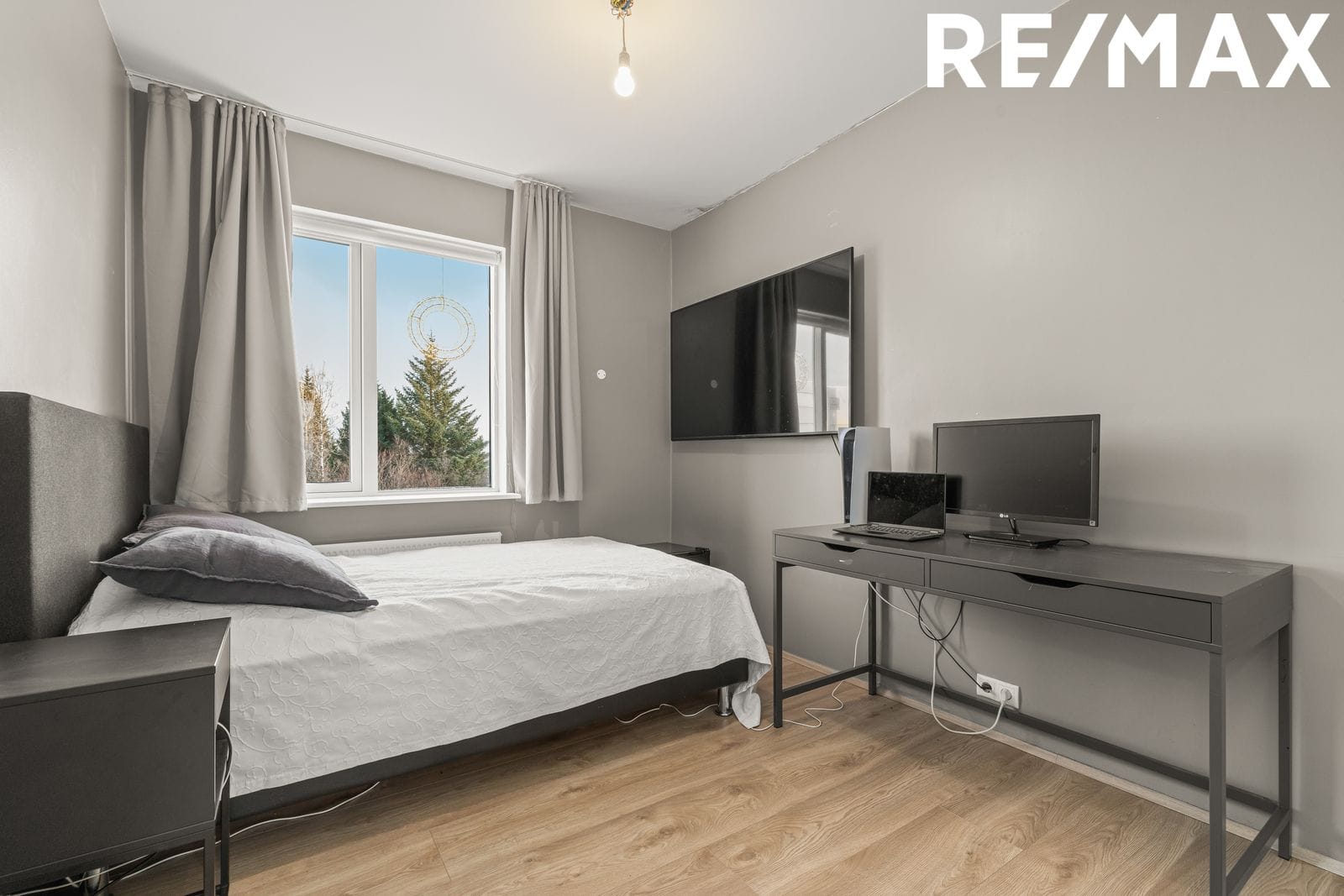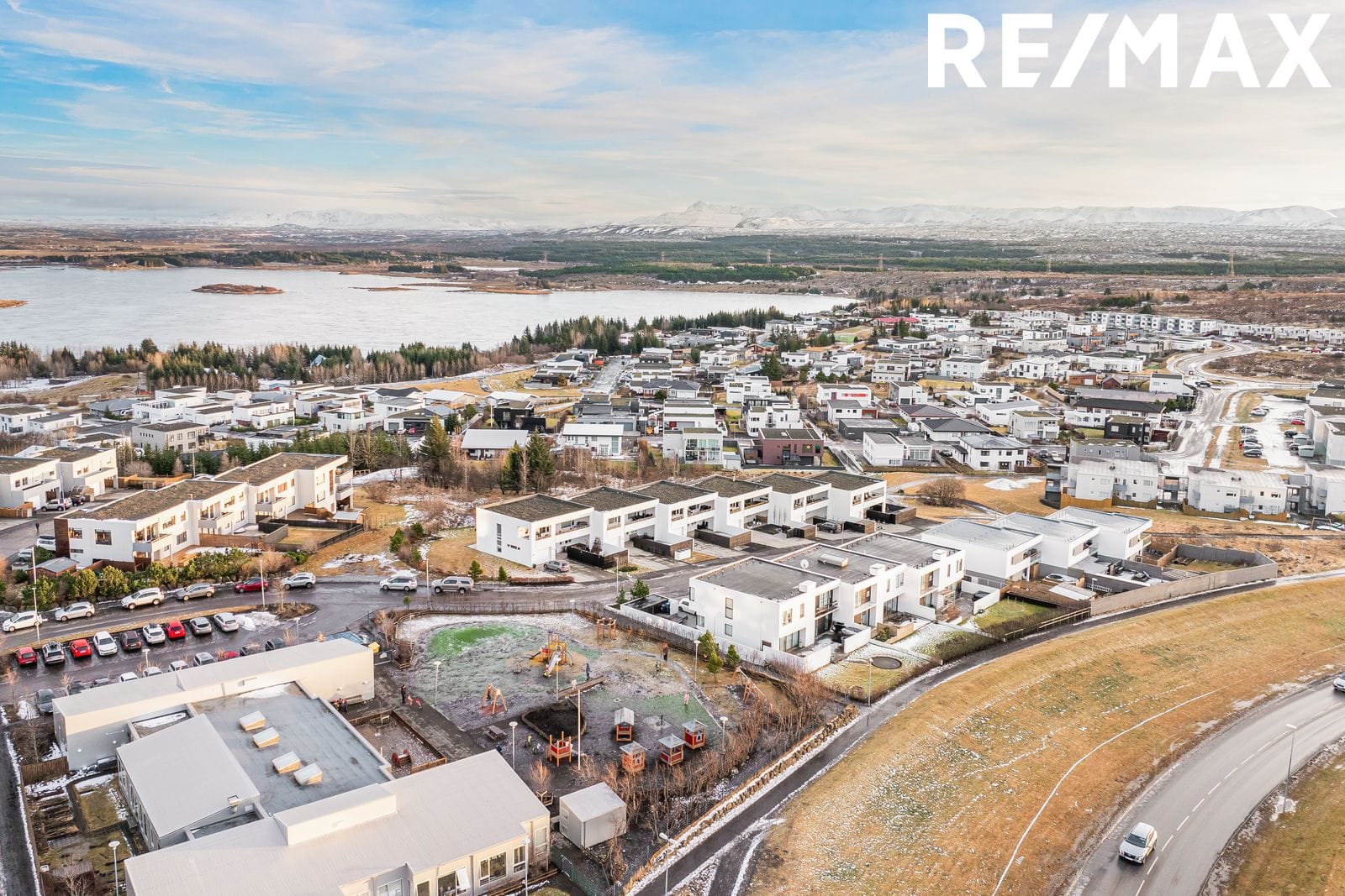 Um er að ræða fjölskylduvæna eign á eftirsóttum stað þar sem útivist, náttúra og þjónusta fara saman. Teikningar eignar sýna neðri hæð með forstofu, þremur svefnherbergjum, baðherbergi, geymslu, þvottahúsi og bílskúr. Breyting á neðri hæð er þannig að stórt herbergi hefur verið útbúið úr geymslu og þvottahúsi, og er því þvottaaðstaða nú í bílskúr þar sem tengi eru fyrir þvottavél og þurrkara.
