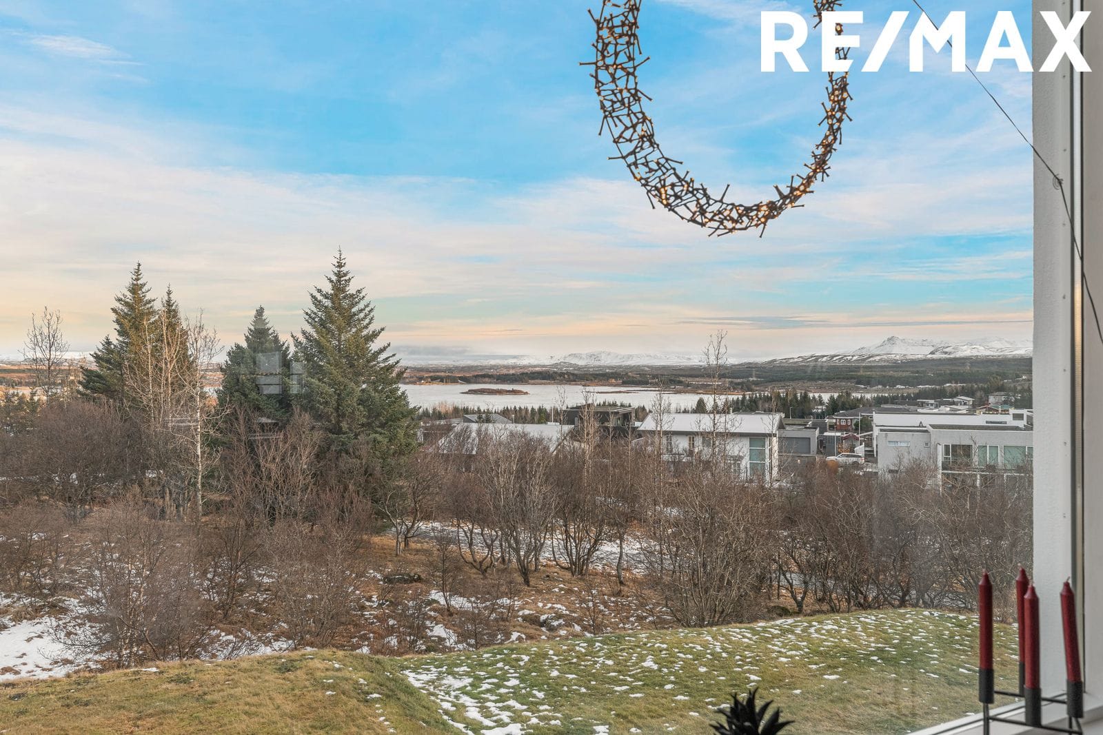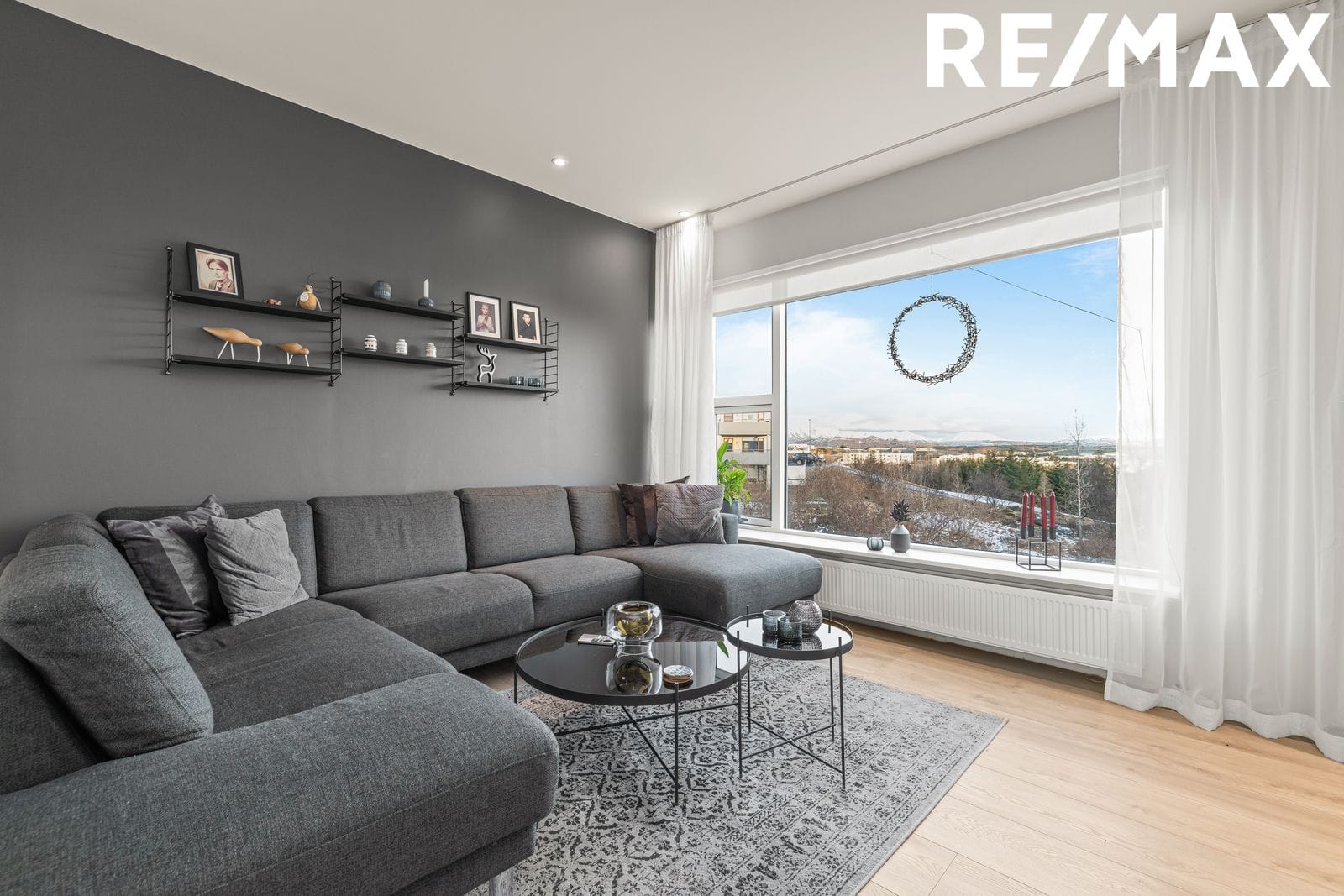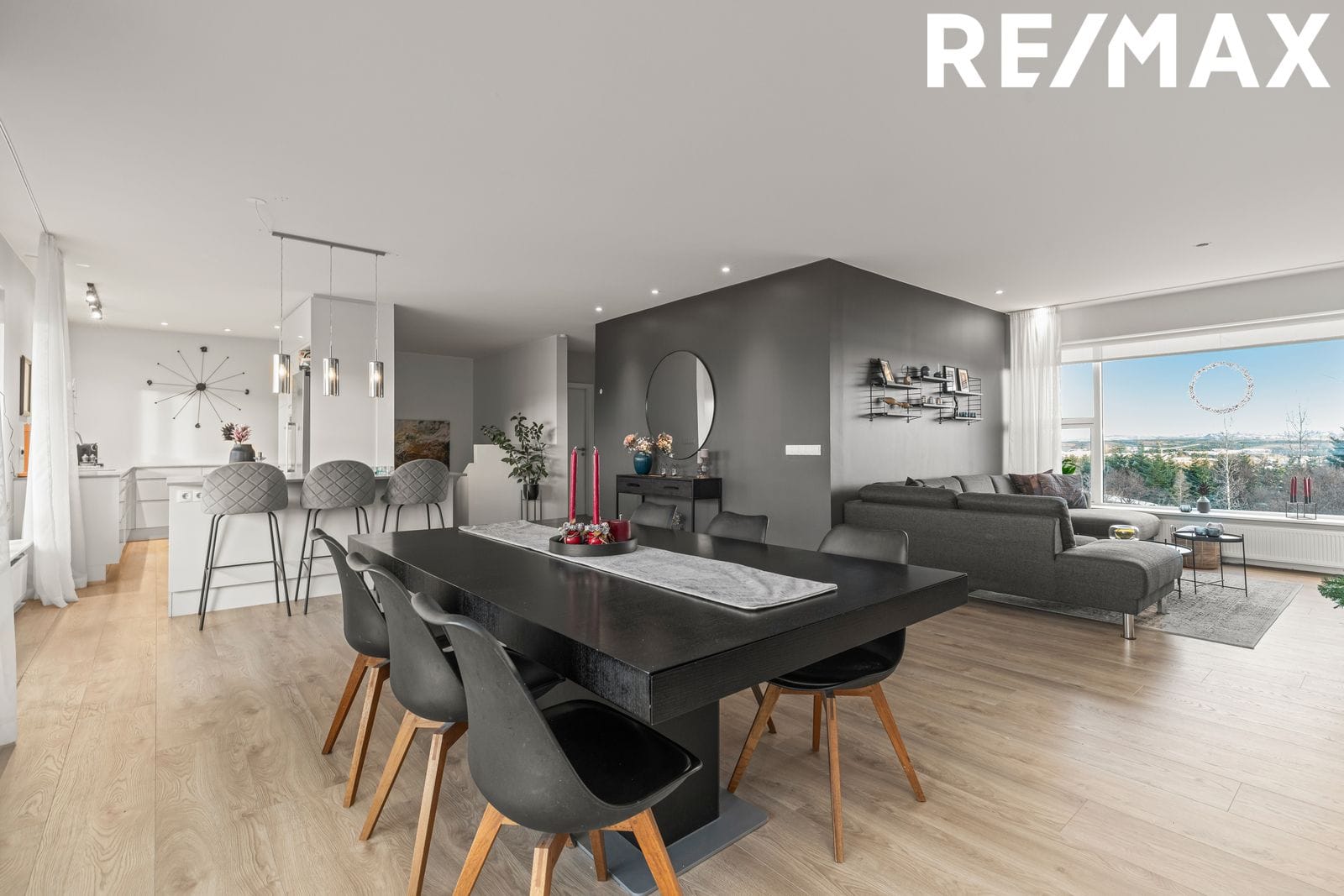 Stofa, borðstofa og eldhús eru í björtu, opnu samliggjandi rými með eikar harðparketi á gólfi, stórum gluggum til norð-austurs og suð-vesturs og einstöku útsýni yfir náttúruna við Elliðavatn og yfir Heiðmörk.