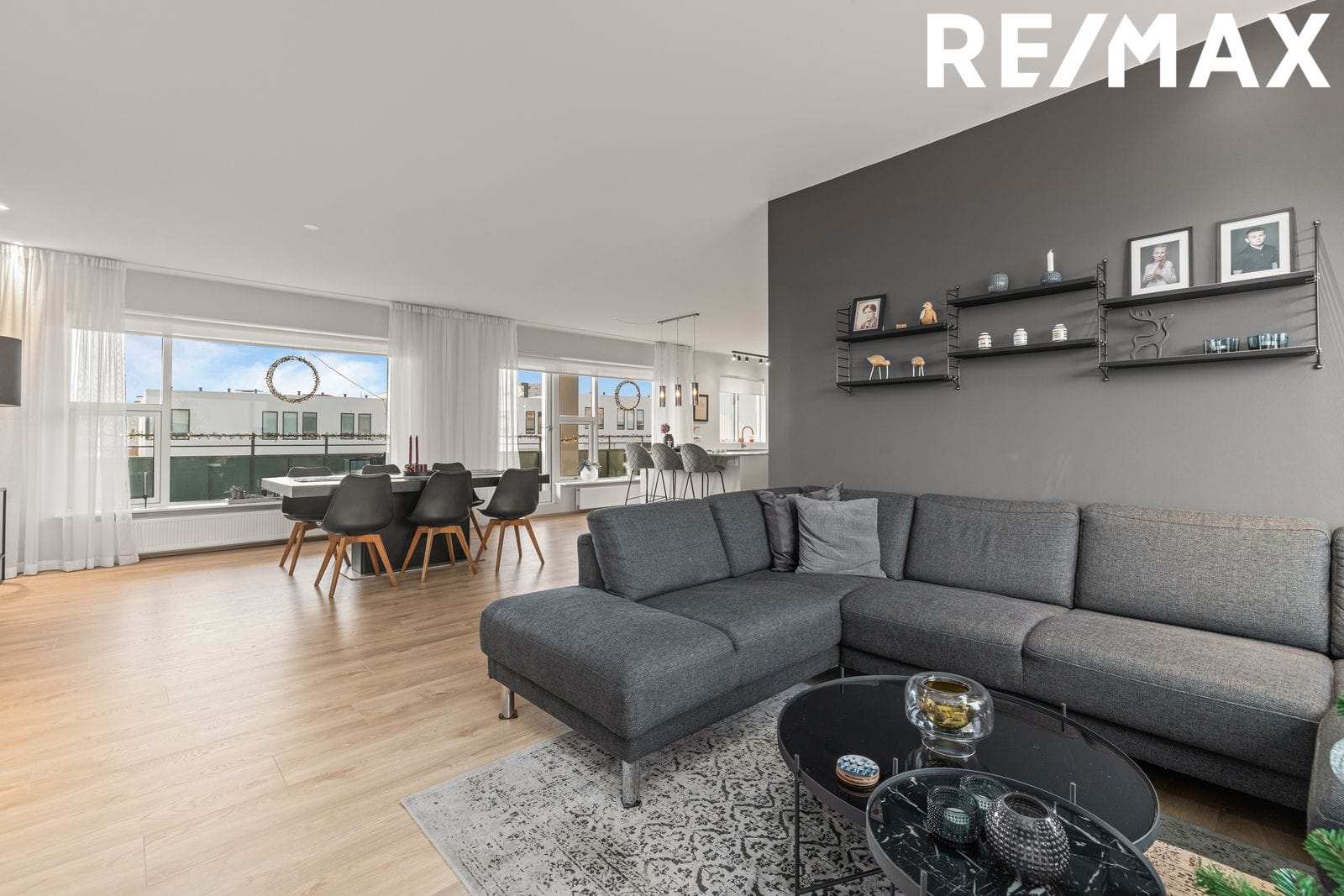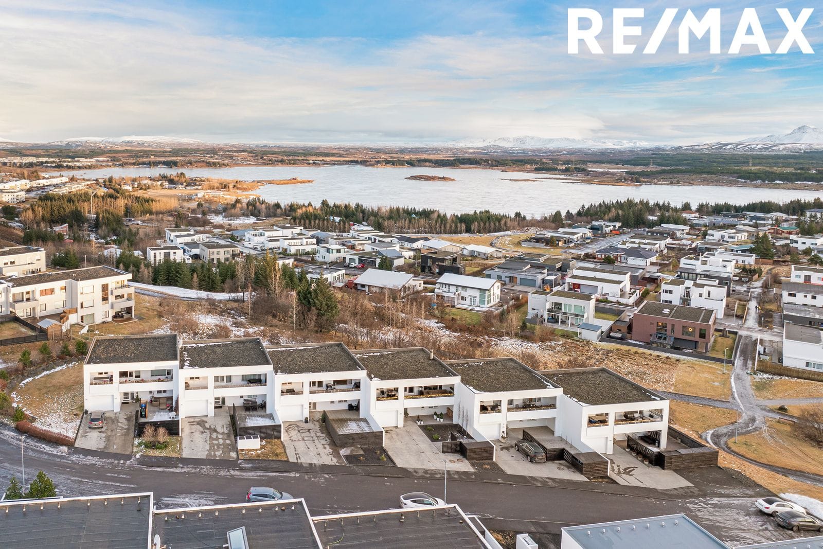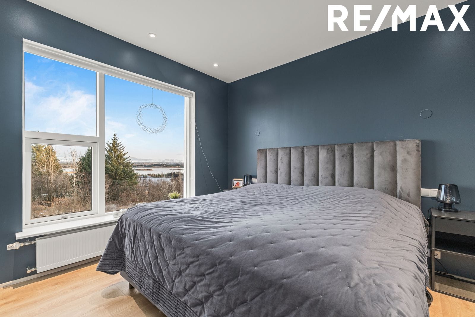 Stofa, borðstofa og eldhús eru í björtu, opnu samliggjandi rými með eikar harðparketi á gólfi, stórum gluggum til norð-austurs og suð-vesturs og einstöku útsýni yfir náttúruna við Elliðavatn og yfir Heiðmörk.