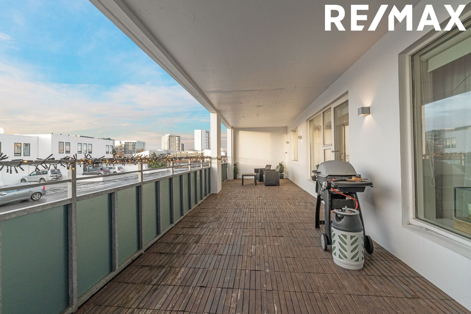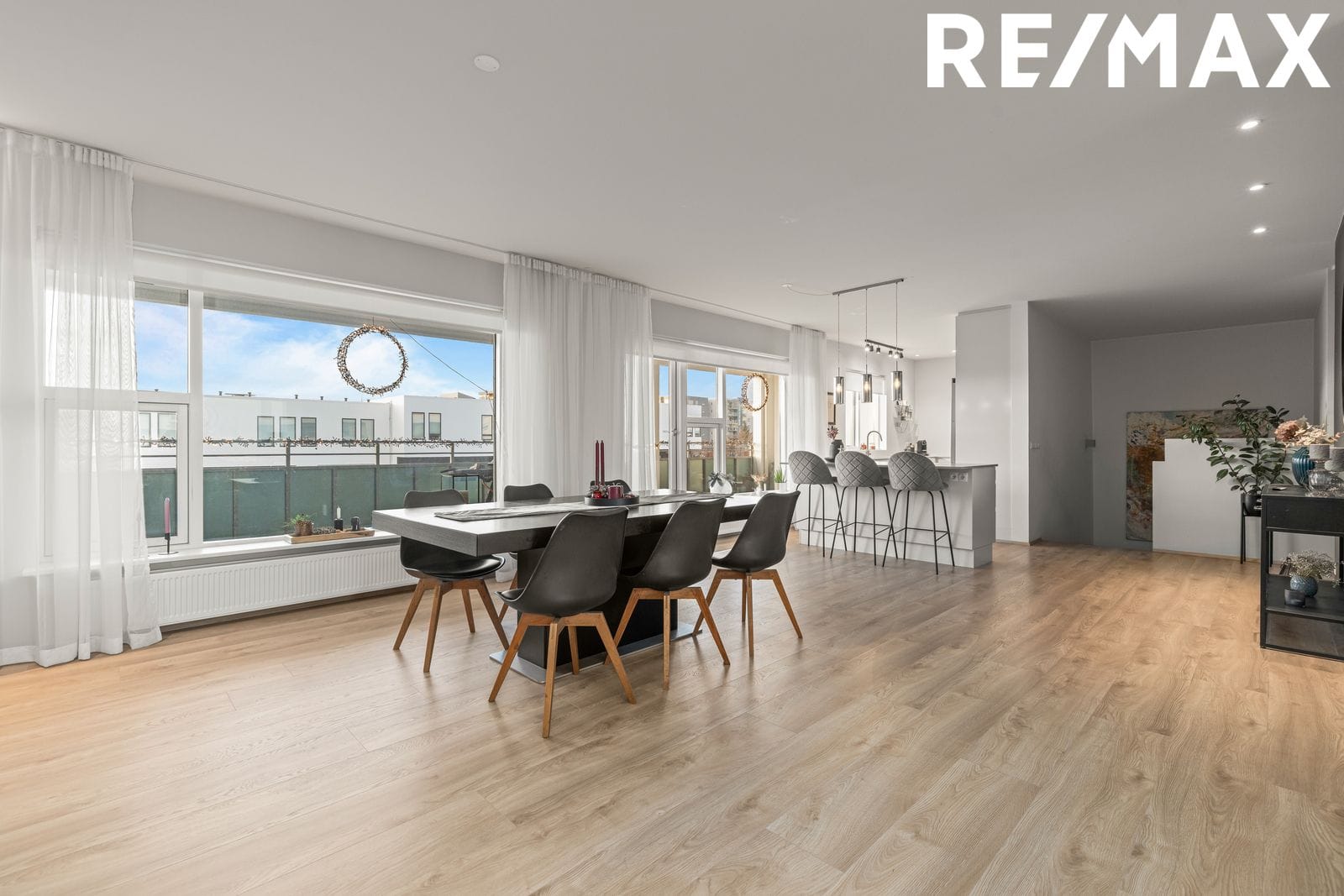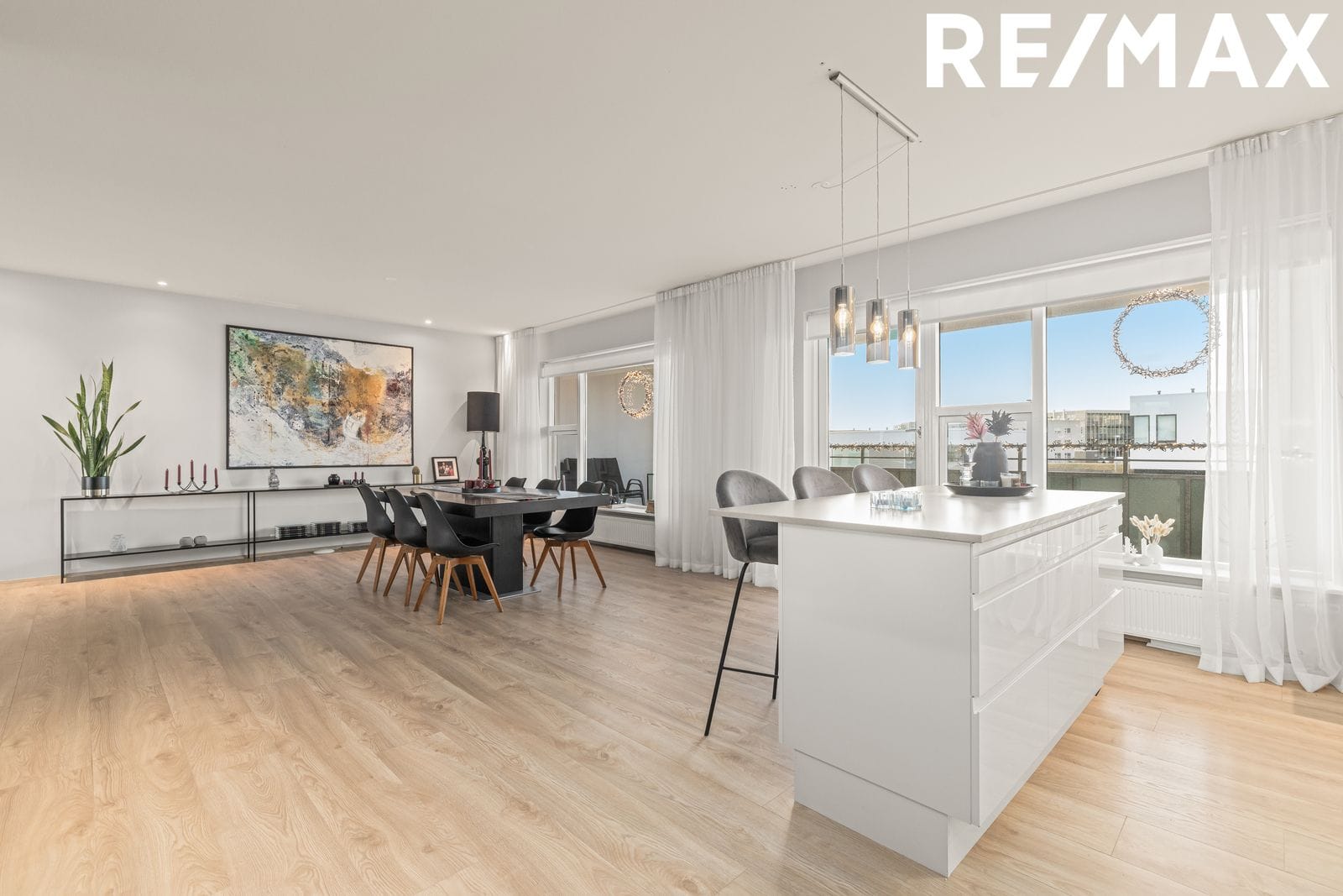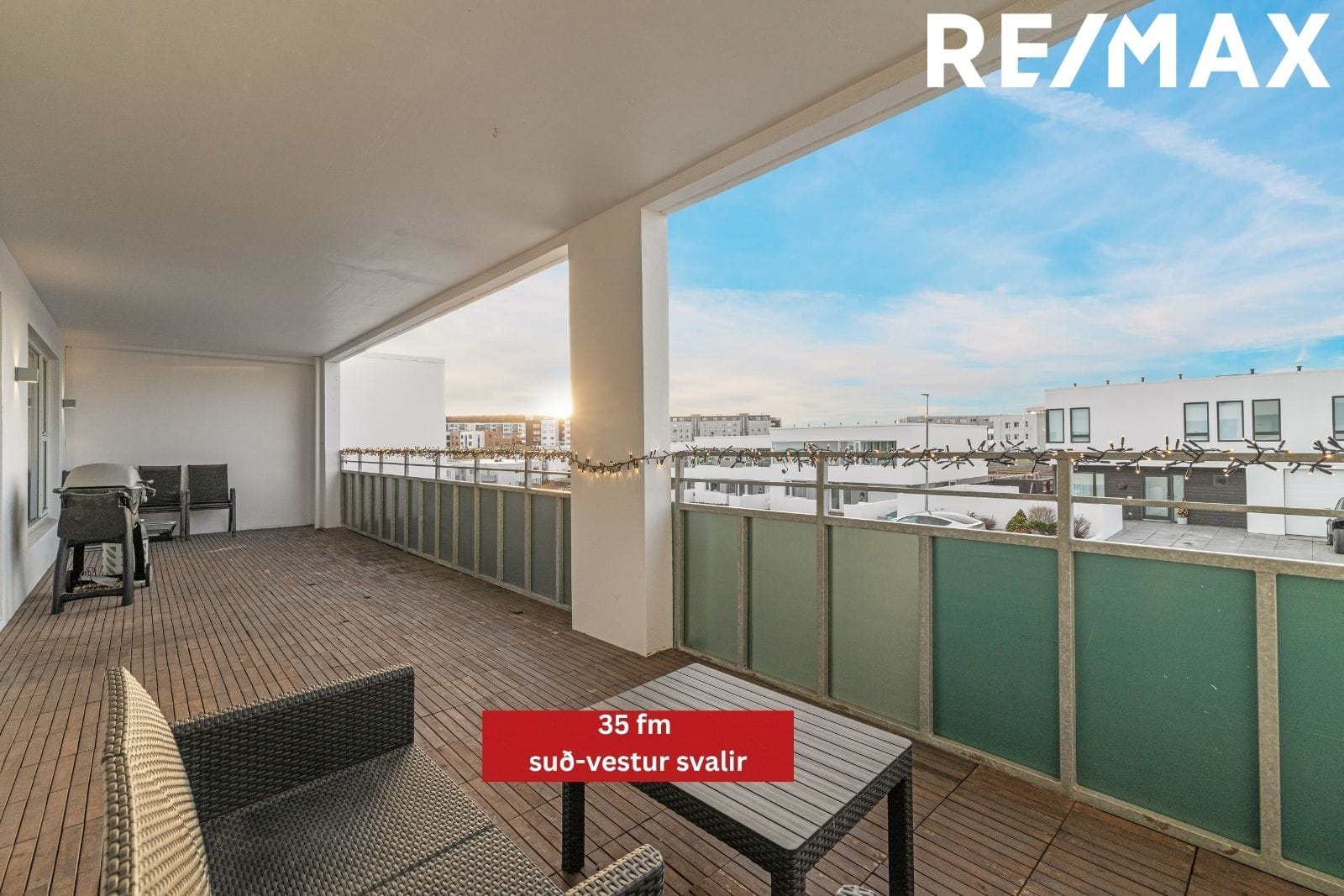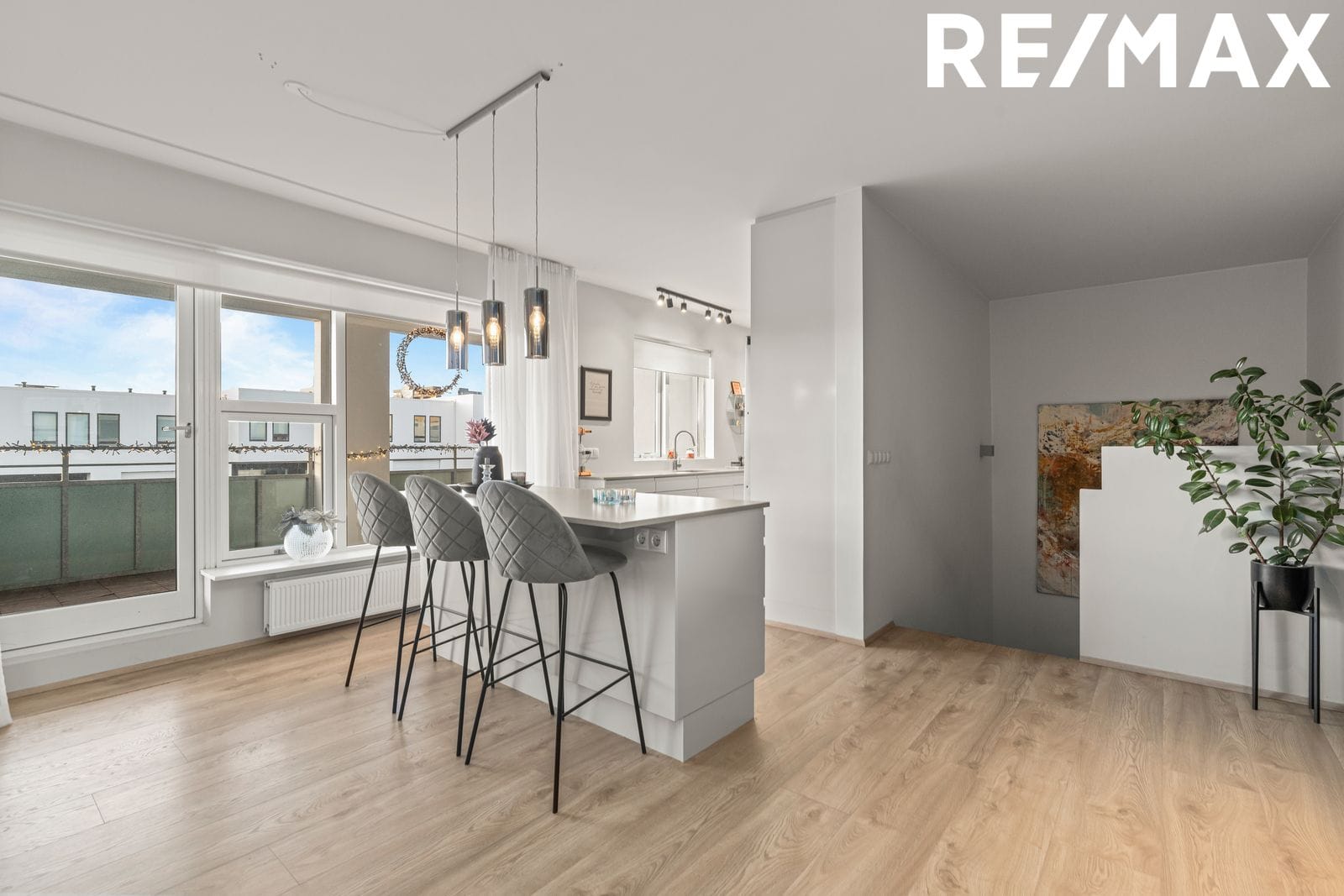 eldhúsinu er hvít innrétting frá HTH með virkilega góðu skápaplássi, innbyggðri uppþvottavél, góðum tækjum og quartz-steini frá Granítsmiðjunni sett á 2025. Úr eldhúsi er útgengt á svalir til suðurs sem liggja meðfram allri suðurhlið hússins og skapa einstaklega góða útivistaraðstöðu.