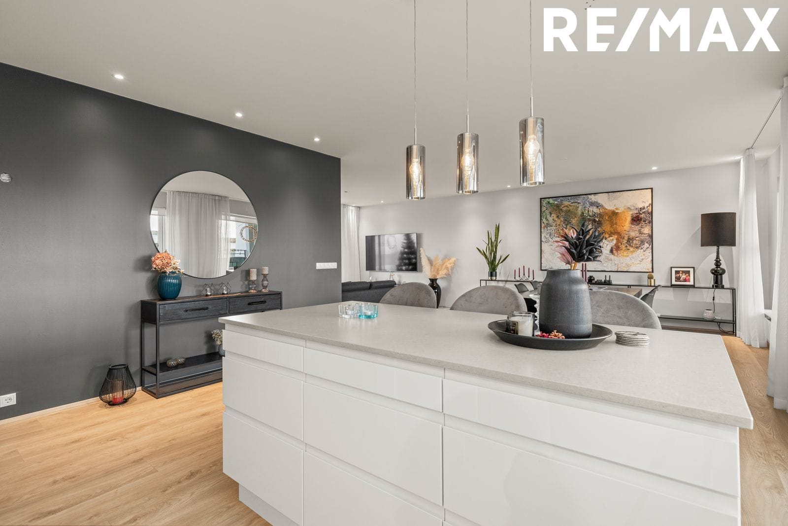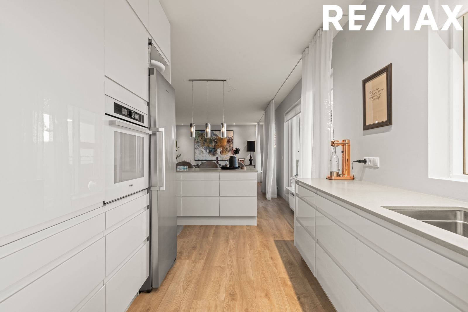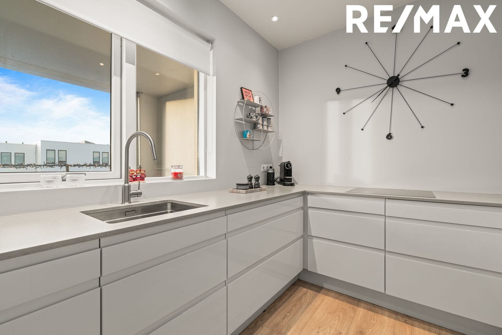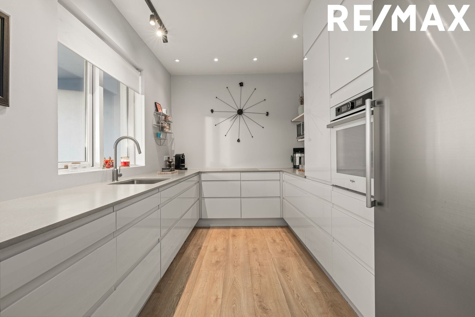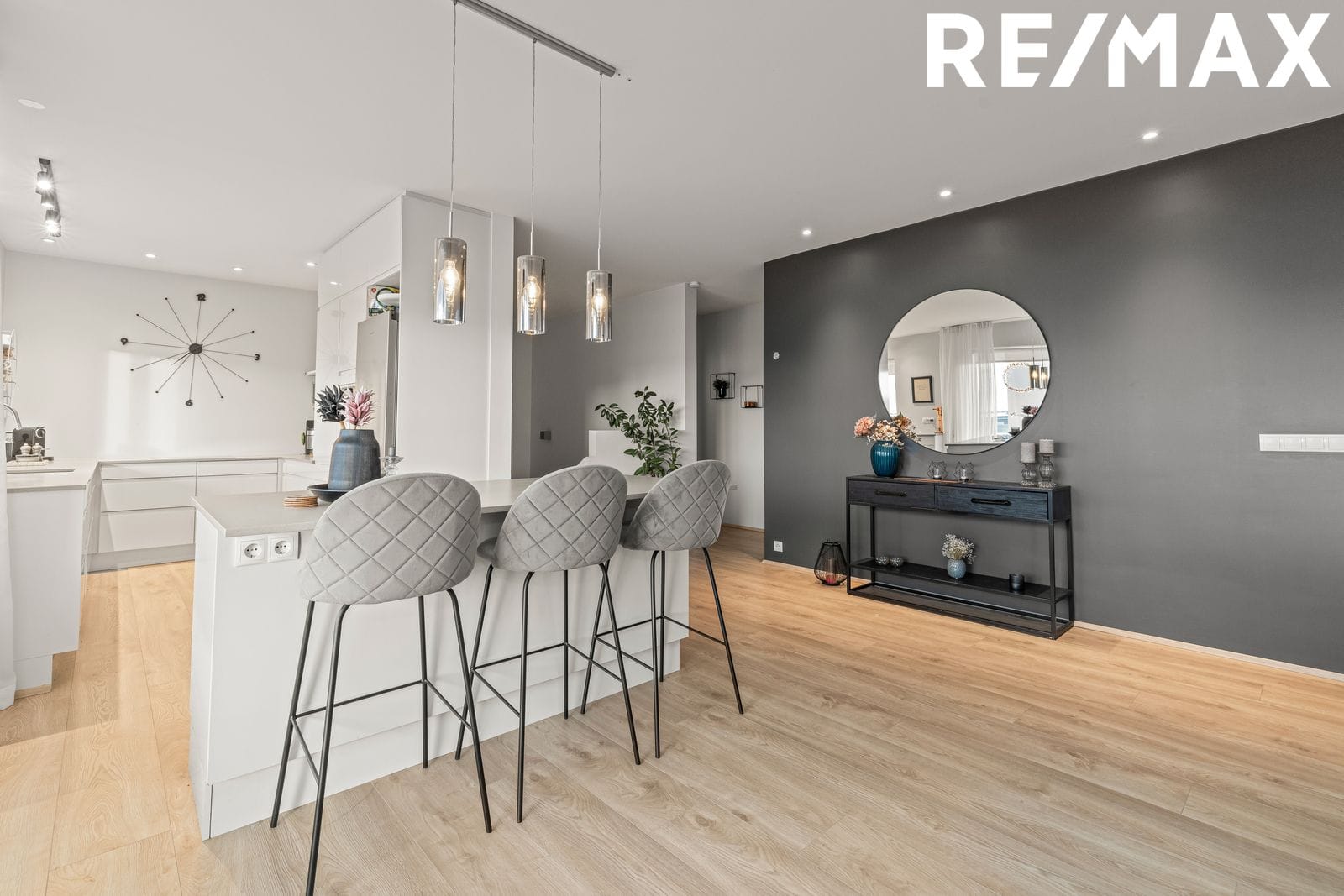 eldhúsinu er hvít innrétting frá HTH með virkilega góðu skápaplássi, innbyggðri uppþvottavél, góðum tækjum og quartz-steini frá Granítsmiðjunni sett á 2025. Úr eldhúsi er útgengt á svalir til suðurs sem liggja meðfram allri suðurhlið hússins og skapa einstaklega góða útivistaraðstöðu.