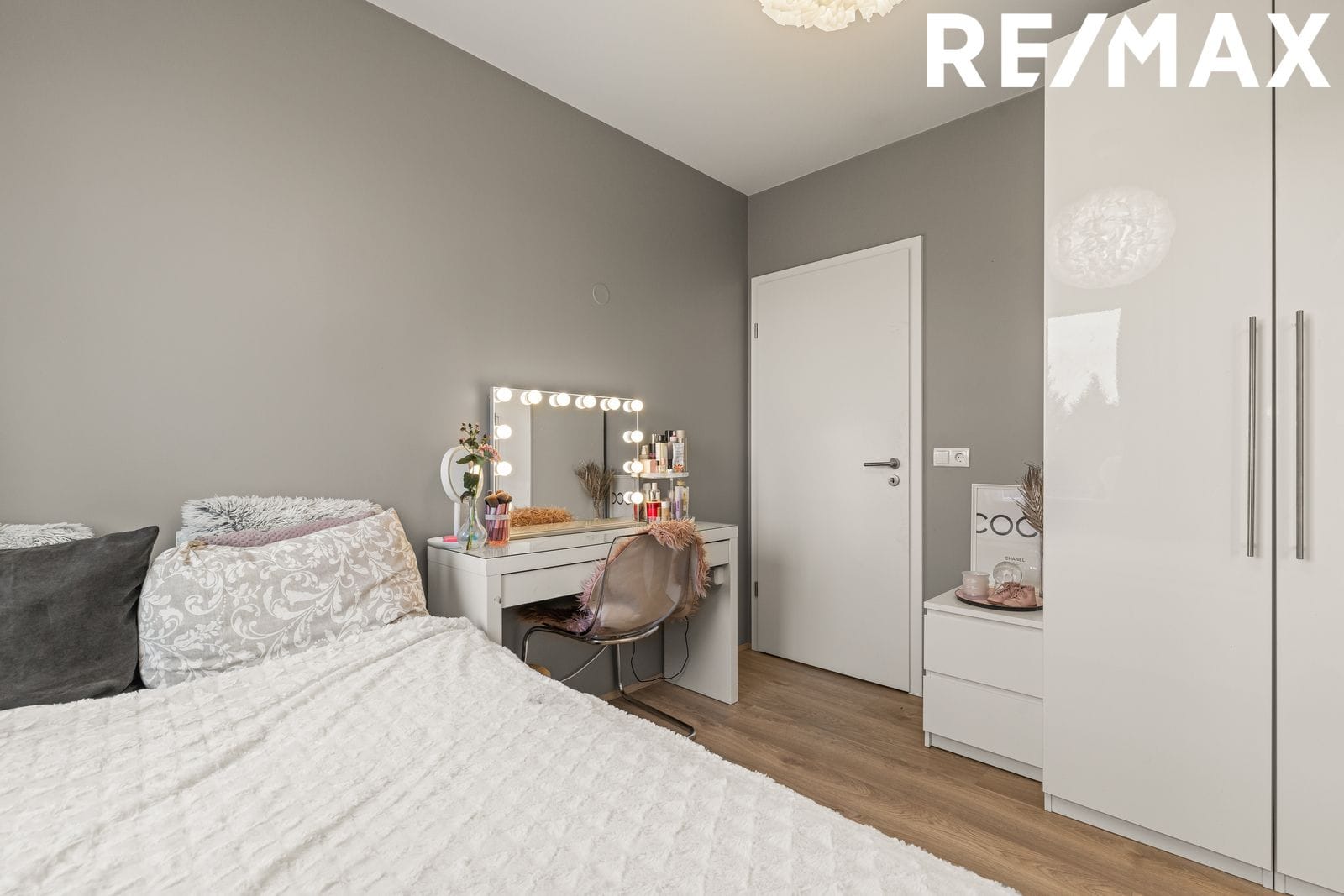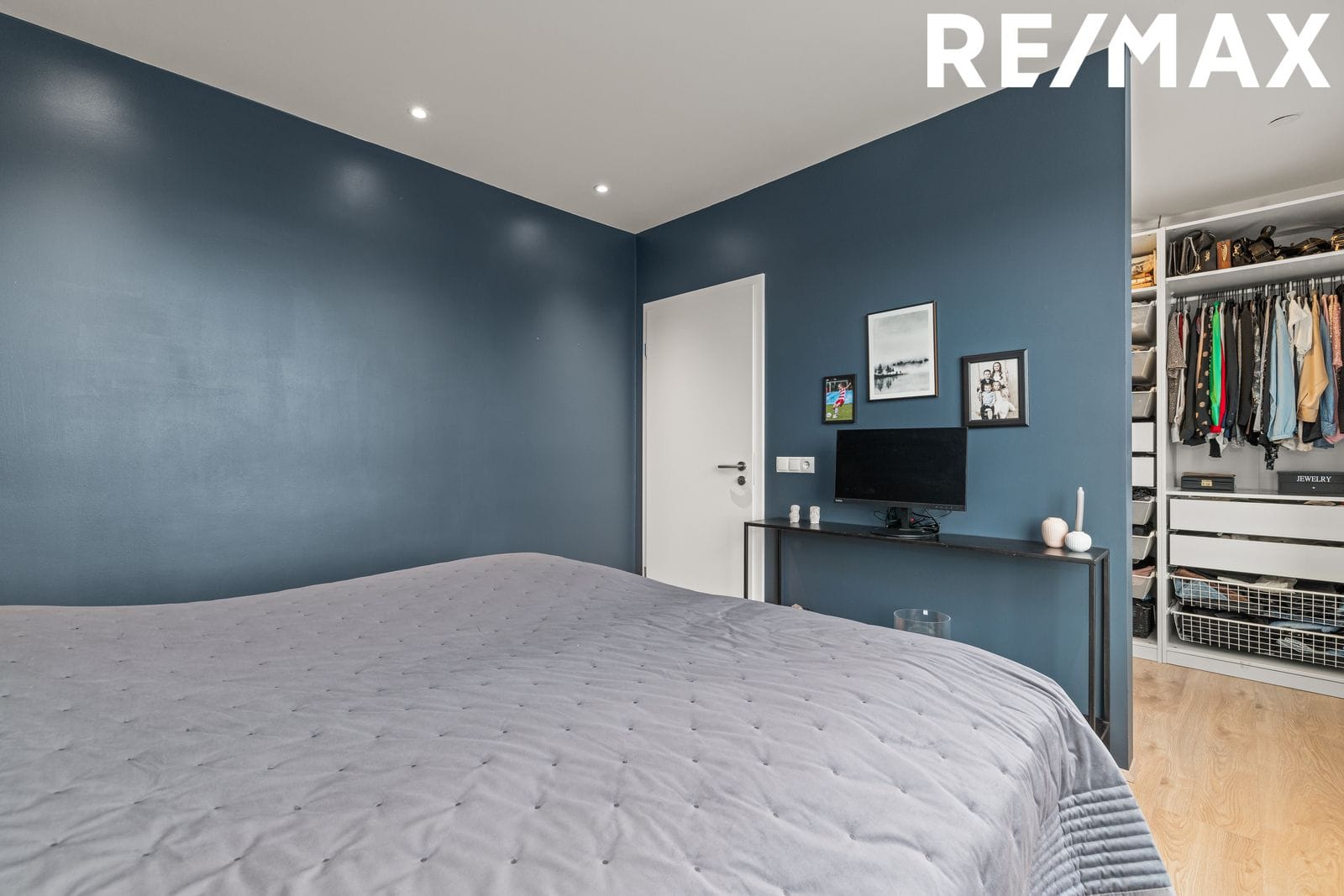 Hjónaherbergi er rúmgott með sér fataherbergi og parketi á gólfi.