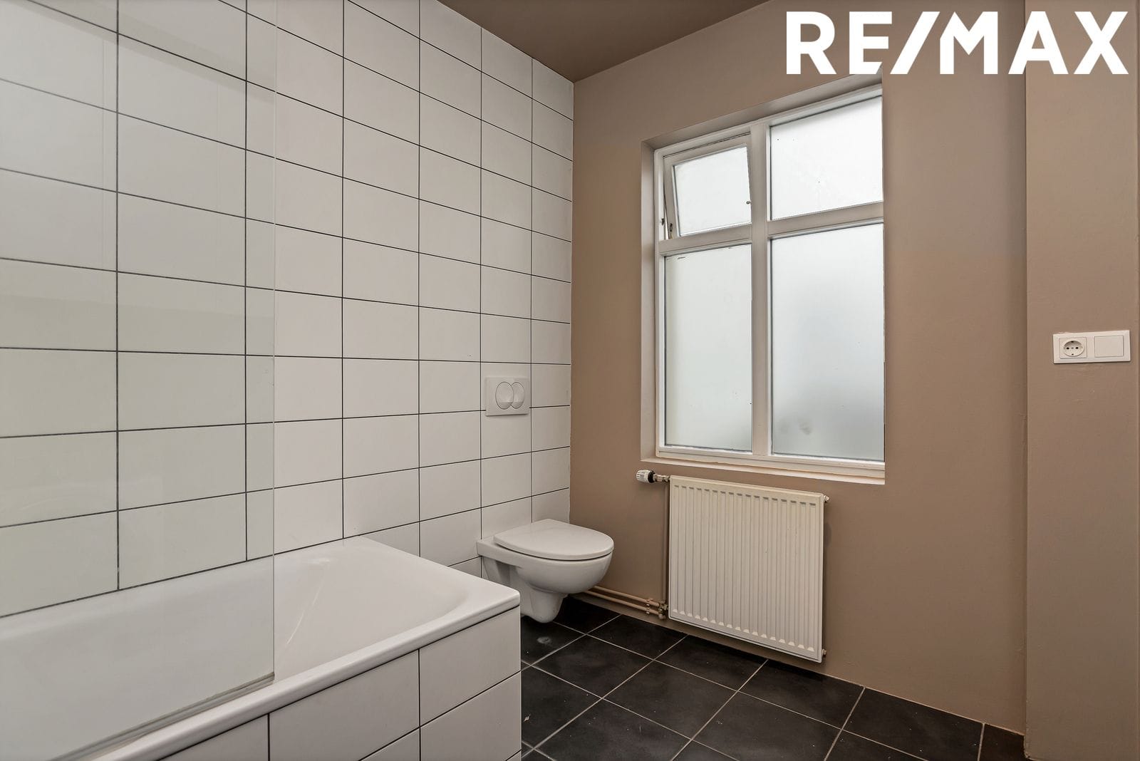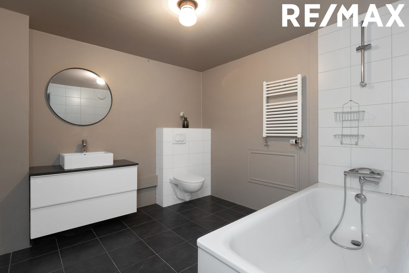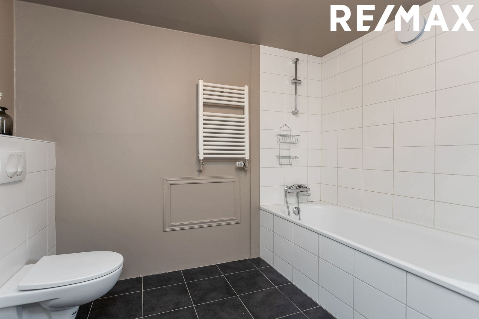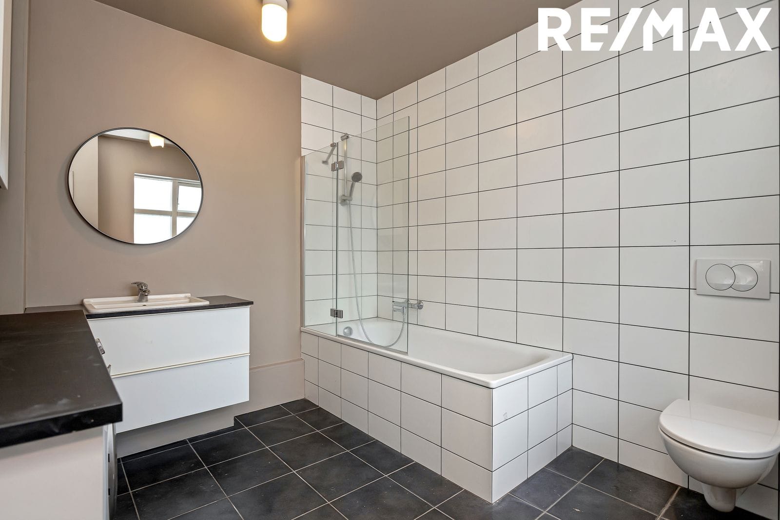 Baðherbergi: Flísalagt baðherbergi með baðkari, innréttingu með handlaug, upphengdu salerni og tengi fyrir þvottavél.