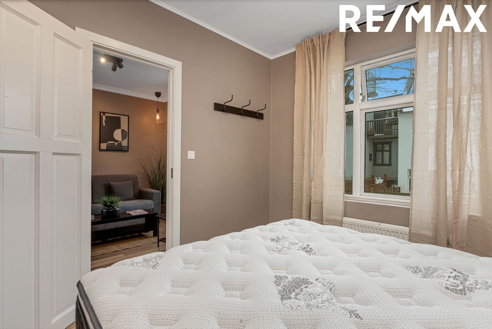 Svefnherbergi: Rúmgott svefnherbergi staðsett innar í íbúðinni með parketi á gólfi.
