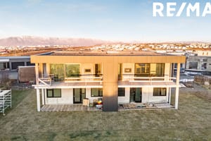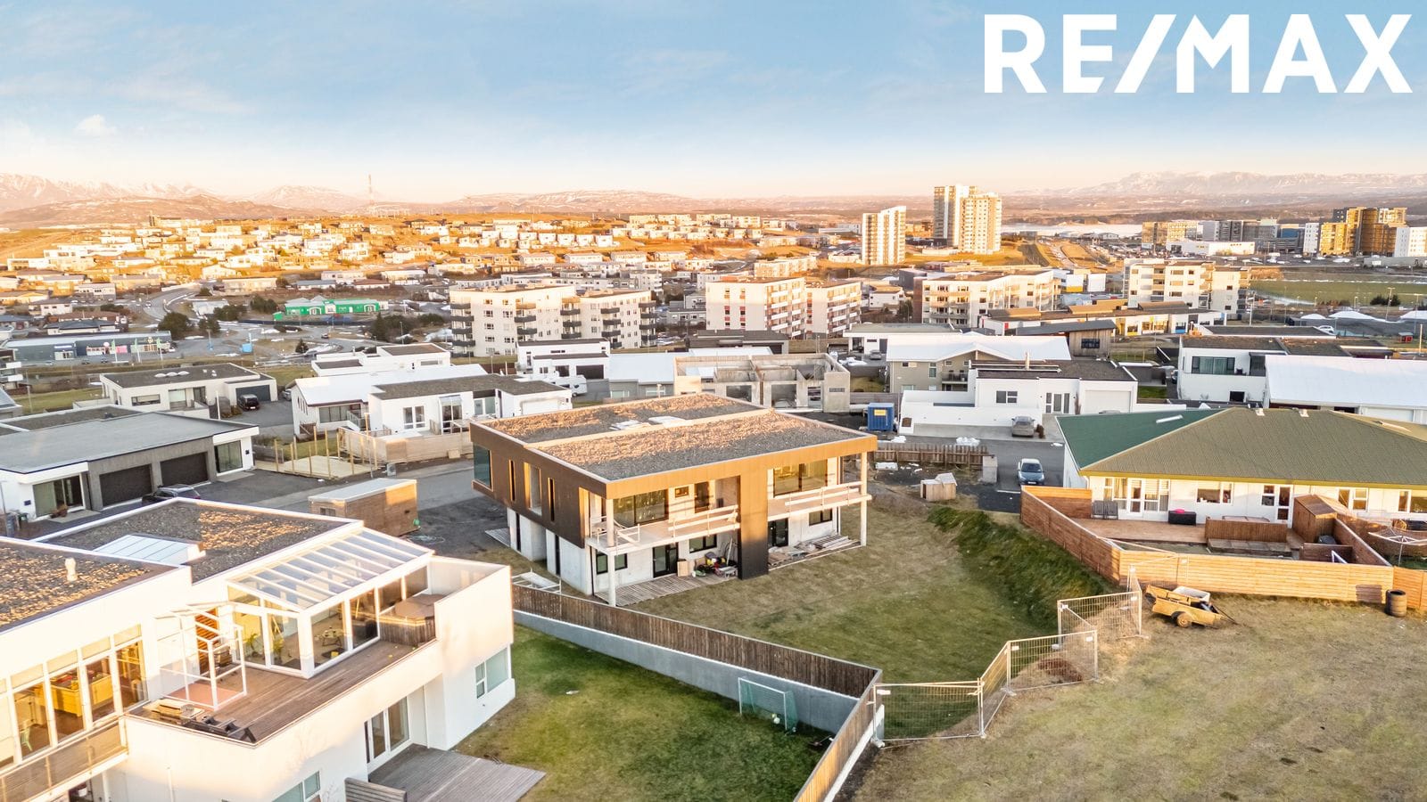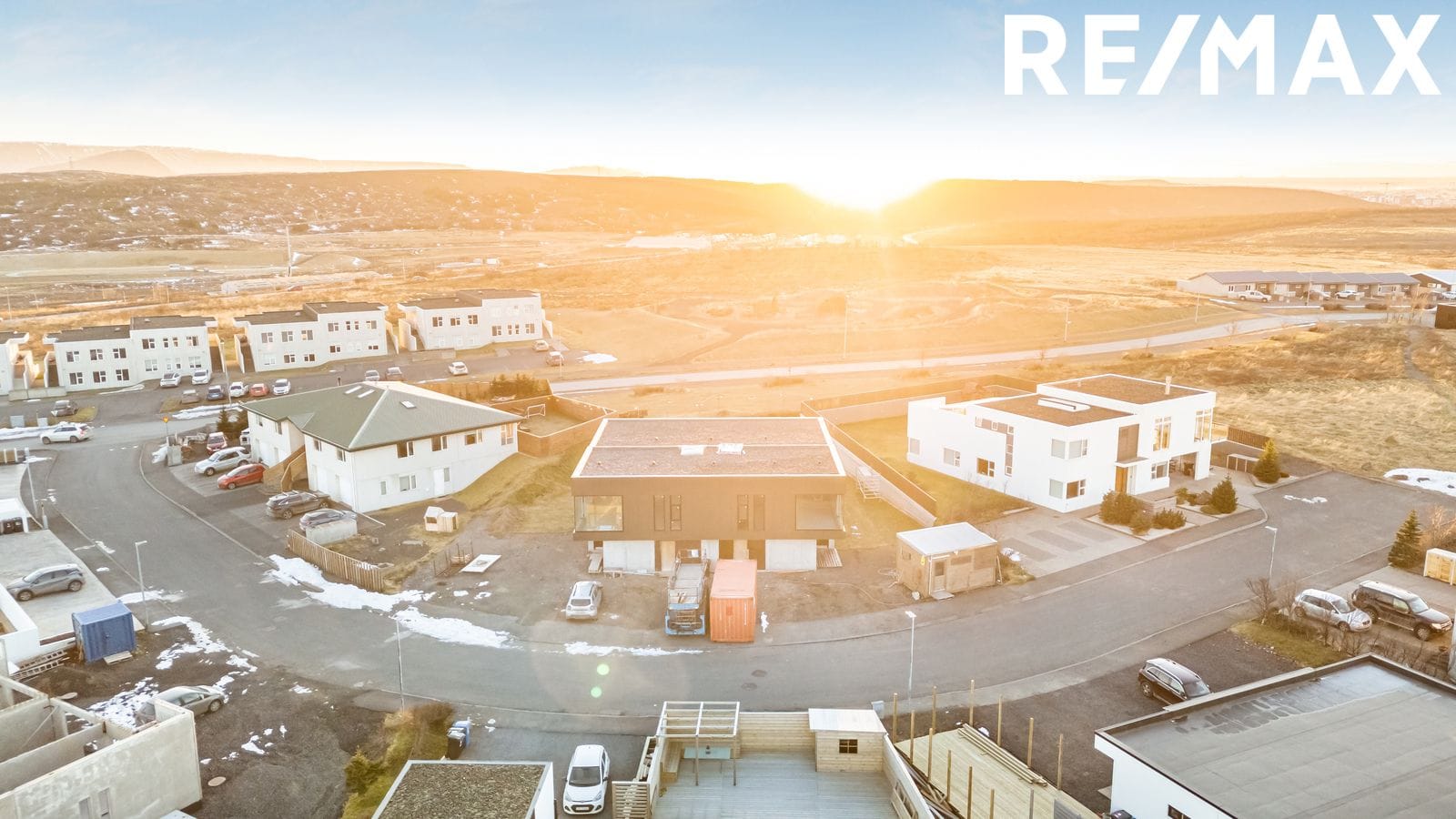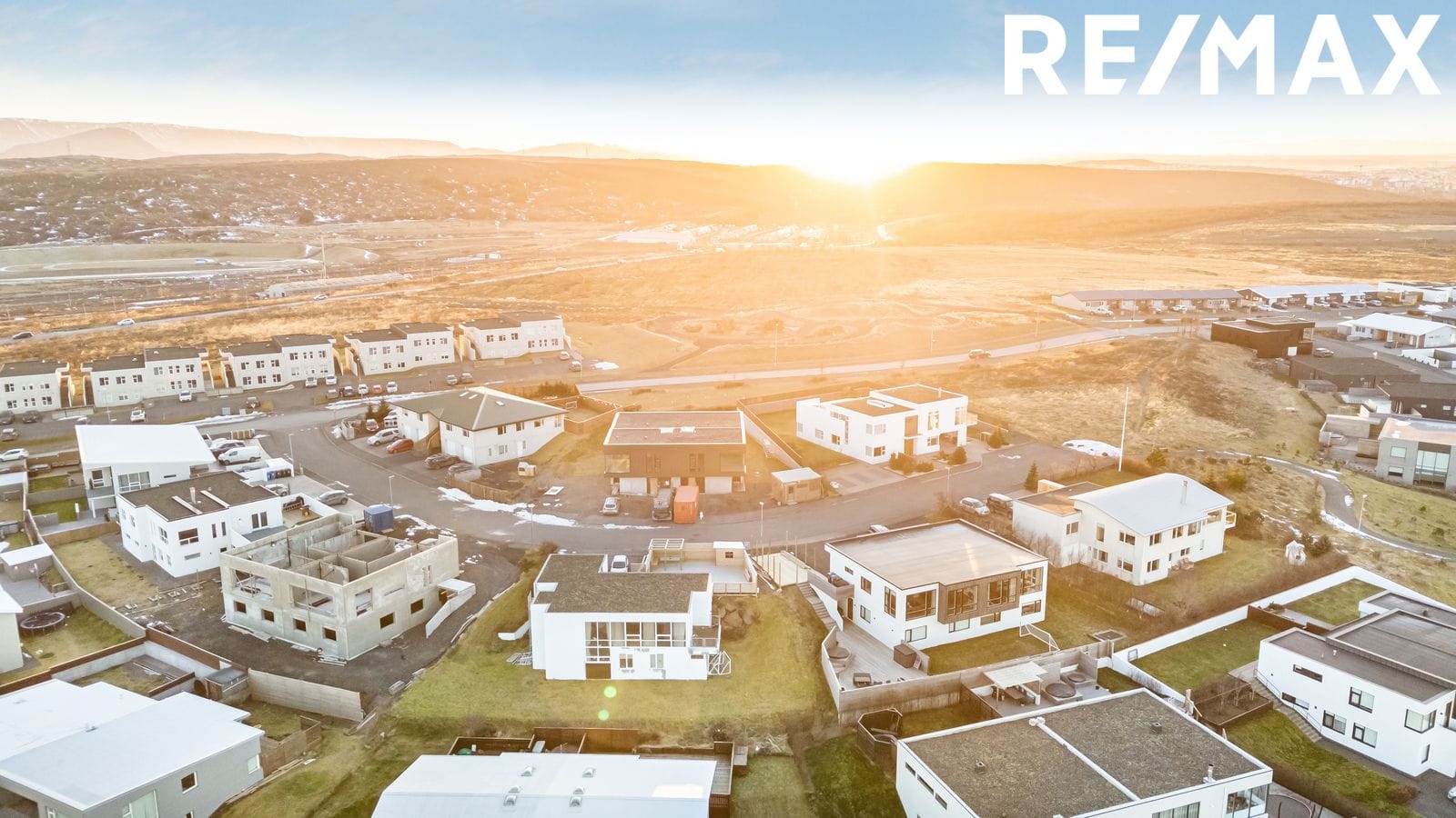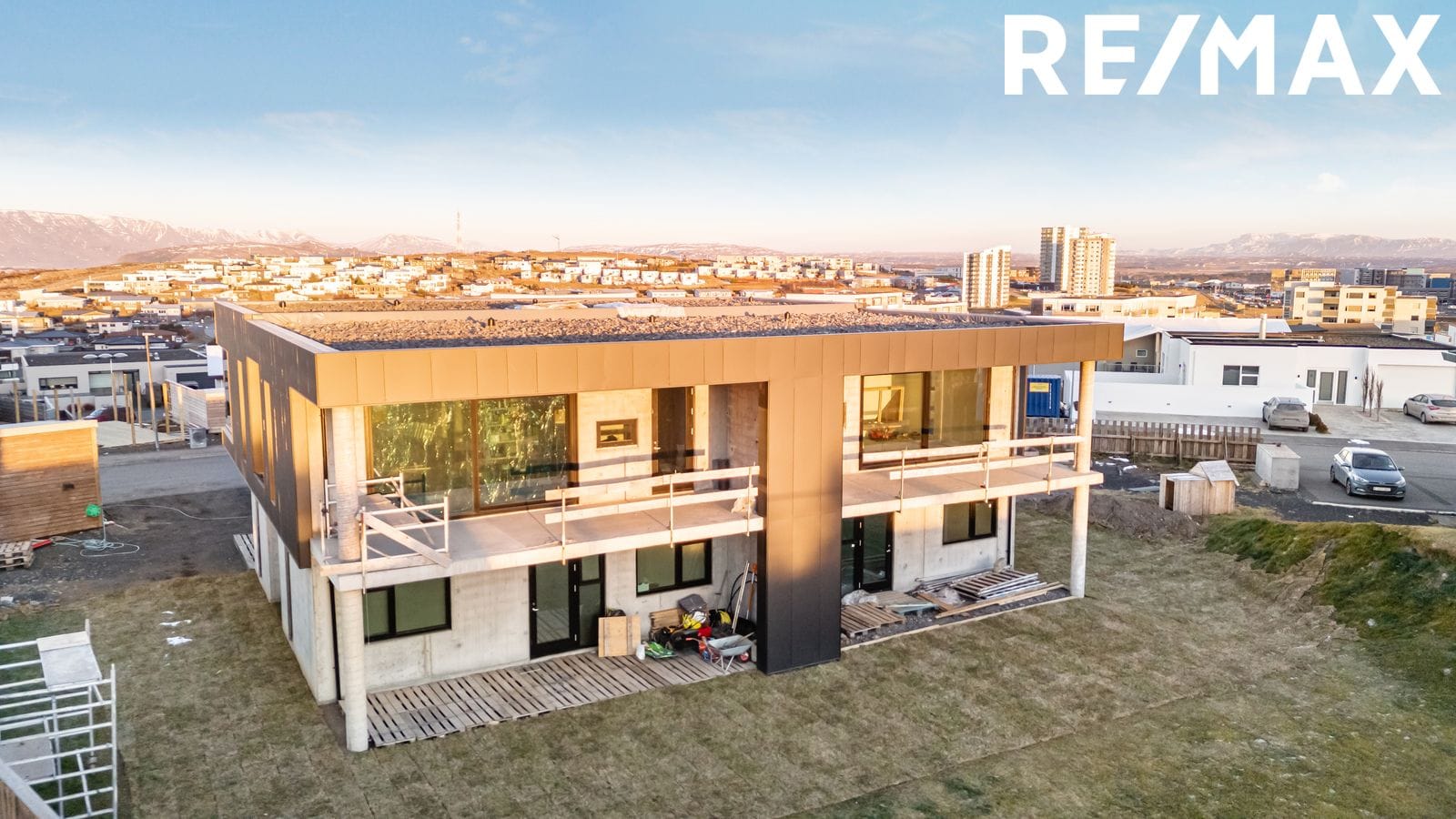 Á skyggni á framhlið og á svölum verður sett steinull og klæðning sem verður svört Japanese wood. Samkvæmt teikningu skiptist neðri hæð í forstofu, gang með útgönguhurð, þvottahús, 3 svefnherbergi, baðherbergi með útgönguhurð til suðurs þar sem gert verður ráð fyrir heitum potti og innbyggður rúmgóður bílskúr með geymslu inn af. Á efri hæð skiptist húsið í eldhús/borðstofu þar sem gert er ráð fyrir eldhúseyju, stór rennihurð út á stórar 21,9 m2 suður svalir með hitalögnum í svalagólfinu ásamt gönguhurð úr eldhúsi, stofu með glæsilegum stórum útsýnis hornglugga án gluggapósta til að útsýnið njóti sín óskert. Gert er ráð fyrir arni í stofu, aðrar svalir úr holi beint á móti stiga, fljótandi stigi er á milli hæða sem kaupandi sér um að klára og flota stigapall í rétta hæð.