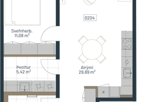Íbúð 204: Rúmgóð og björt tveggja herbergja, 71,4 m2 íbúð á annari hæð. Víðsýnt til austurs, gólfsíðir gluggar í stofu. Vandað Bambus pallaefni á svalagólfi. Sér þvottahús innan íbúðar með veglegri innréttingu. Sér 4,9 m2 geymsla í sameign.