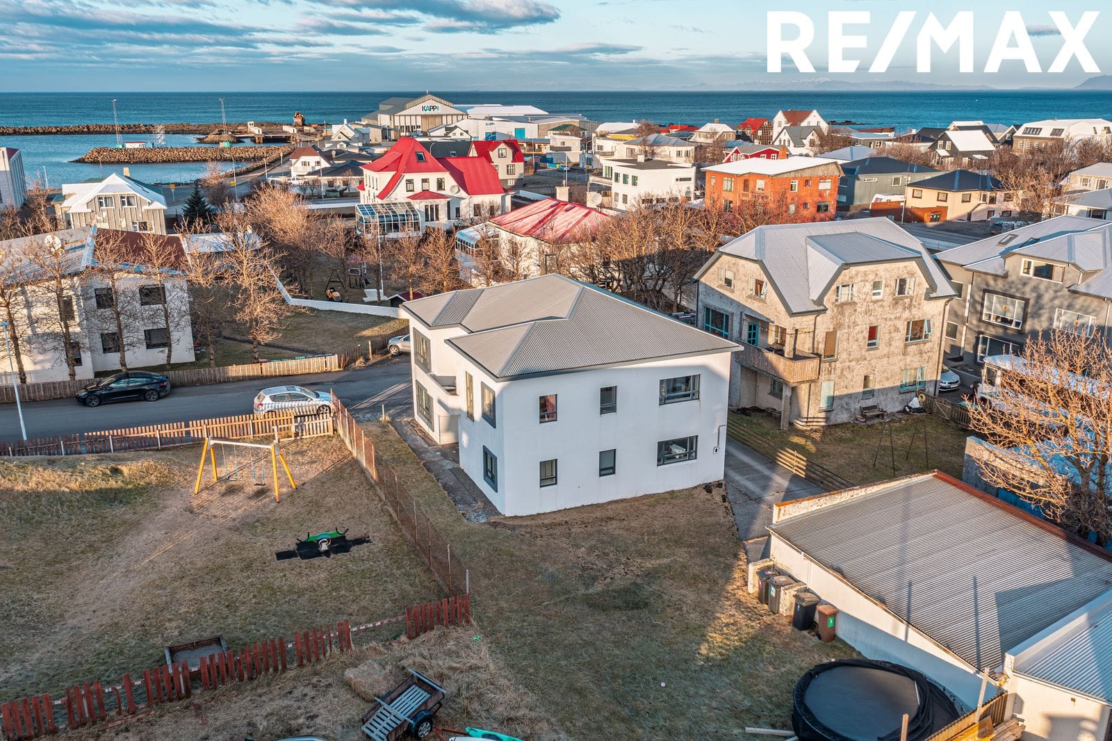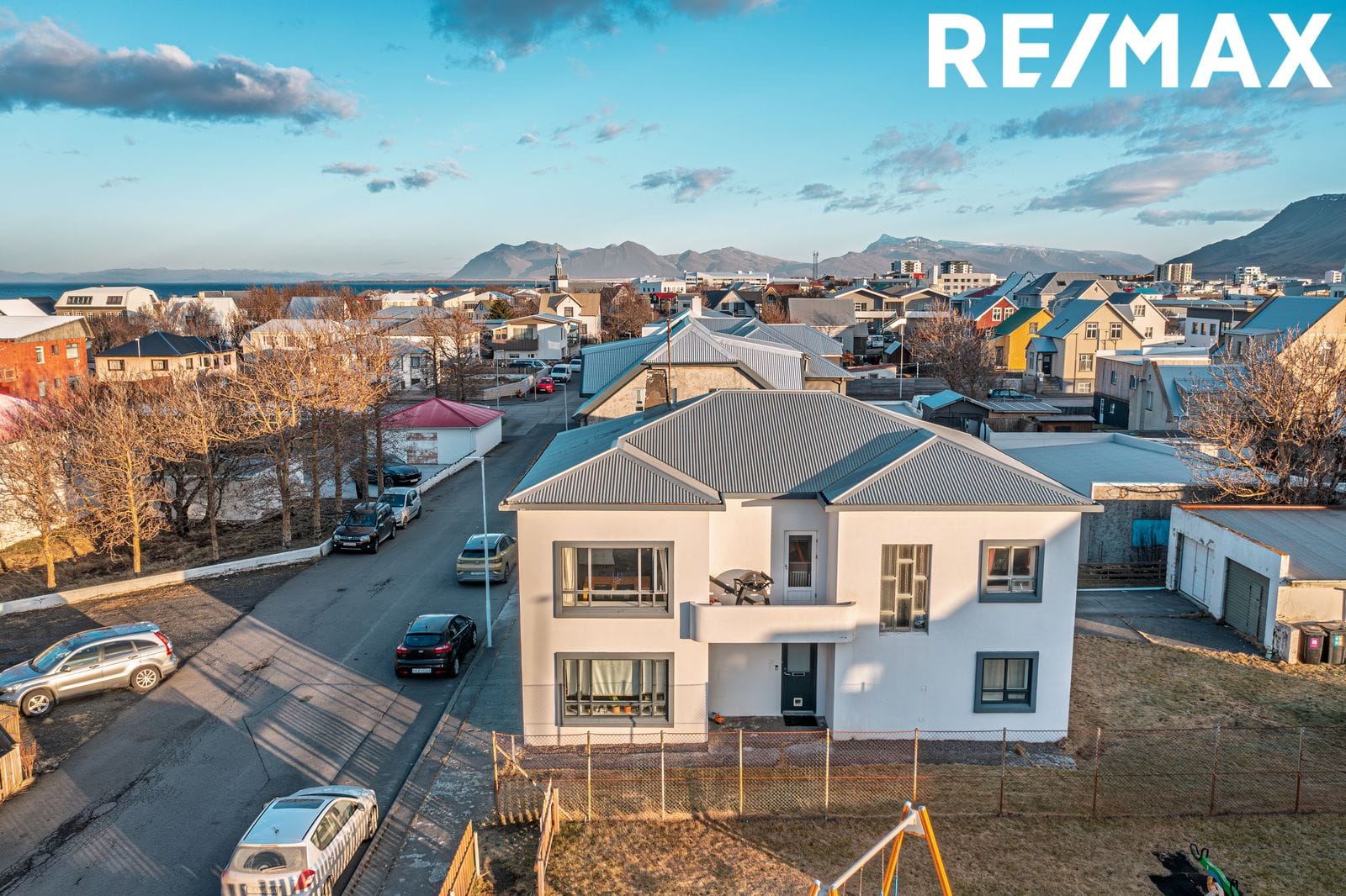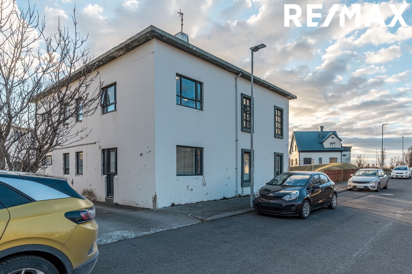 Húsið er steinsteypt, tvær hæðir og geymsla/loft á þriðju hæð sem tilheyrir íbúðinni á efri hæð. Þak er valmaþak. Anddyri er sameiginlegt með íbúð á neðri hæð.