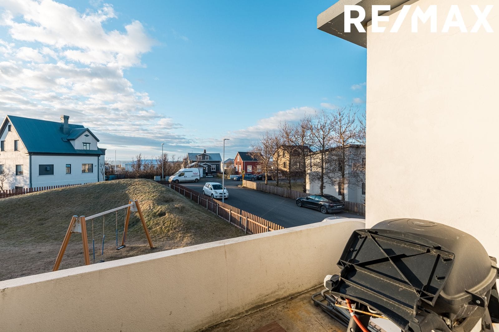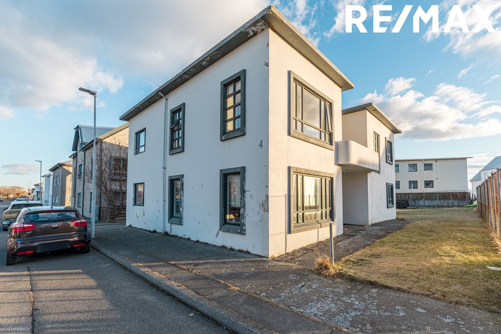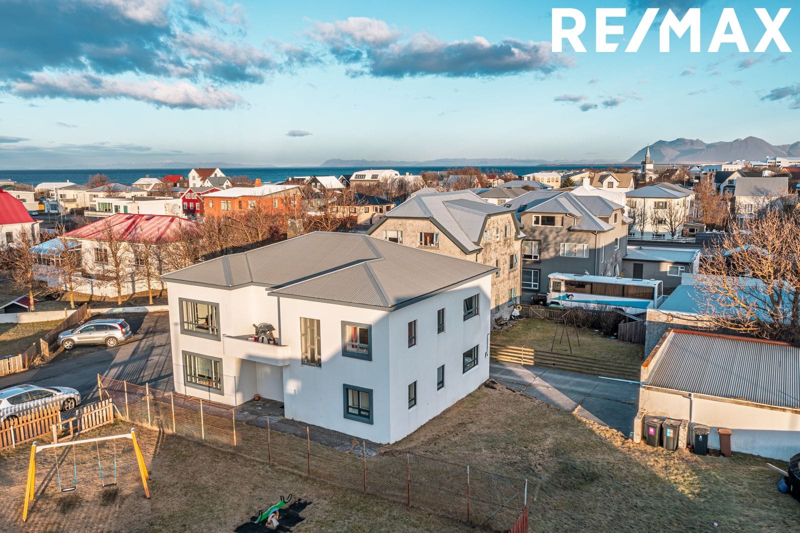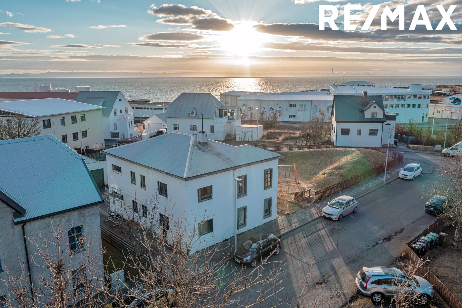 Húsið er steinsteypt, tvær hæðir og geymsla/loft á þriðju hæð sem tilheyrir íbúðinni á efri hæð. Þak er valmaþak. Anddyri er sameiginlegt með íbúð á neðri hæð.