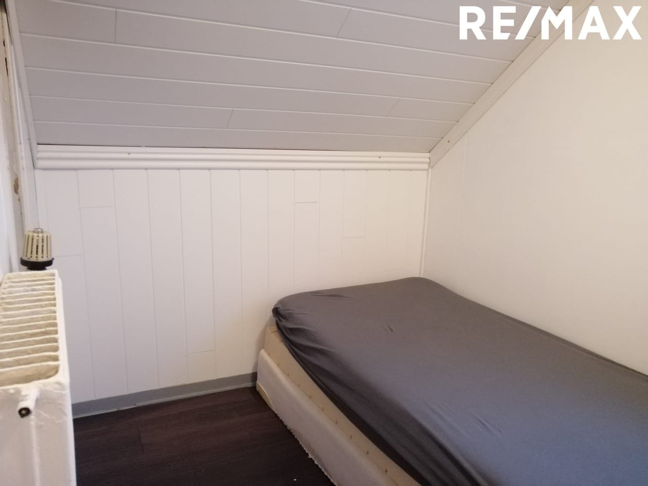 Svefnherbergi II - Annað svefnherbergi á hæðinni með dökku parketi á gólfi og panelklæðningu á veggjum. Gluggi veitir náttúruljós og gott útsýni.