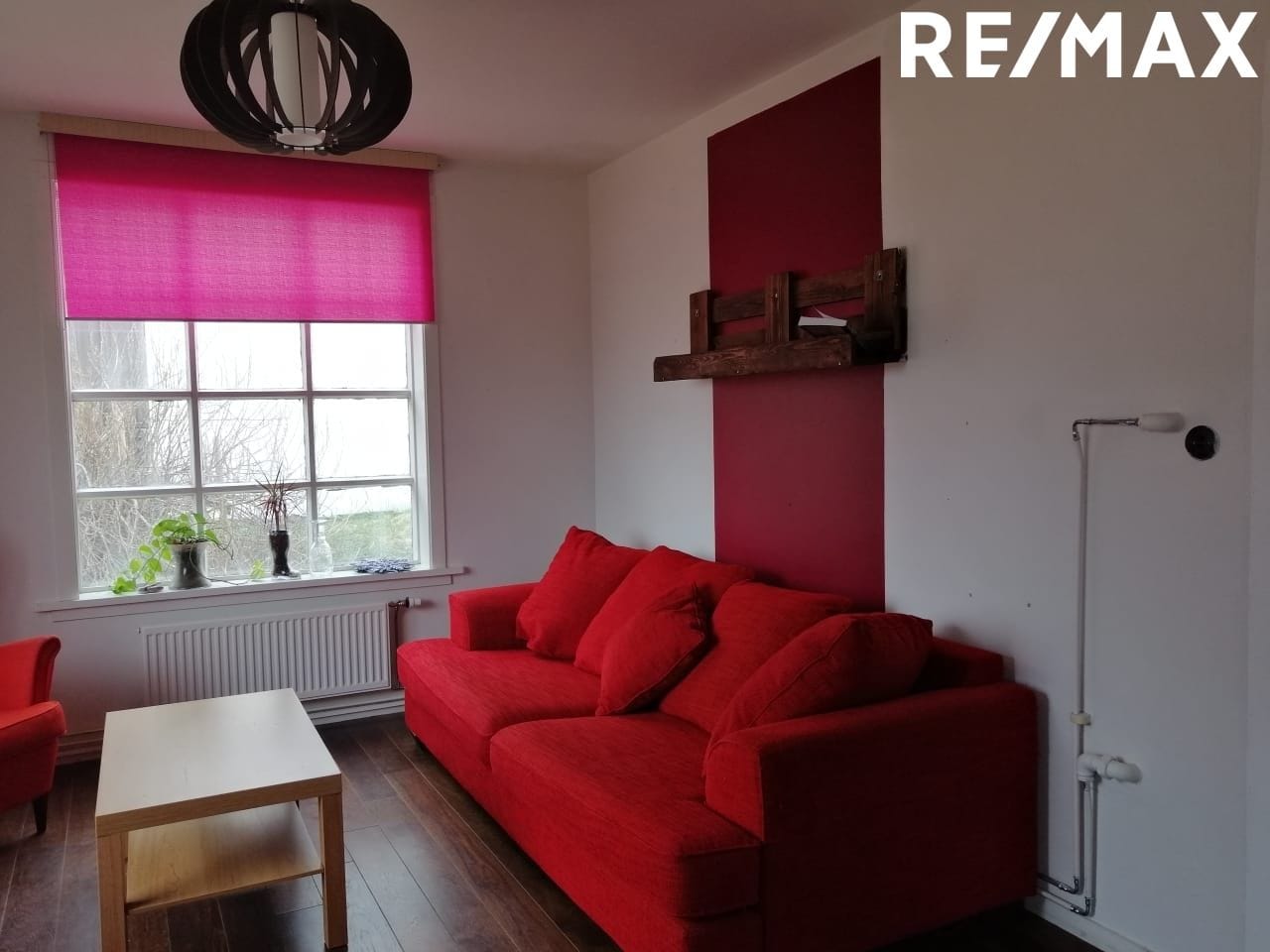 Eldhús - Nýleg eldhúsinnrétting frá 2020 með rauðum háglans skápum og ljósri borðplötu. Keramikhelluborð og ofn innbyggður, ásamt stálvaski. Parket á gólfi. Bjart með glugga sem veitir gott útsýni til umhverfis.