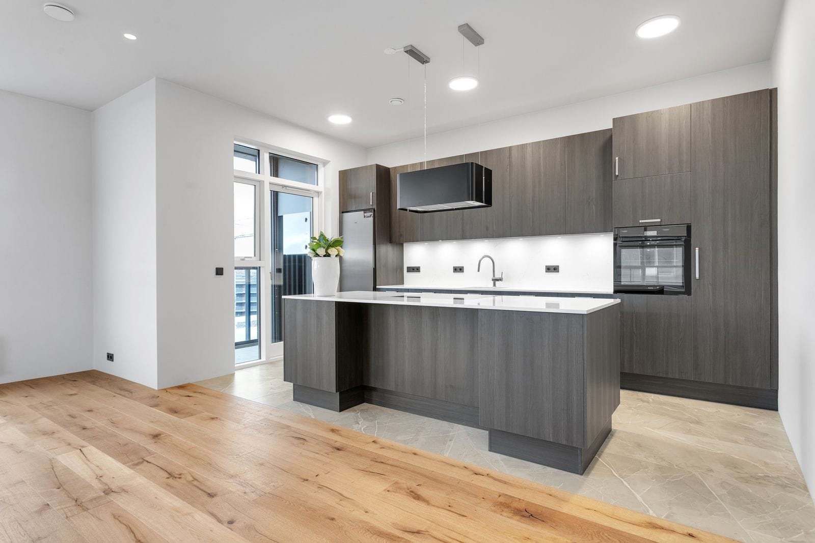 Eldhúsinnrétting er sérsmíðuð af vandaðri gerð frá Axis ásamt vaski og Grohe blöndunartækjum frá Byko. Helluborð og blástursofn eru af gerðinni AEG frá Ormsson (sjá nánar á www.ormsson.is) Gufugleypir í eldhúsi er einnig frá Ormsson.